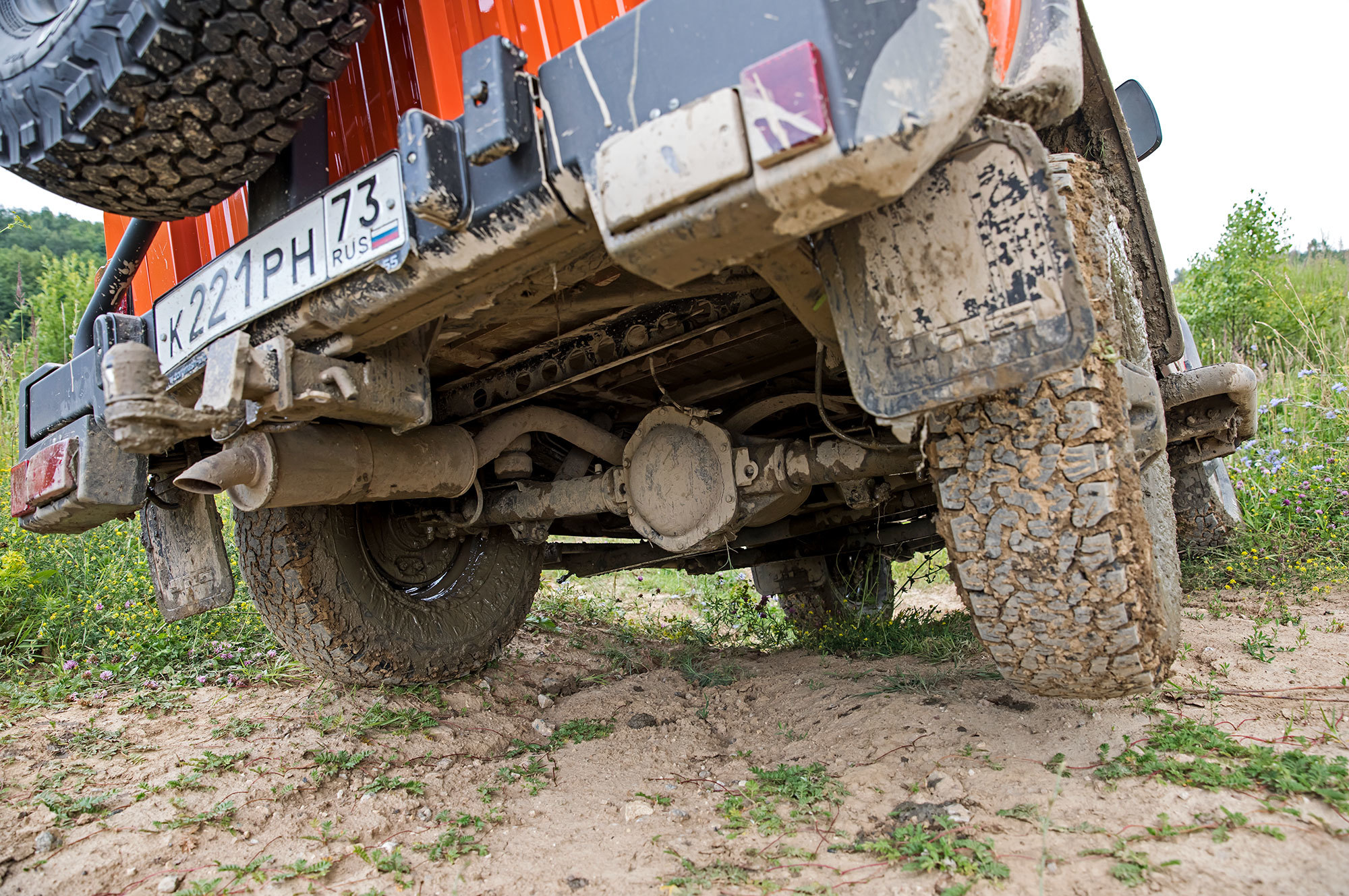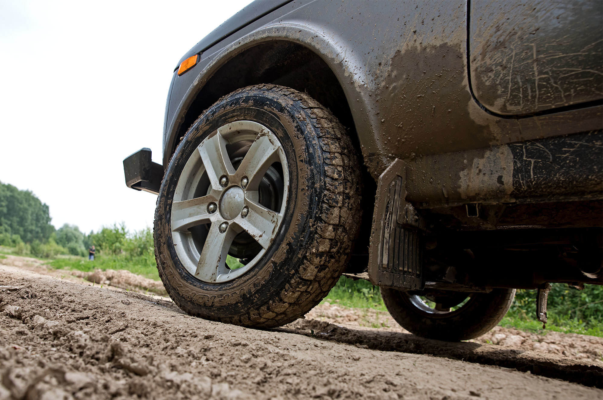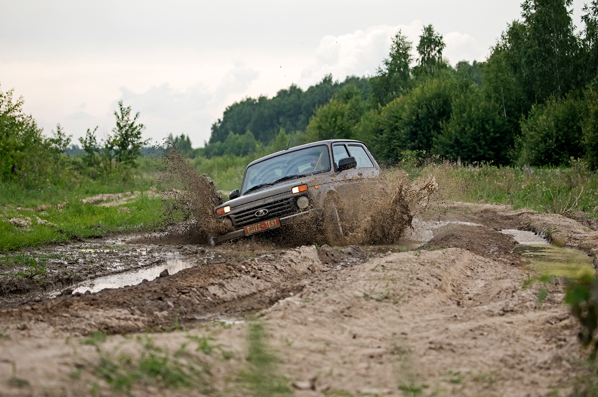 Блокировка центрального дифференциала — хорошее подспорье в грязи, но полностью реализовать жёсткую связь между осями нашей Ниве мешают штатные шины Pirelli с мелким протектором, который быстро замыливается. В итоге наиболее грубый способ преодоления препятствий полным газом на второй пониженной оказывается и самым продуктивным. Колёса очищаются, темп сохраняется, и со стороны выглядит эффектно.