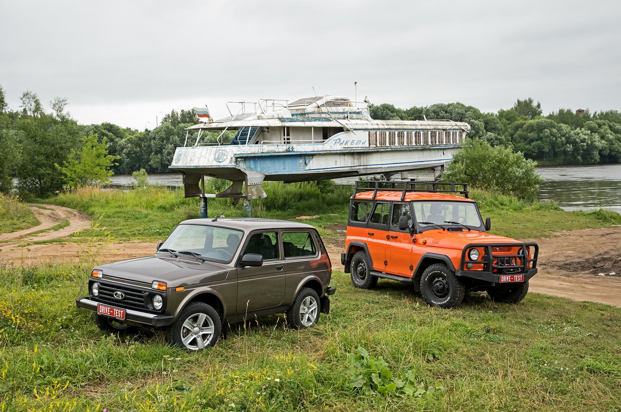 Съездили мы и на берег Москвы-реки, где около села Верхнее Мячково несколько лет назад местные энтузиасты установили памятник Ракете. Именно так, с большой буквы, потому что Ракетой называется скоростной теплоход на подводных крыльях. Первый из себе подобных и на редкость удачный ― таких было выпущено около четырёхсот. С УАЗом и Нивой его разделяют полтора десятка лет. Глядя на потомка модели 469 на фоне стремительных обводов Ракеты, сложно поверить, что это она родилась в 1957 году, а УАЗ ― в 1972-м, а не наоборот. И это мы ещё не были в пассажирском салоне с анатомическими сиденьями авиационного типа.