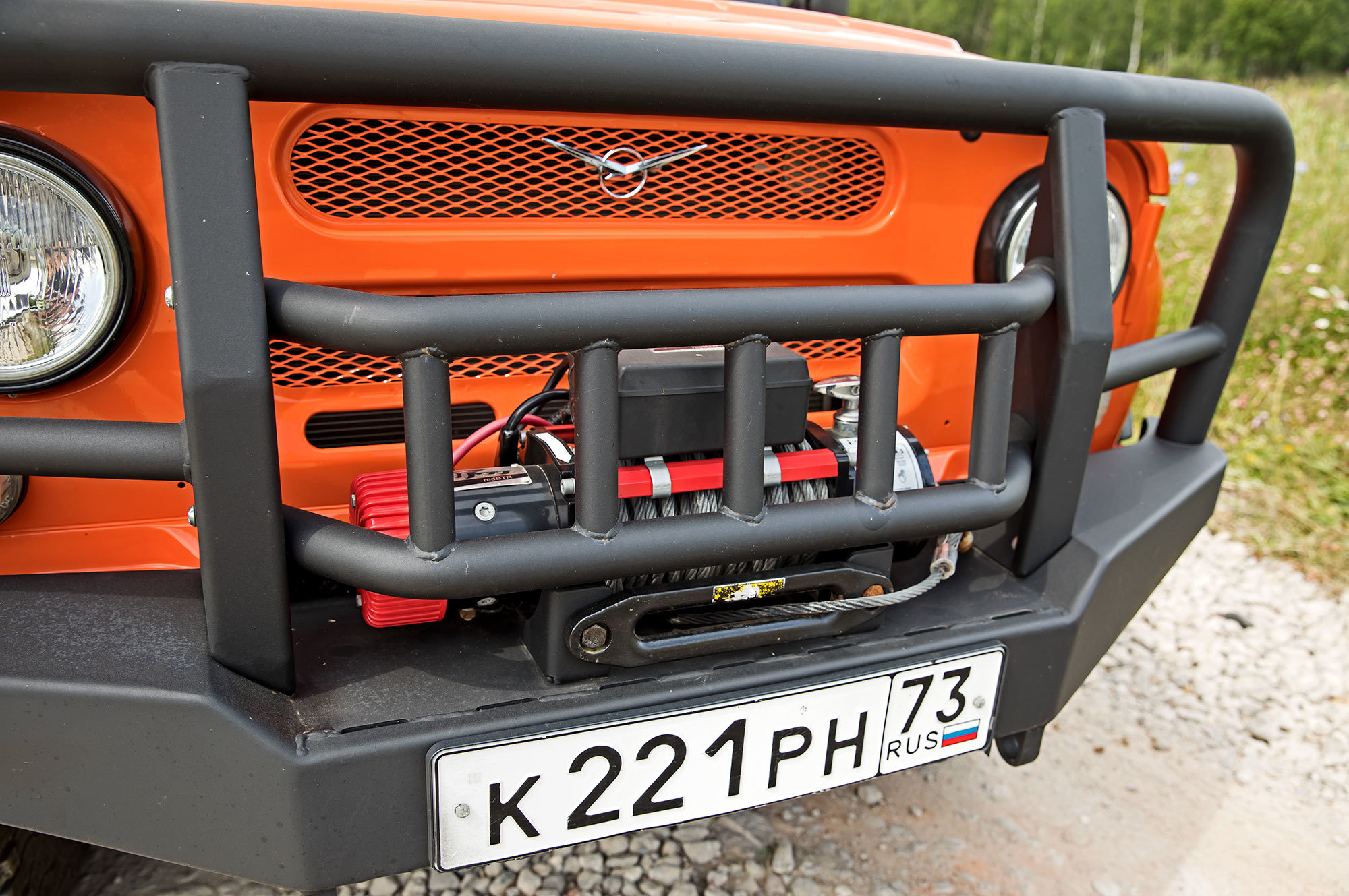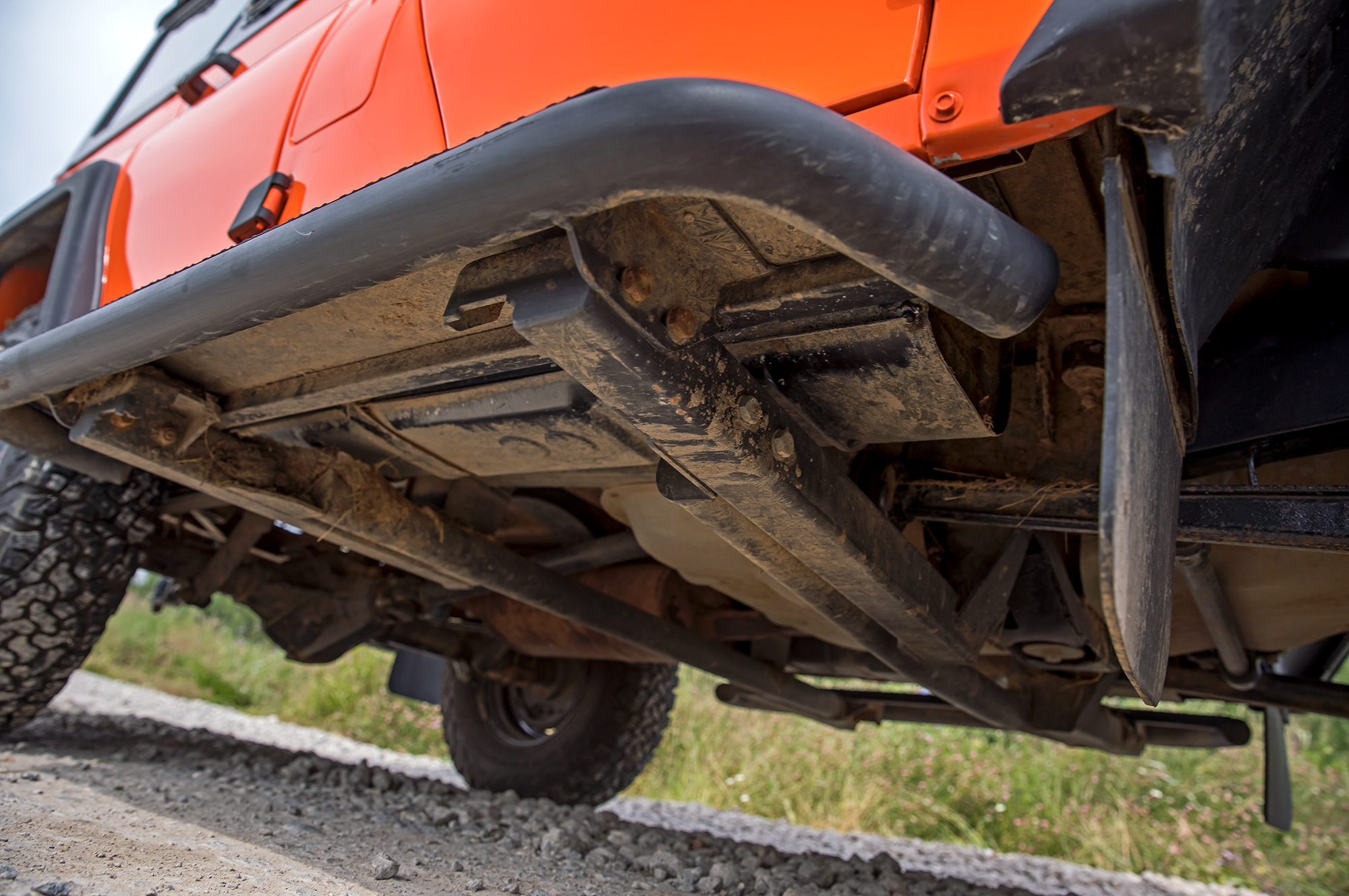 Пассы рычагом раздатки повышают тяговые возможности Хантера до паровозных. Вторая пониженная везёт везде и всегда. Третья позволяет отдохнуть мотору на равнинных участках. О полезности силового обвеса из стали готов поспорить. Да, мощным кенгурином легко прорубить просеку через подлесок, а на широкие подножки встанут четверо и помогут раскачать севшую на мосты машину. Но в глубокой колее крепления цепляются за грунт, сбивая ход. Клыкастая защита переднего моста усложняет движение задним ходом. Наконец, железяки добавляют Хантеру около двухсот килограммов.