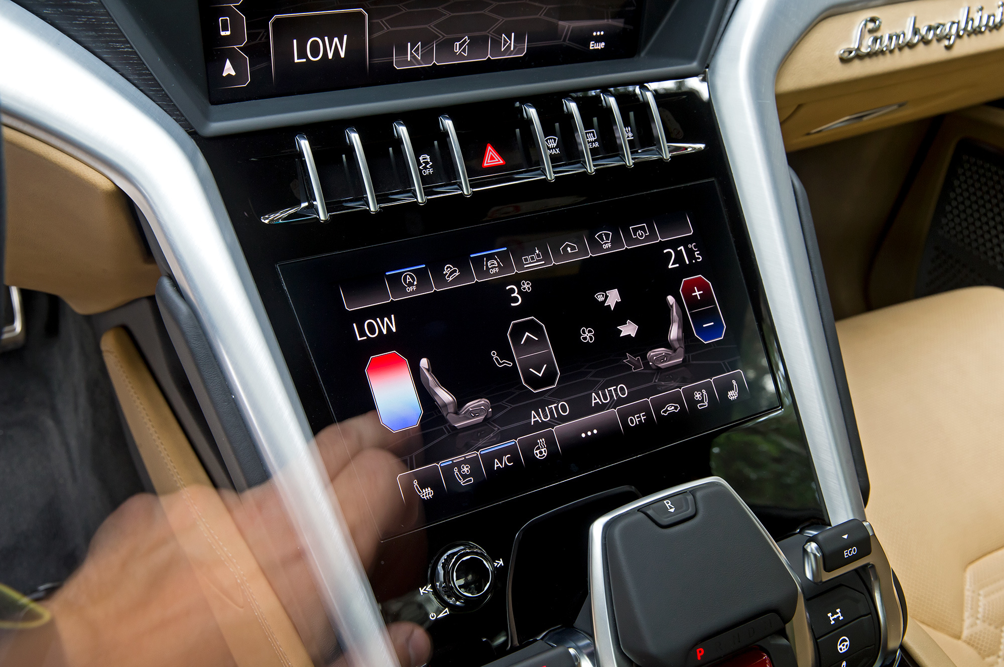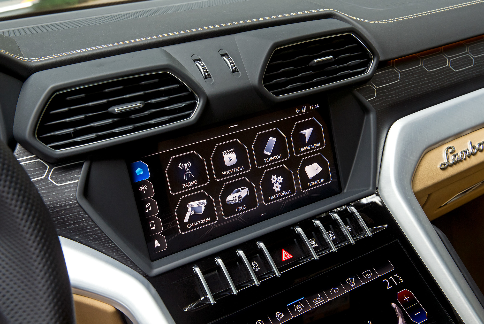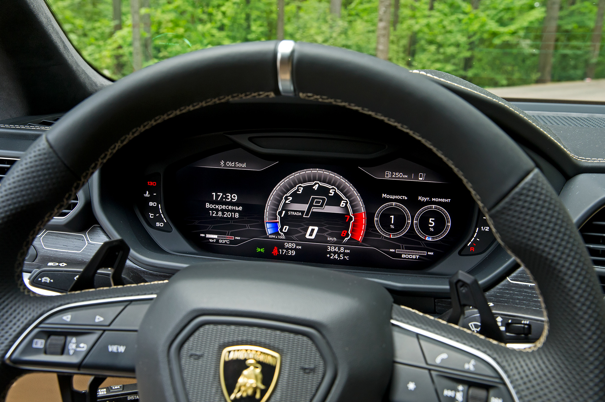 На цифровой приборной панели — знакомая по Уракану мельтешня. Условно наглядная, условно информативная. Данных как бы много, но польза от них невелика, как, например, от непроградуированной шкалы давления наддува. К счастью, на эту белиберду можно не смотреть — хватает показаний спидометра да навигационных подсказок на лобовом стекле. А если нужно что-то проверить по внедорожной части, удобнее обратиться к центральному дисплею. В любом случае эмоции тут вызывает не антураж — они рождаются в движении. И чем разнообразнее возникающие перед Урусом задачи, тем быстрее он завоёвывает ваше расположение.