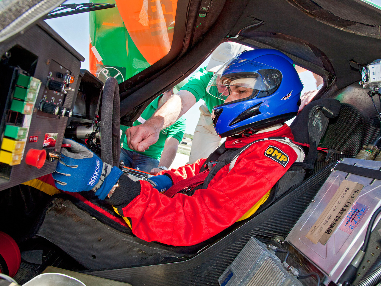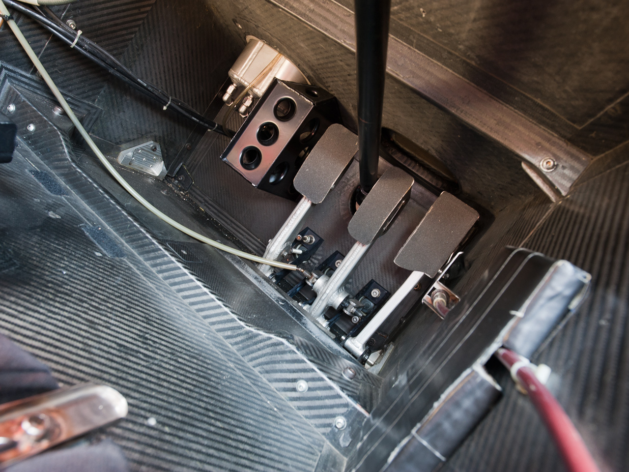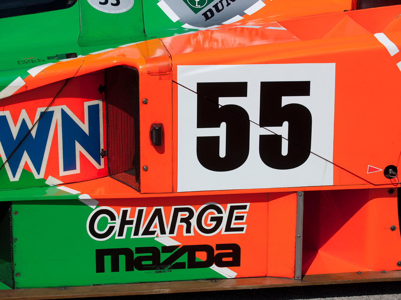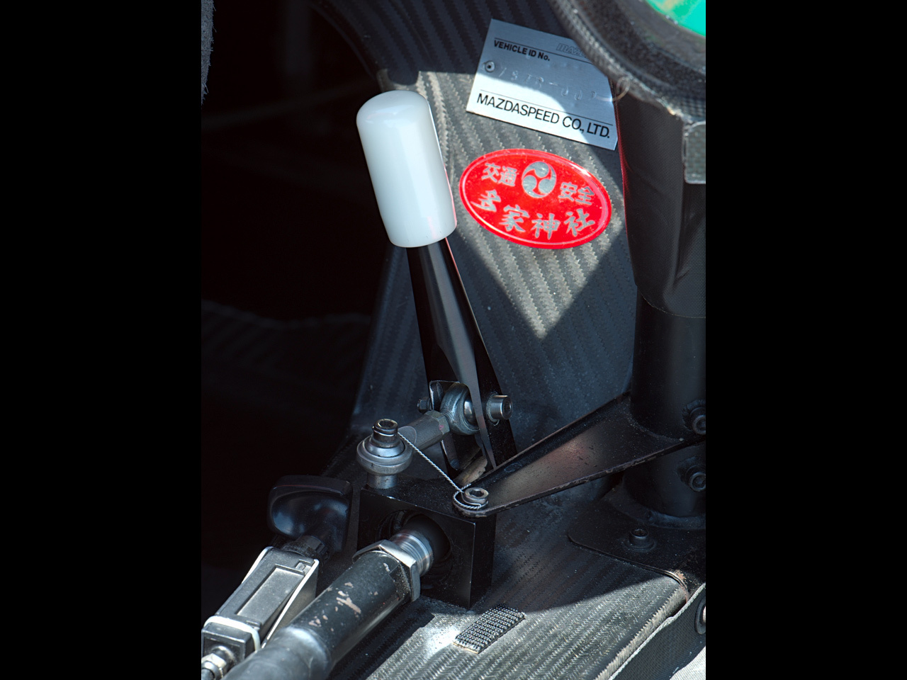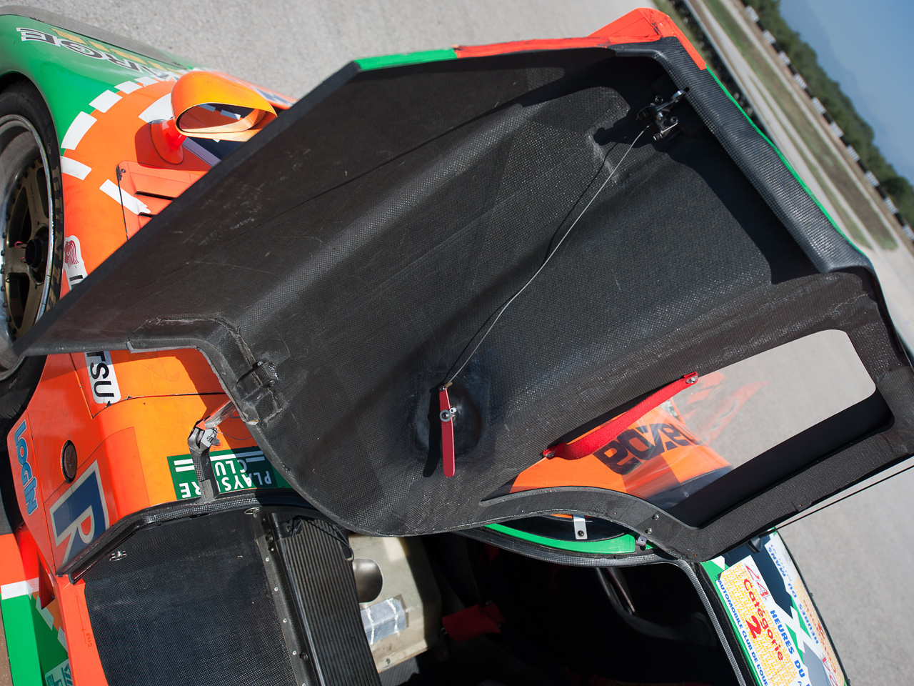 Гиперчувствительная педаль газа многообещающе длинноходна. Но как только добавляешь скорости, тяжёлый руль начинает рваться на свободу, а в следующем повороте машина подавляет тебя. Тормоза углепластиковые — причём 20-летней давности. Не как у современных Porsche 911 или Ferrari 458, когда вы почти не чувствуете разницу по сравнению с чугуном. Здесь диски работают только хорошо прогретыми. Эти композитные механизмы должны осаживать машину с 340 км/ч и держаться как минимум полгонки. Другими словами, сейчас тормозов у машины нет. И прижимной силы, которая в боевых условиях может достигать 1200 кг, нет. Поэтому Mazda поворачивает плохо: угол отклонения передних колёс мизерный, и без их эффективной загрузки болид уходит в медленных поворотах на больший радиус.