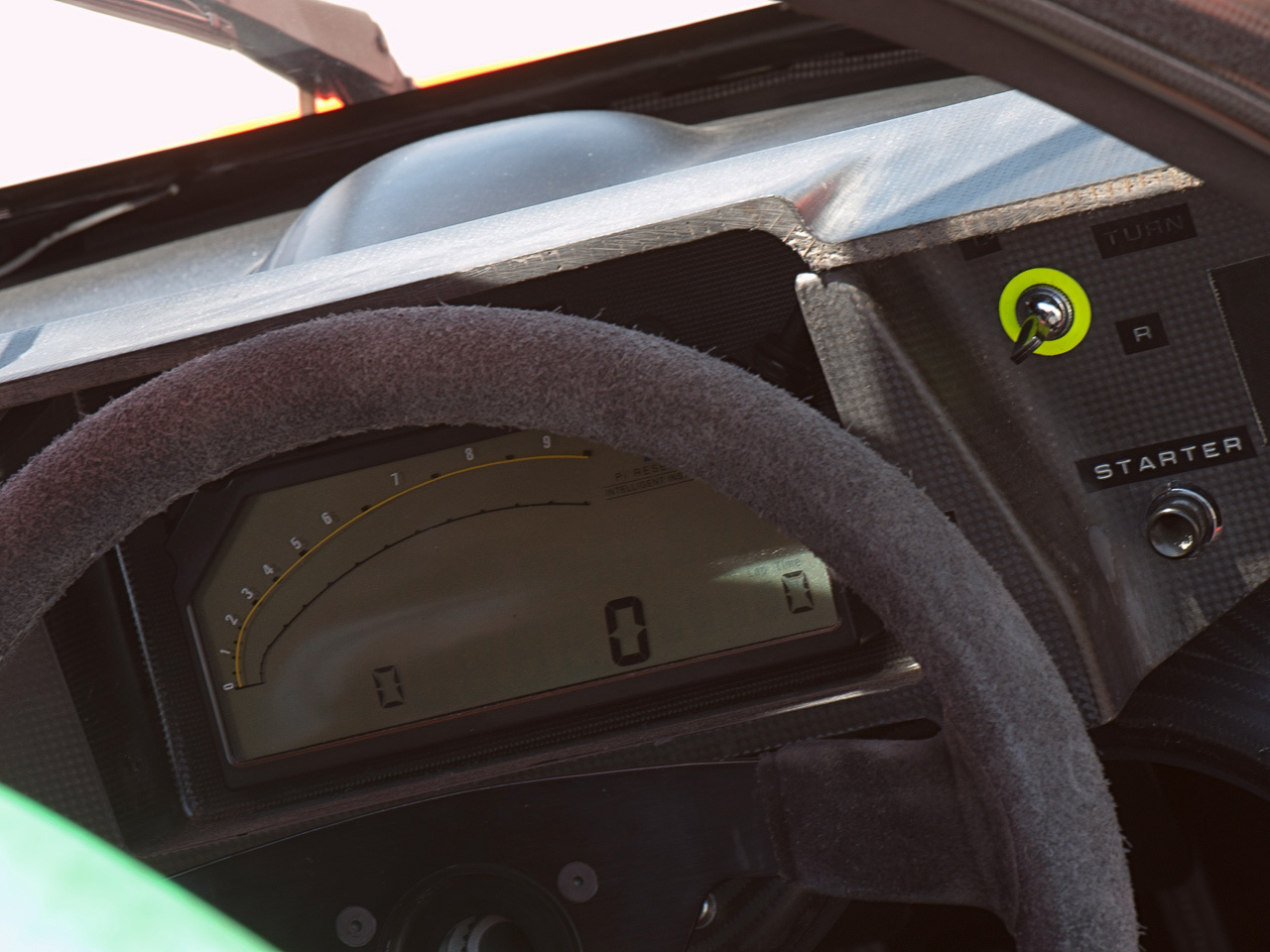 Скоростей пять, но схема переключений исковерканная: первая включается к себе, вторая — от себя, третья — тоже от себя, а четвёртая к себе... Избирательность средняя: можно запросто промахнуться между расположенными рядом передачами. Зато усилие на педали сцепления невелико. Даром что это трёхдисковая карбонокерамика — схватывает мягко, совершенно по-граждански. Педальный узел такой тесный, словно у гонщиков были не ноги, а кроличьи лапки. С непривычки сложно одновременно с тормозом не задевать акселератор, и наоборот. Но в боевых условиях так удобнее танцевать джигу с обязательными перегазовками, орудуя обеими ступнями в любых комбинациях.