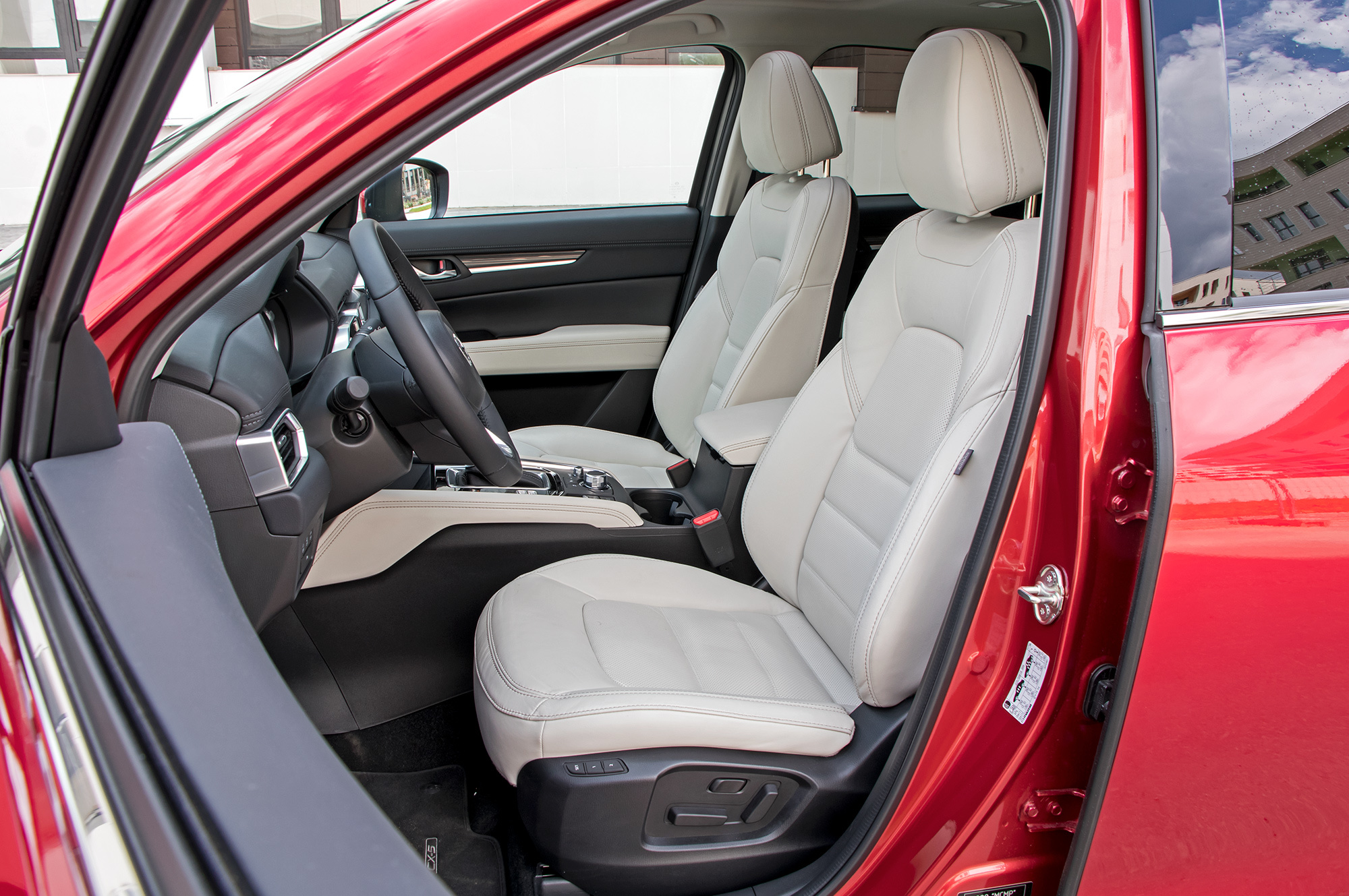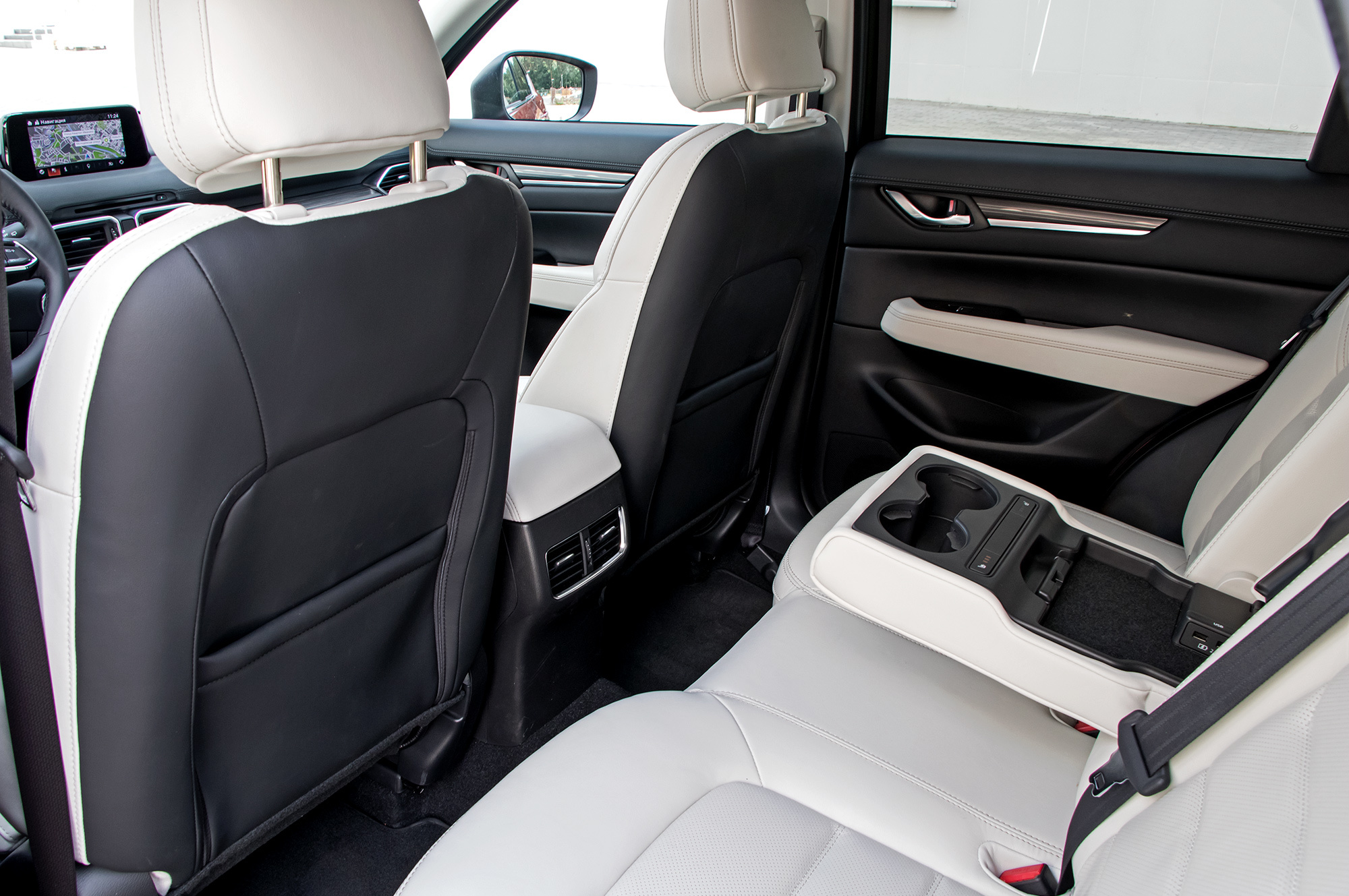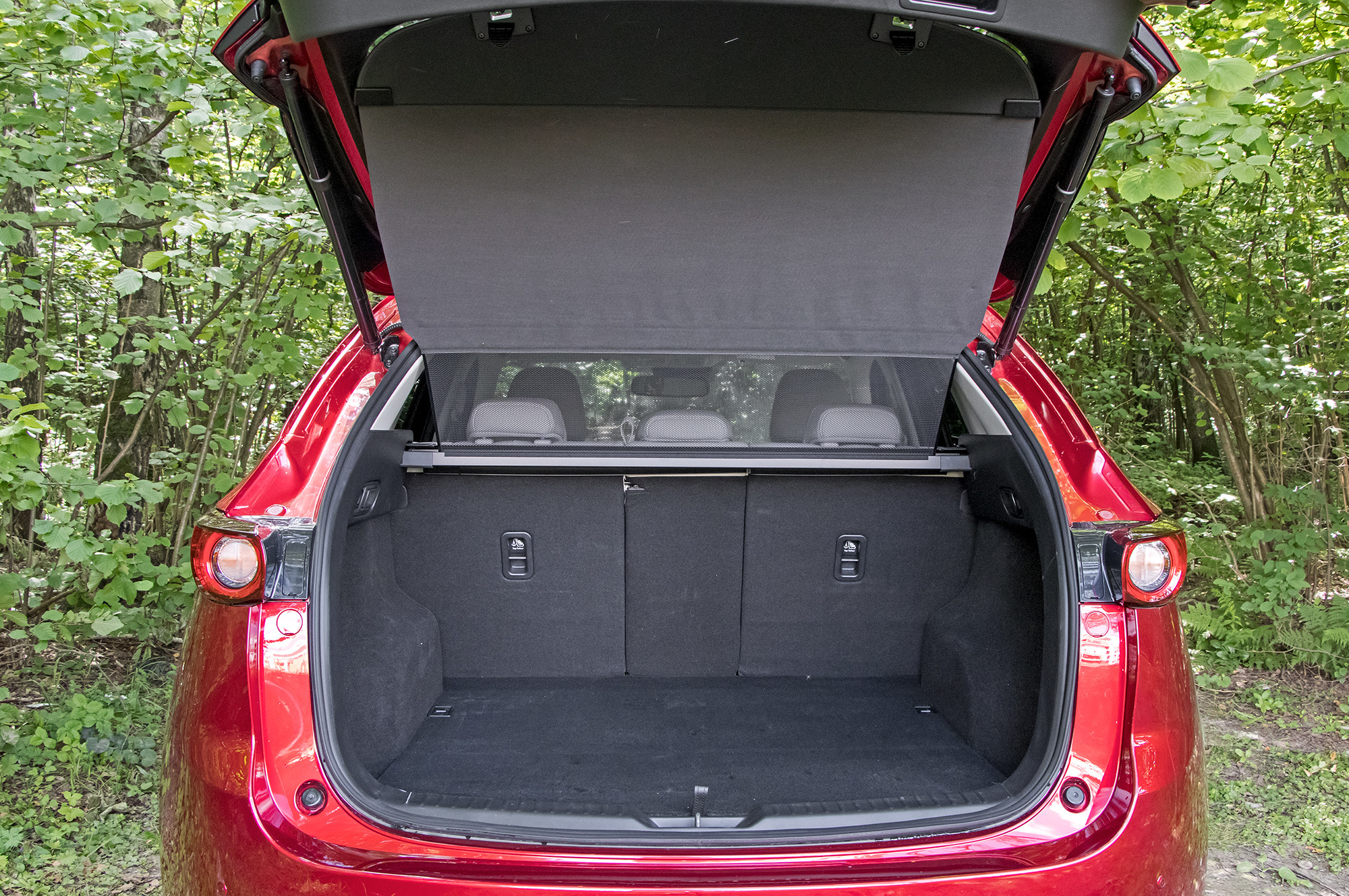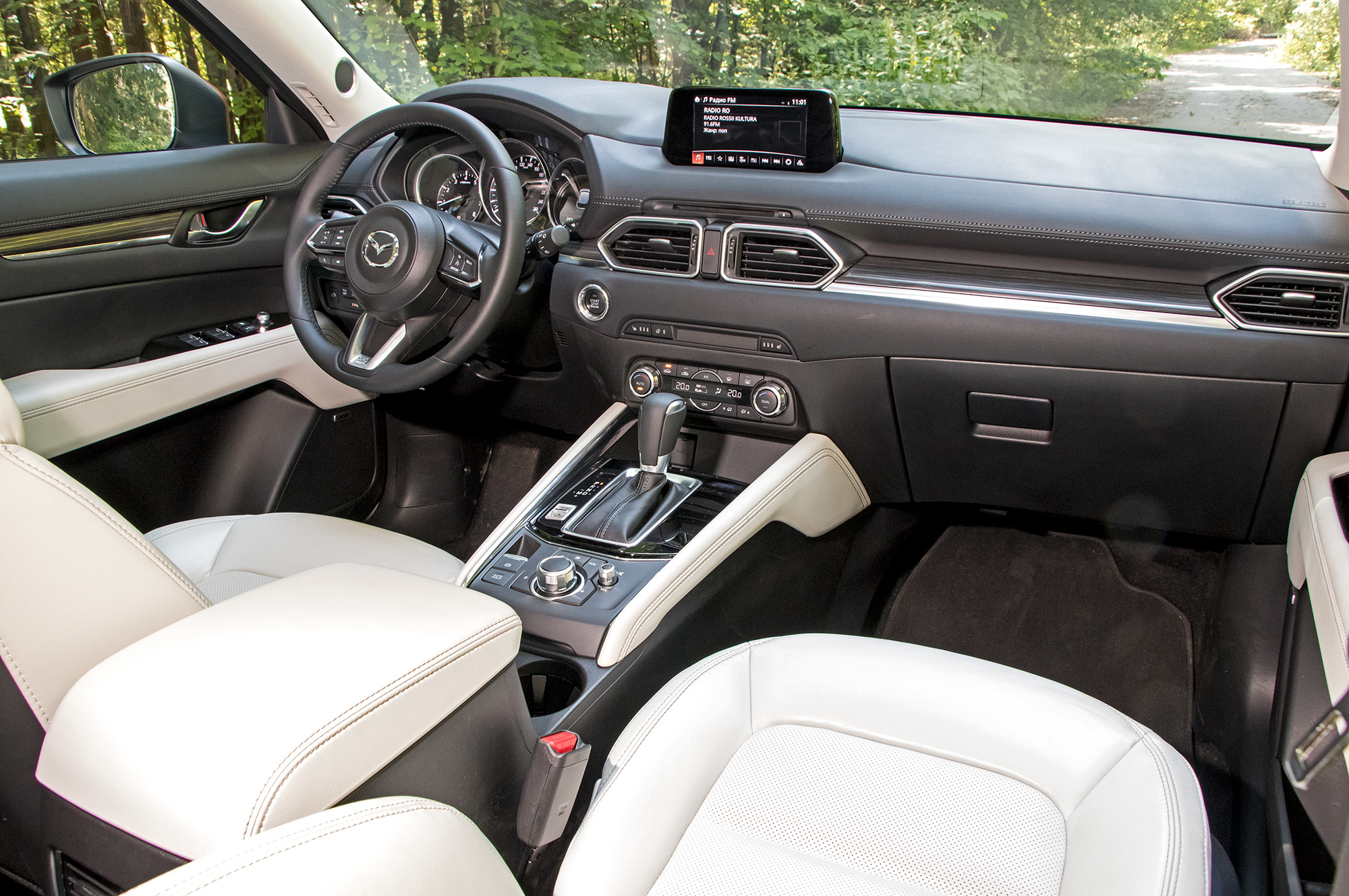 У CX-5 нет никаких внедорожных режимов или принудительной блокировки межосевой муфты. Вся надежда на внушительные 19 см просвета, которые я намерил от земли до пластикового брызговика силового агрегата. Адаптация для России на средненьком уровне: на лобовом стекле подогреваются только места парковки стеклоочистителей и зона вдоль левой стойки (там может намерзать снег, счищенный щёткой стеклоочистителя с водительской стороны), а у баранки ― лишь места хвата. Под полом багажника ― безальтернативная докатка. Впрочем, спасибо за полный подогрев двух задних сидений, пусть даже выключатели бестолково расположены внутри центрального подлокотника.