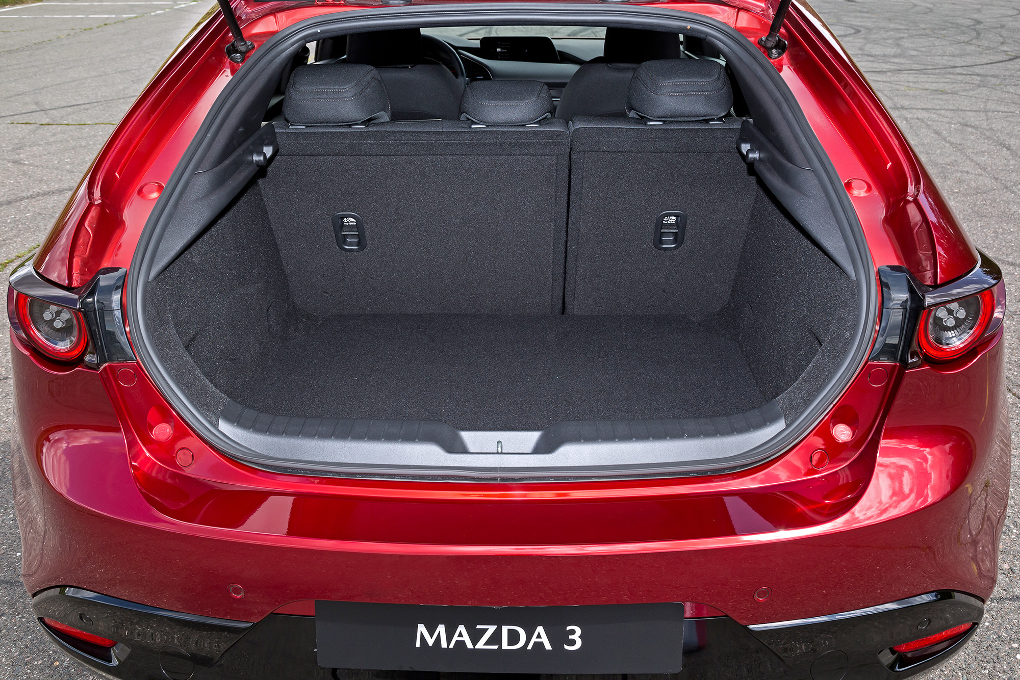 Багажник скромен и отделкой, и объёмом. Именно с него начинается знакомство с хэтчбеком. Бросаю туда чемодан и машинально нажимаю кнопку блокировки центрального замка. Я принял её за клавишу электропривода пятой двери, которого у Мазды нет. Ключ в этот момент находится в салоне, двери запираются. Нет, багажник в такой ситуации не захлопнется, но попасть в машину можно, лишь откинув диван (фиксаторы расположены на спинке) и нырнув в салон к ближайшей двери.