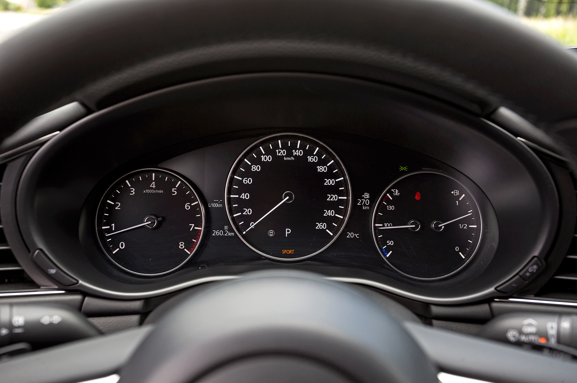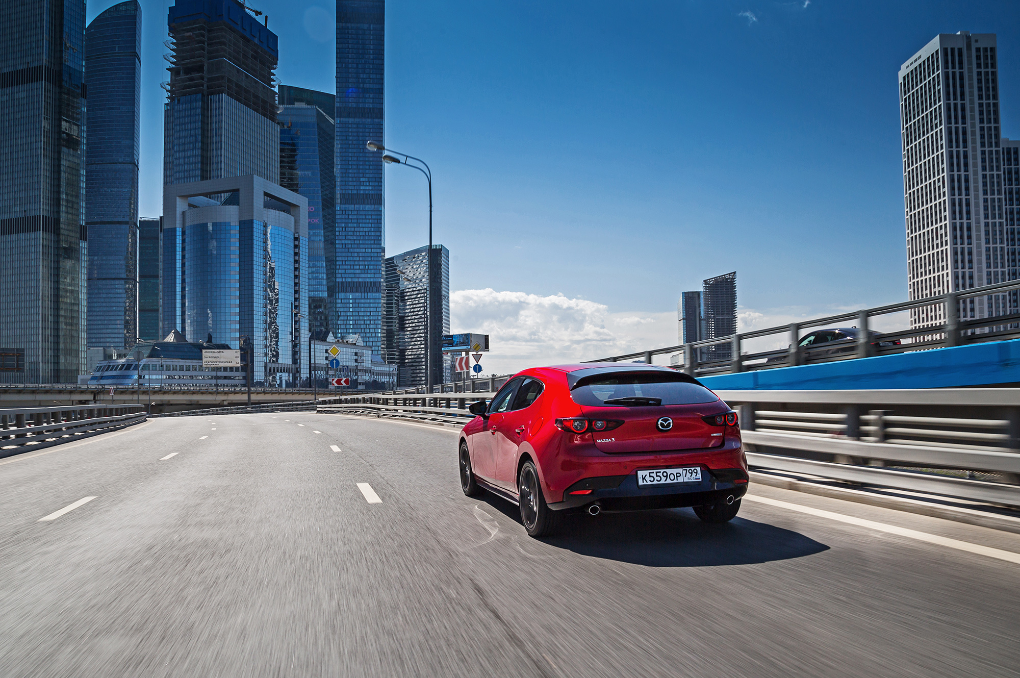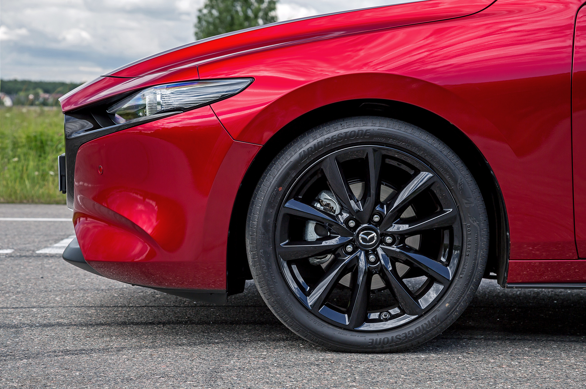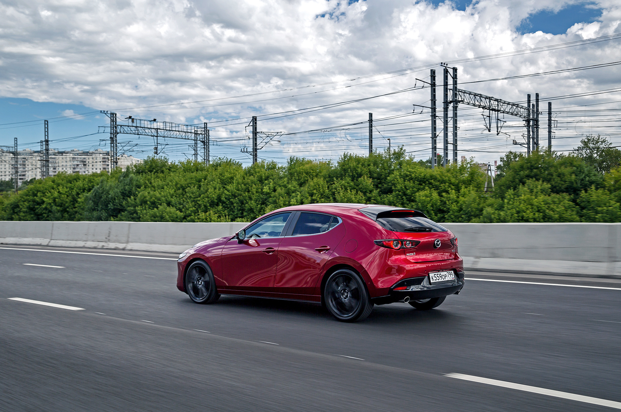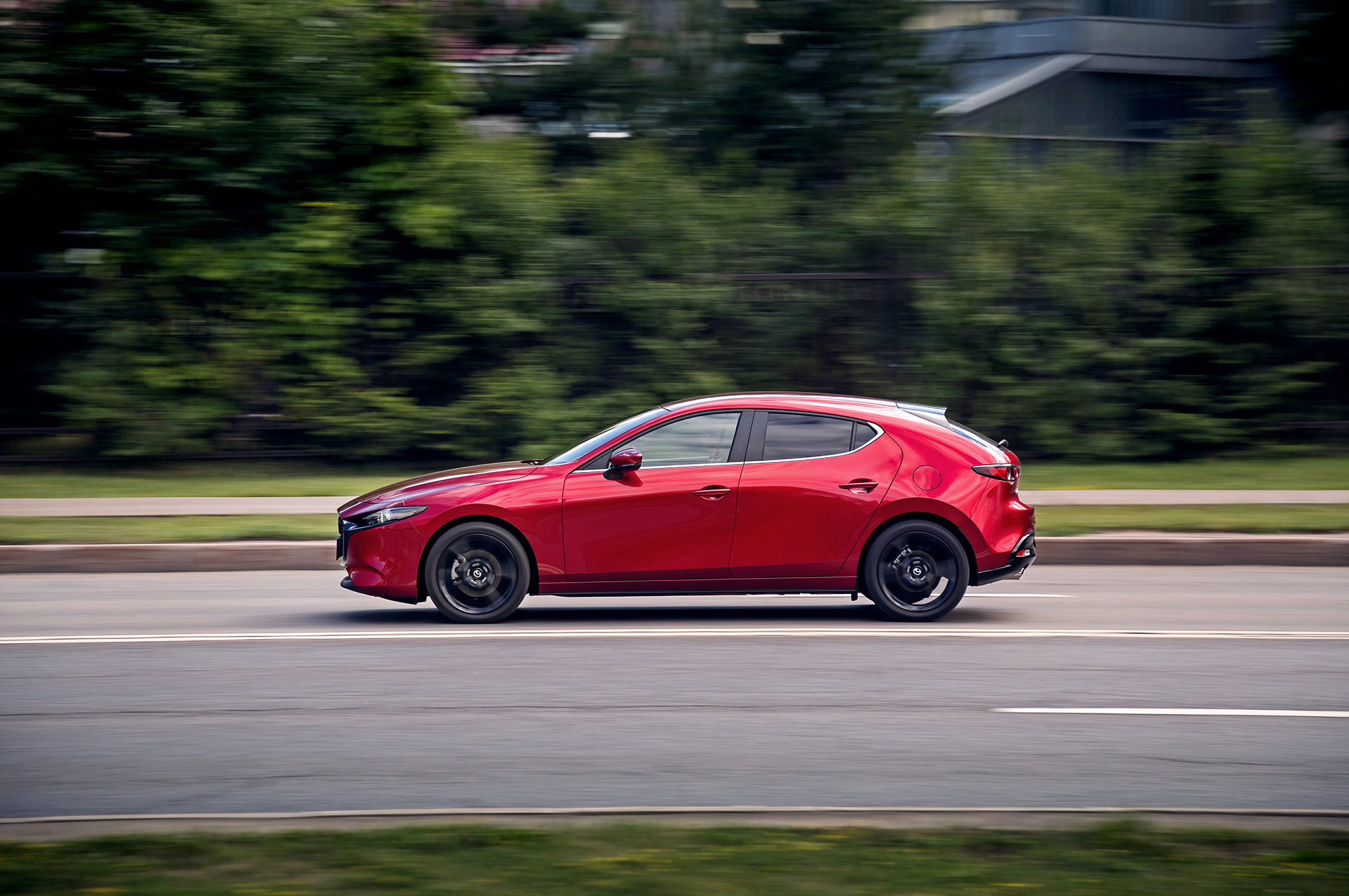 Хэтчбек собирает с дороги все неровности. Вибрация от микропрофиля слегка сглаживается, но прочие дефекты полотна с минимальной фильтрацией обильно транслируются в салон. Крупные неровности, ямки с острыми краями и поперечные стыки — это уже серьёзные препятствия. На короткой волне Mazda пританцовывает, зато среднюю и длинную волну игнорирует. Вообще, в течение всего тест-драйва меня не покидало чувство, что я еду на чём-то очень немецком со спортподвеской.