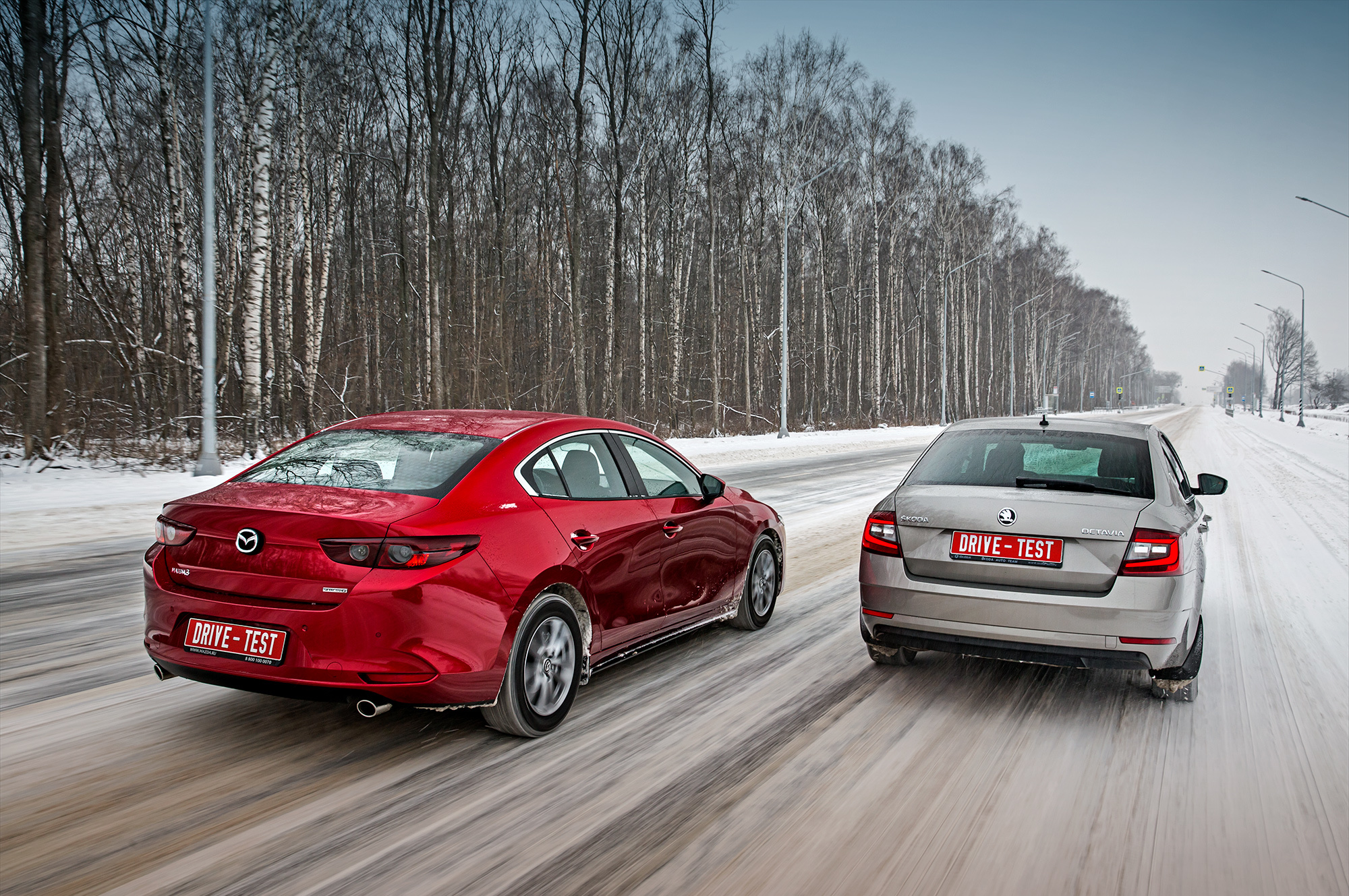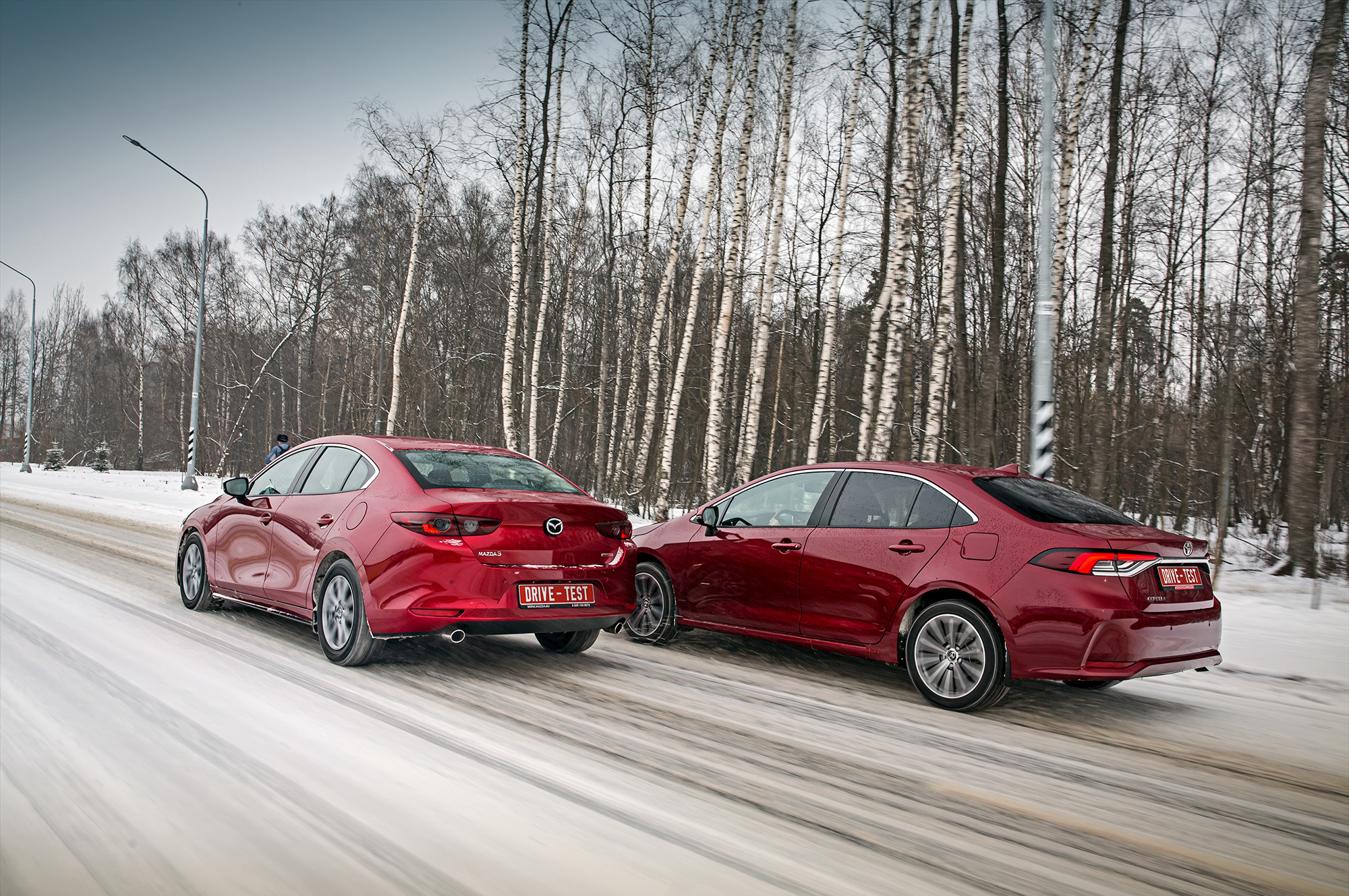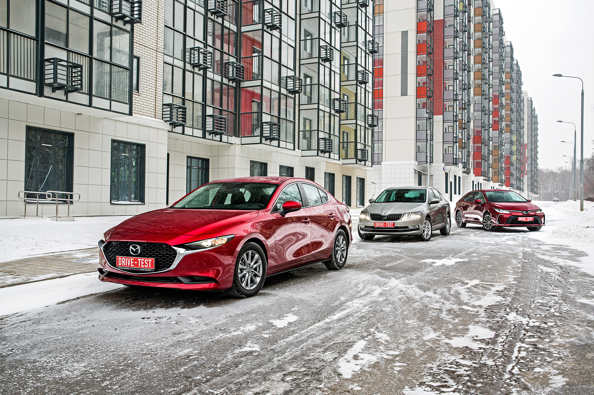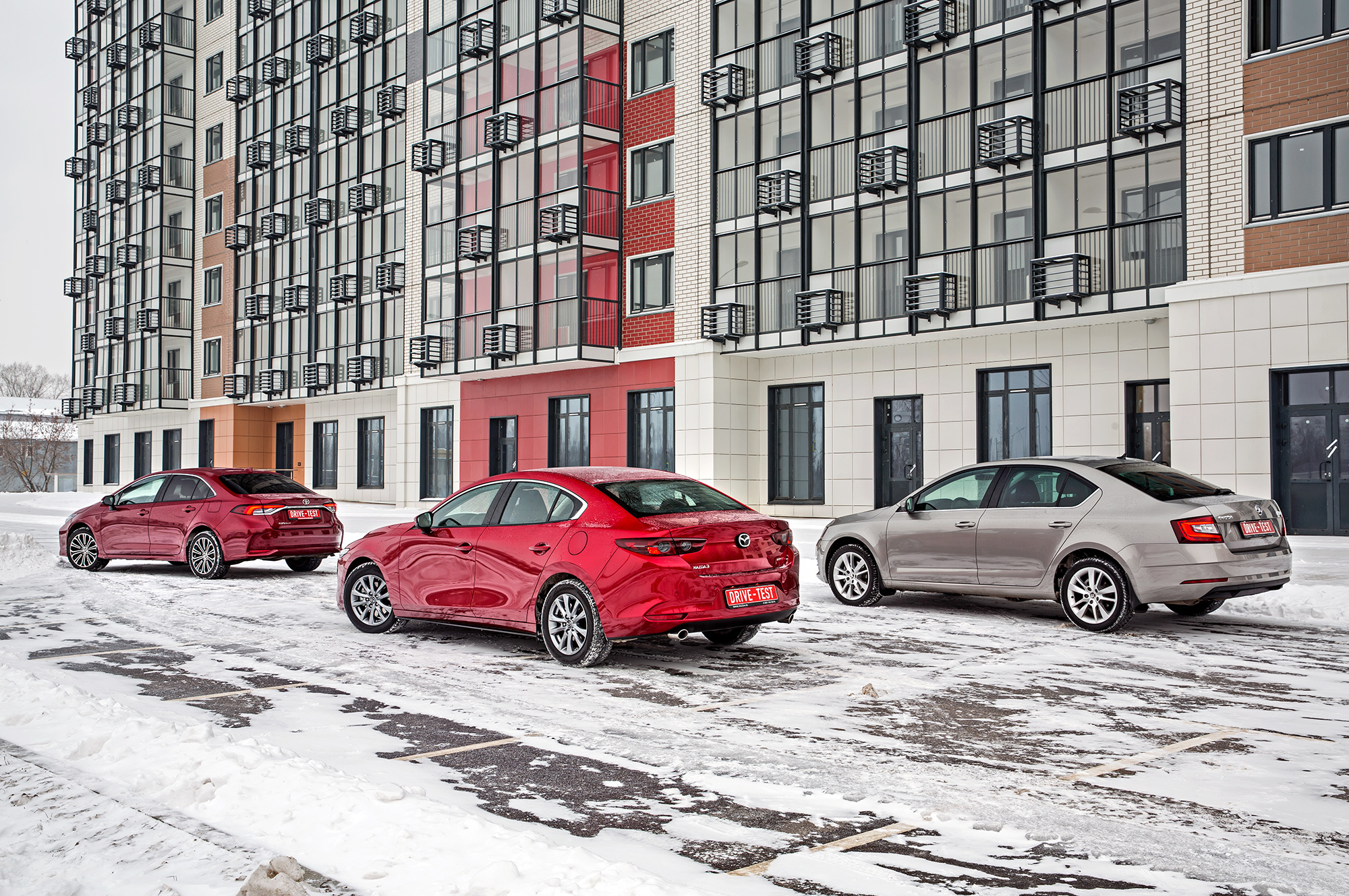 Легковушки С-класса — стали изгоями. Несмотря на успехи Октавии, сегмент усыхает существенно быстрее рынка в целом. Принимаясь за этот тест, спрашиваю себя: не в последний ли раз? Хорошо, что в гольф-классе вообще появляются новинки вроде седана Mazda 3. Хотя по статистике уже понятно, что его сертифицировали ради реализации нескольких сотен машин в год. Помимо абсолютного бестселлера в компанию к «трёшке» нами взята и победительница предыдущего теста седанов Toyota Corolla.