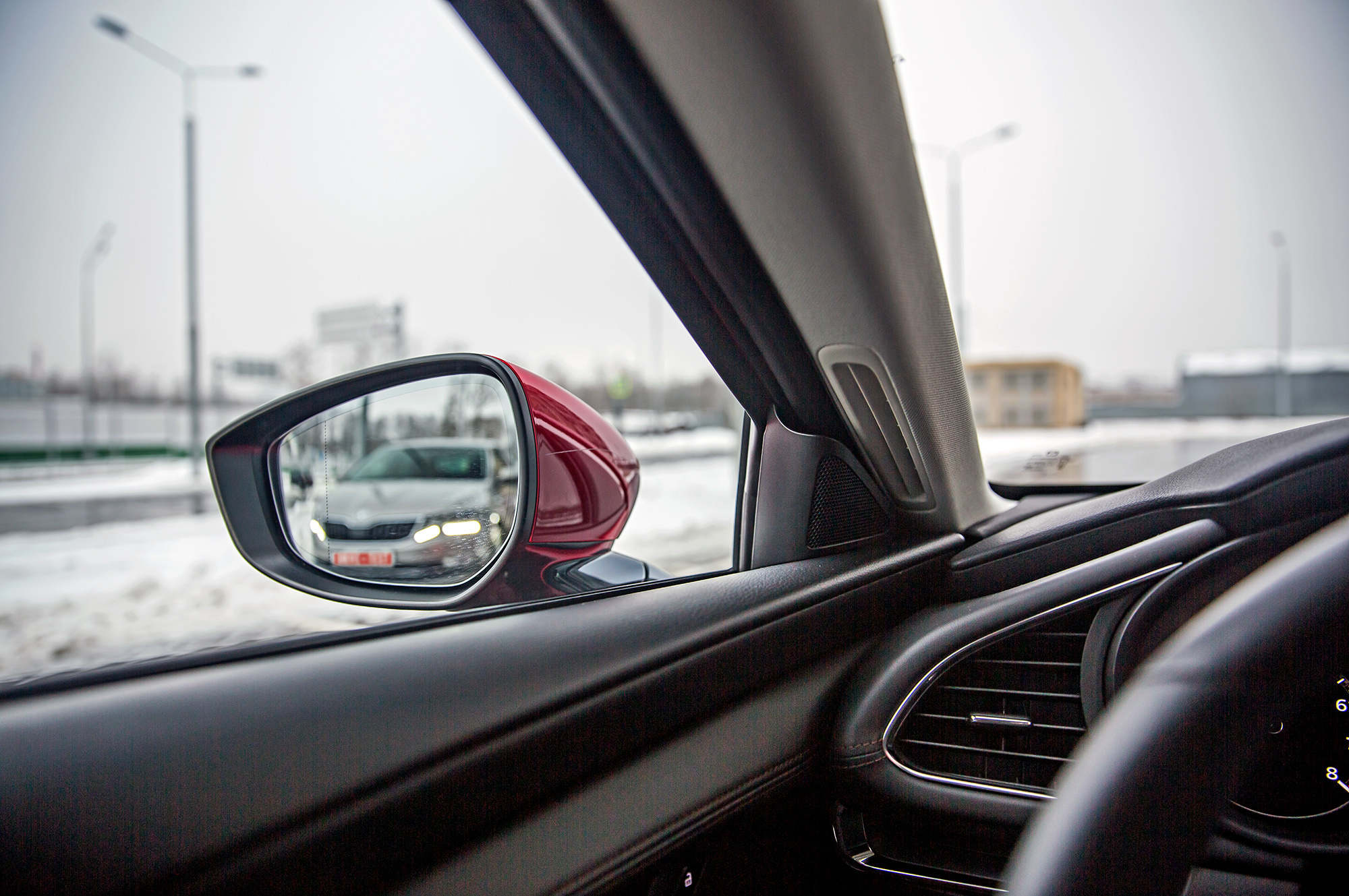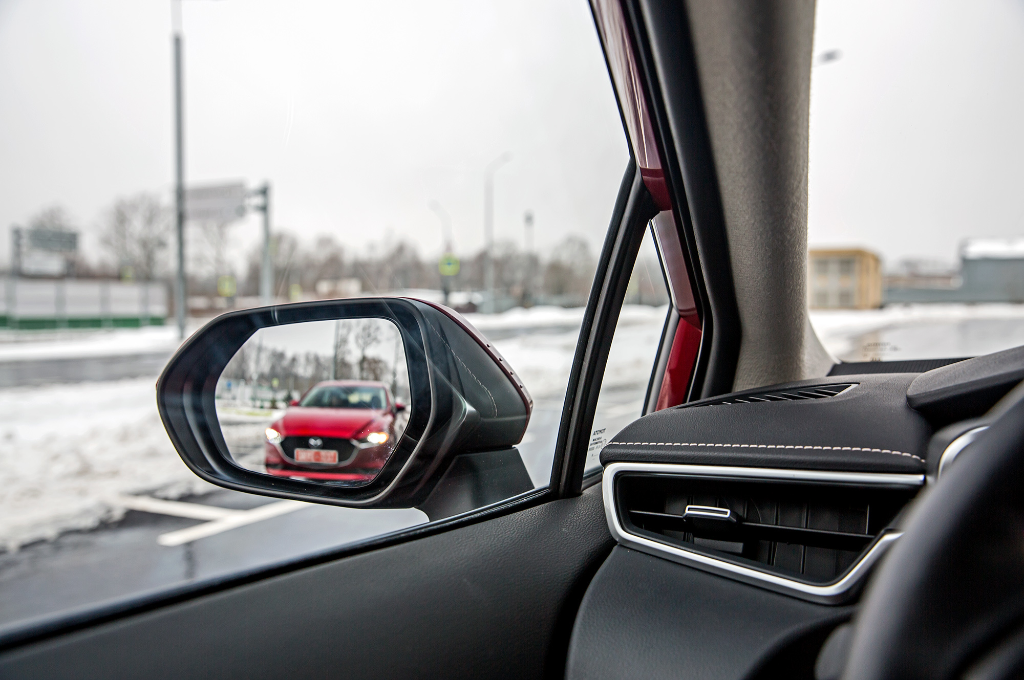 На мягковатом тойотовском сиденье располагаешься выше, а обзорность в переднем секторе чуть лучше из-за вынесенных вперёд тонких стоек. Но реальным преимуществом это бывает только при чистых окнах. В слякоть сектор очистки кажется узким из-за удалённости лобового стекла. Картину в салонном зеркале портят задние подголовники. В Мазде вид назад страдает из-за низкого стекла, а в Шкоде обзорность как обзорность.