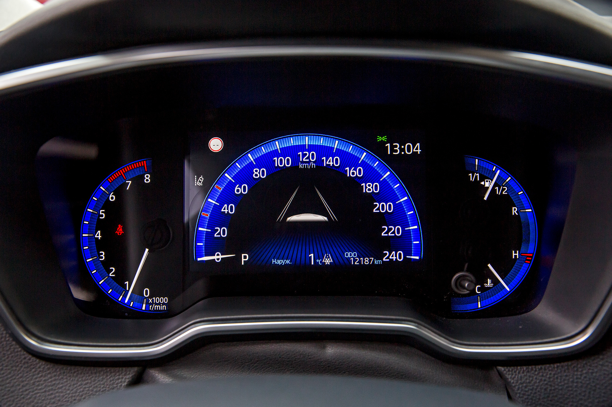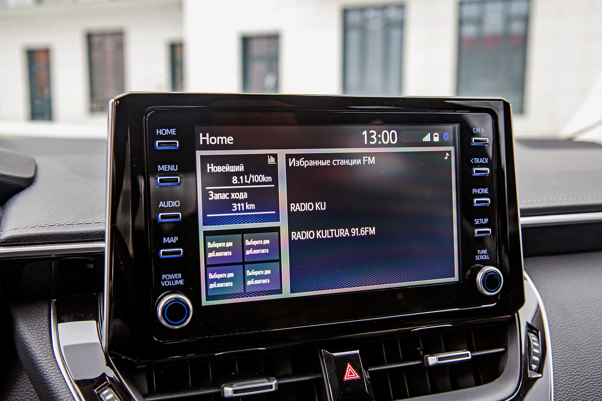 Наша ― прошлогодняя: с унылой графикой и скромной функциональностью медиасистемы. Щиток приборов напрасно вымазан синим или красным в зависимости от режима. Зато, в отличие от кроссовера RAV4, в салоне подсвечены все кнопки. Mazda и Skoda тоже не жалеют лампочек, как и стеклоподъёмников с авторежимом для всех дверей.