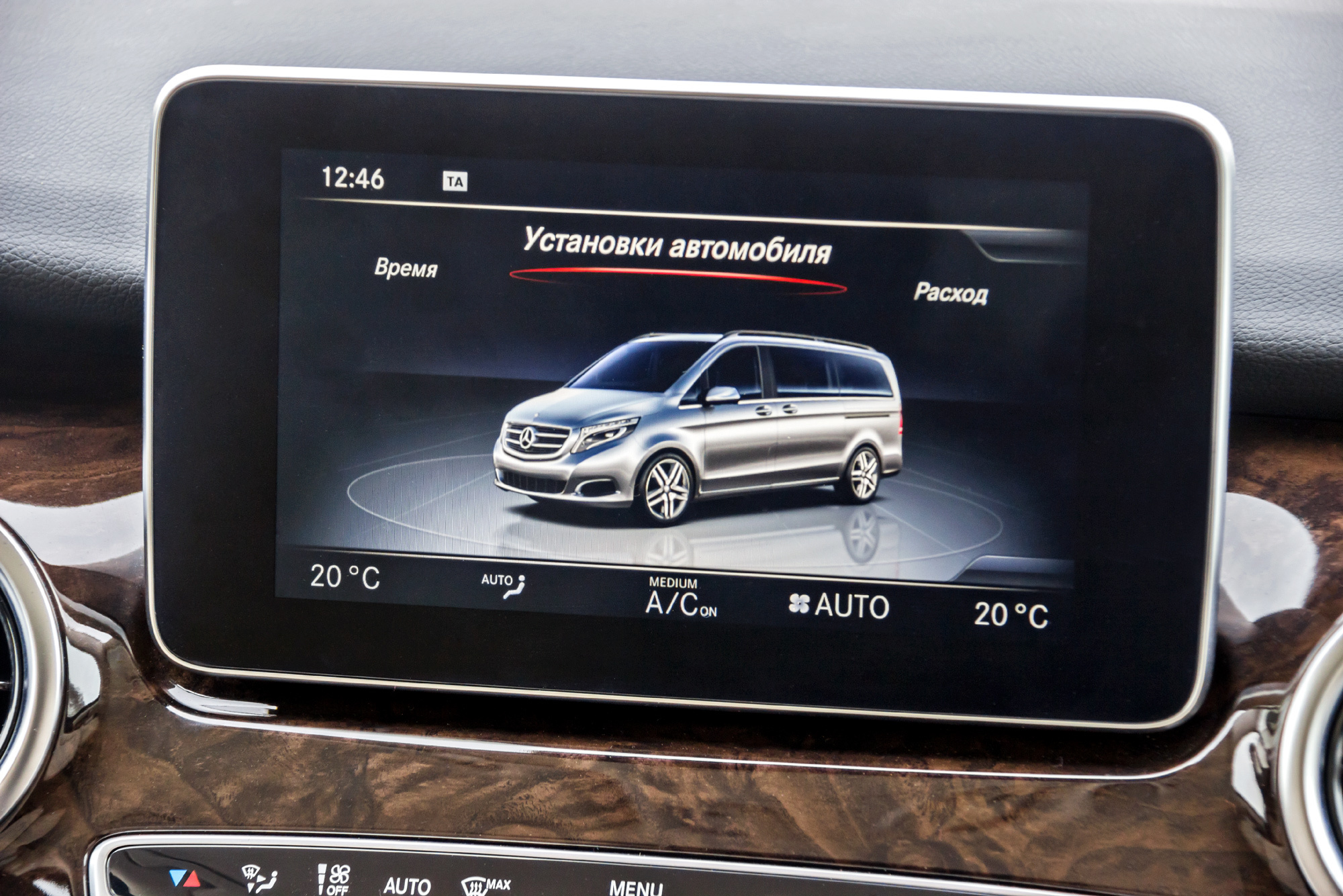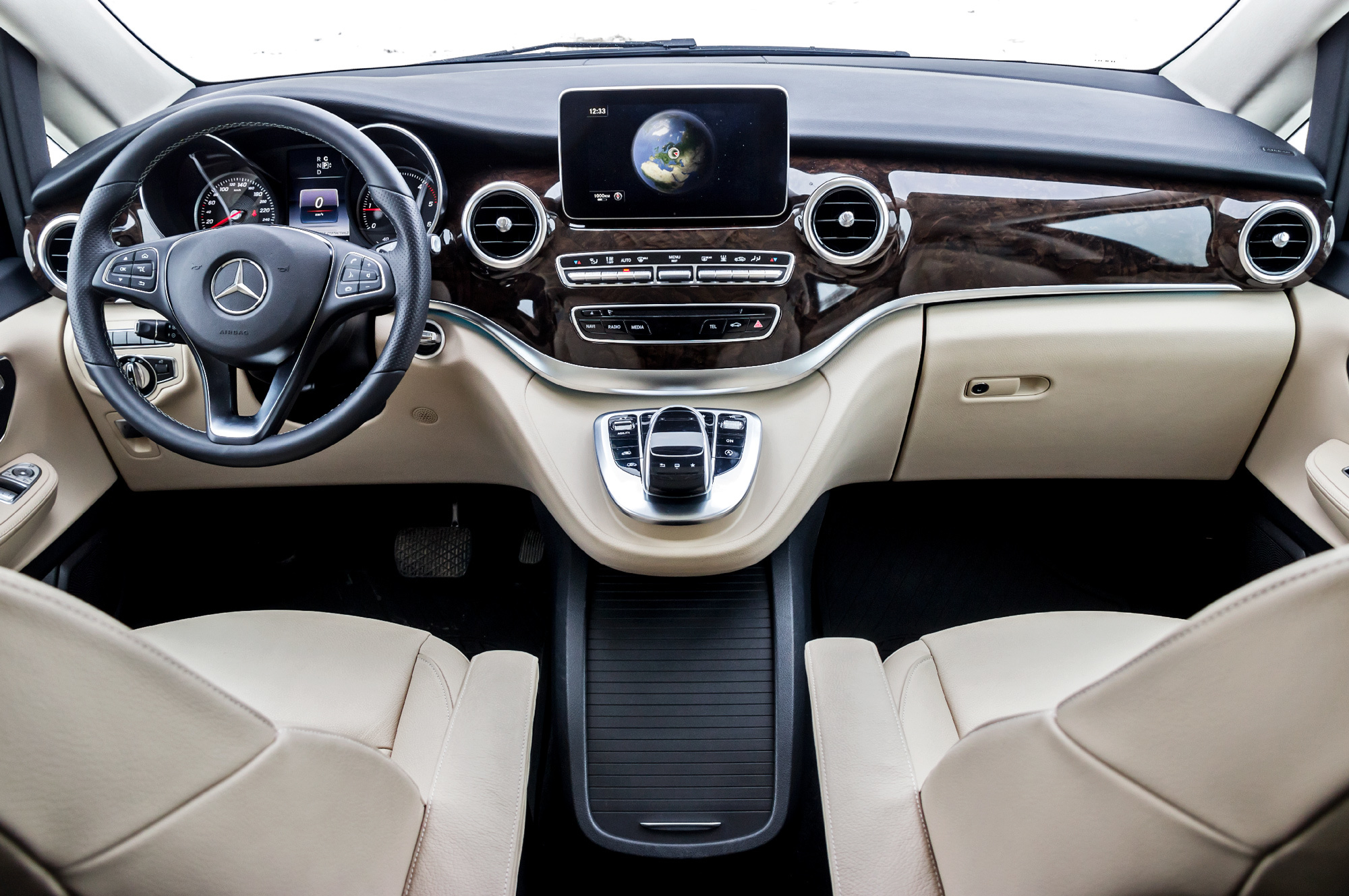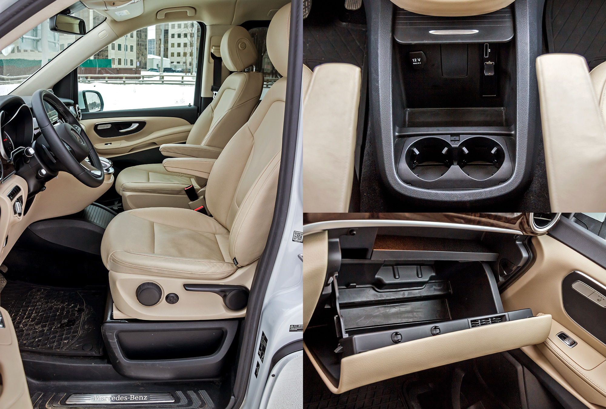 Зато процесс посадки/высадки максимально удобен. И обзорность близка к идеальной: мешают только крупные стойки лобового стекла. Передняя панель, словно позаимствованная у C-класса, пришлась ко двору. Правда, податливый пластик соседствует с пласмастмассовым «деревом». Заплатив почти двести тысяч рублей, получаешь мультимедийный комплекс Comand Online. Тут тебе и большой дисплей с шикарной графикой, и удобный контроллер с сенсорной панелью на приливе центральной консоли, и выход в Интернет. Ого! И зачем, спрашивается, это всё наёмному водителю? Скорее, такие игрушки предпочтёт «легковой» клиент. Однако ему надо как-то иначе организовывать пространство...