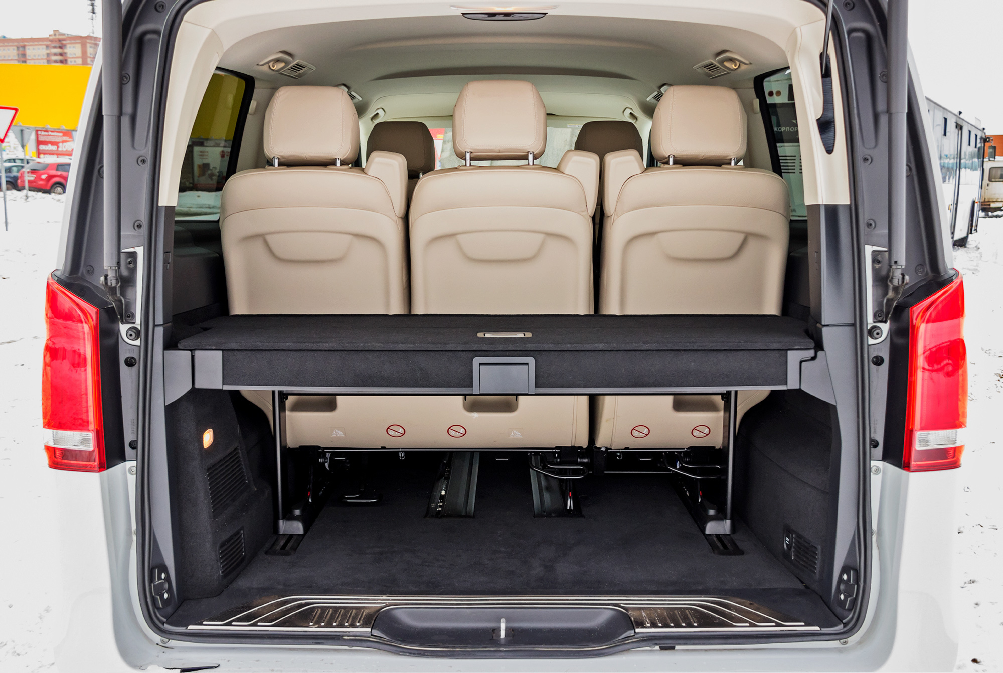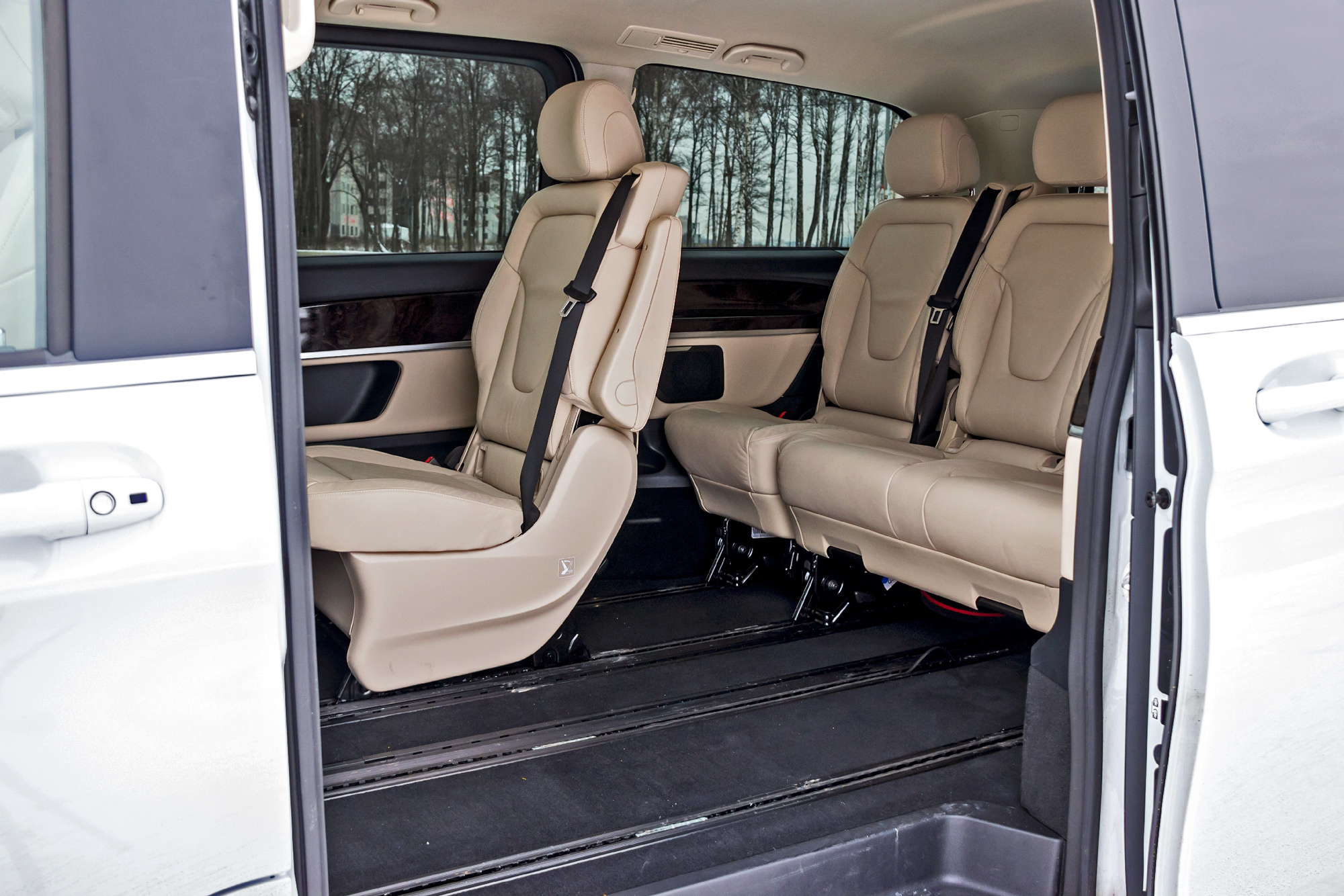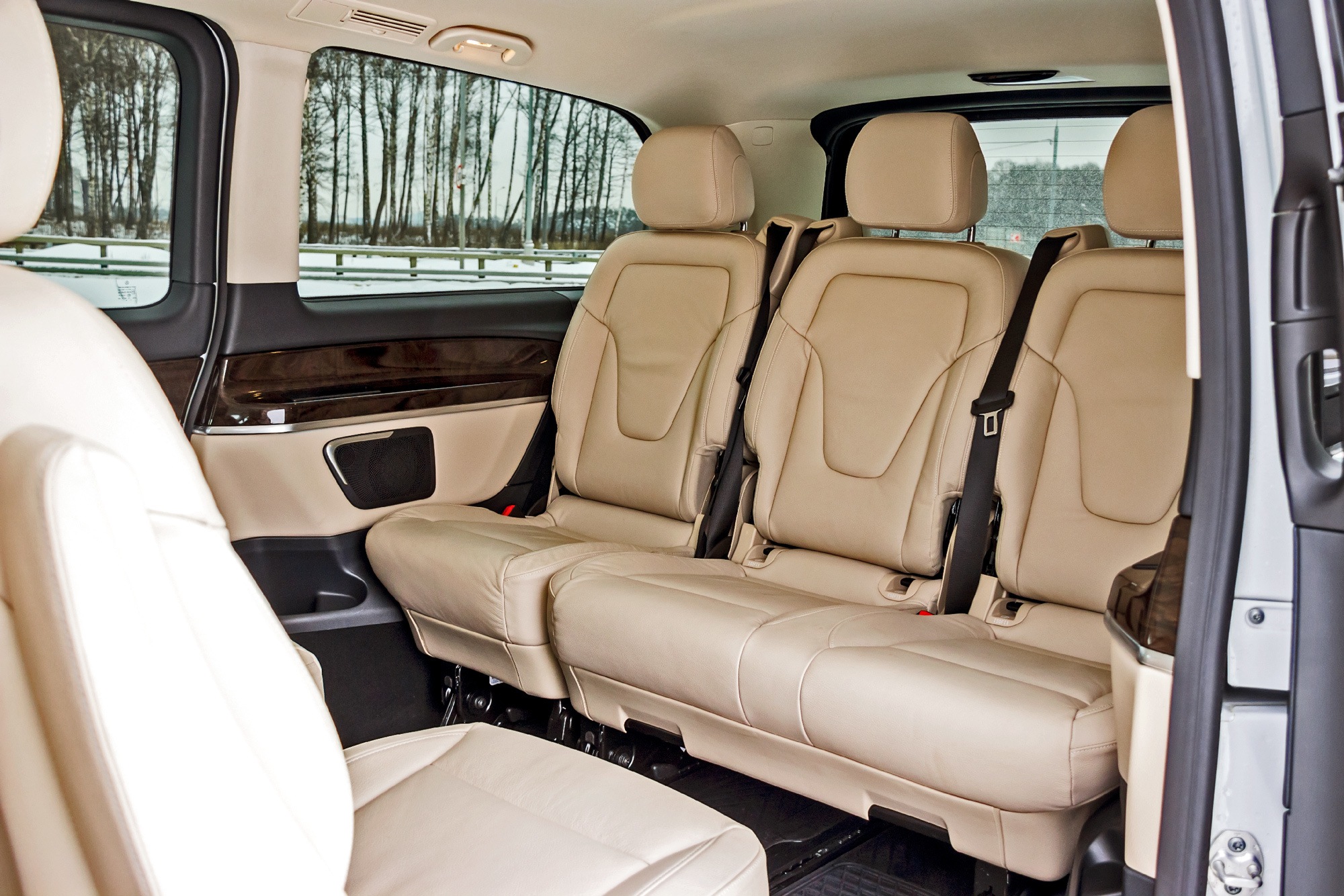 Если со статусом человека за рулём нам не удалось определиться однозначно, то пассажиры — всегда пассажиры. Для них V-класс хорош. По крайней мере в том, что касается размещения. Нам досталась версия средней длины (5140 мм) при 3200 мм базы. Изначально салон V-класса шестиместный: с четырьмя раздельными креслами в пассажирском отсеке. У нас же модификация семиместная — вместо двух задних сидений установлен трёхместный диван. У каждого места спинки регулируются по углу наклона. Посадка удобна, есть подлокотники, но жестковато: нам хотелось бы более мягкого наполнителя под кожаной обивкой.
