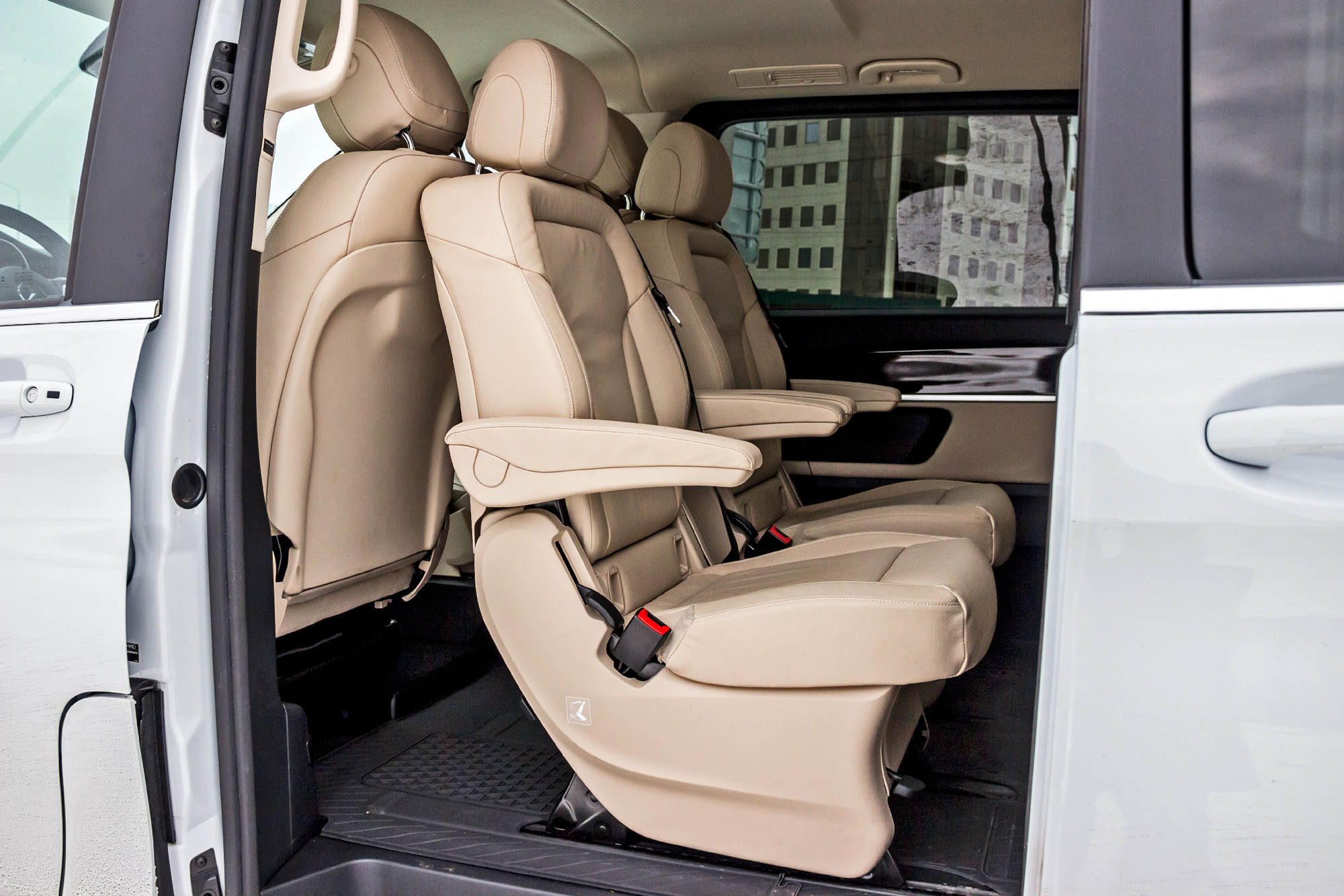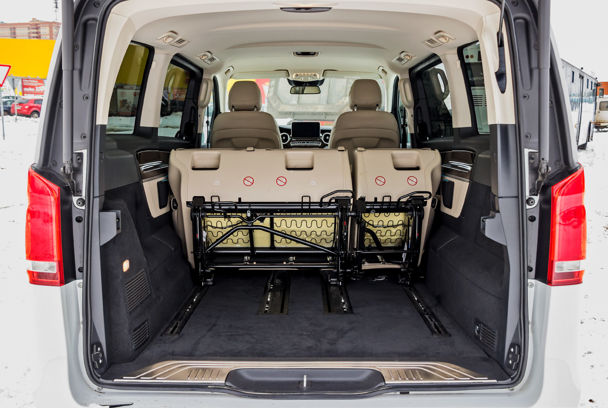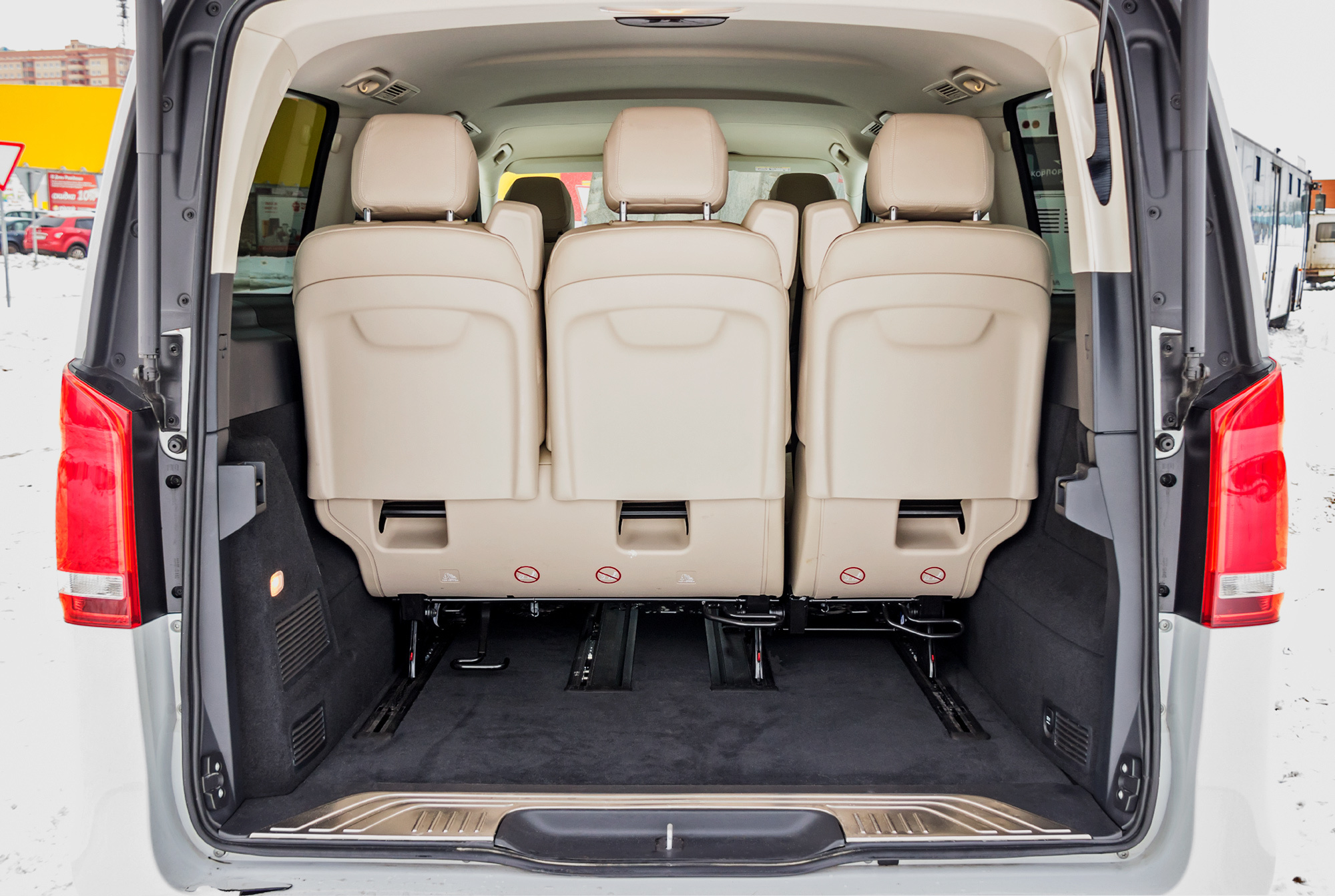 Если со статусом человека за рулём нам не удалось определиться однозначно, то пассажиры — всегда пассажиры. Для них V-класс хорош. По крайней мере в том, что касается размещения. Нам досталась версия средней длины (5140 мм) при 3200 мм базы. Изначально салон V-класса шестиместный: с четырьмя раздельными креслами в пассажирском отсеке. У нас же модификация семиместная — вместо двух задних сидений установлен трёхместный диван. У каждого места спинки регулируются по углу наклона. Посадка удобна, есть подлокотники, но жестковато: нам хотелось бы более мягкого наполнителя под кожаной обивкой.
