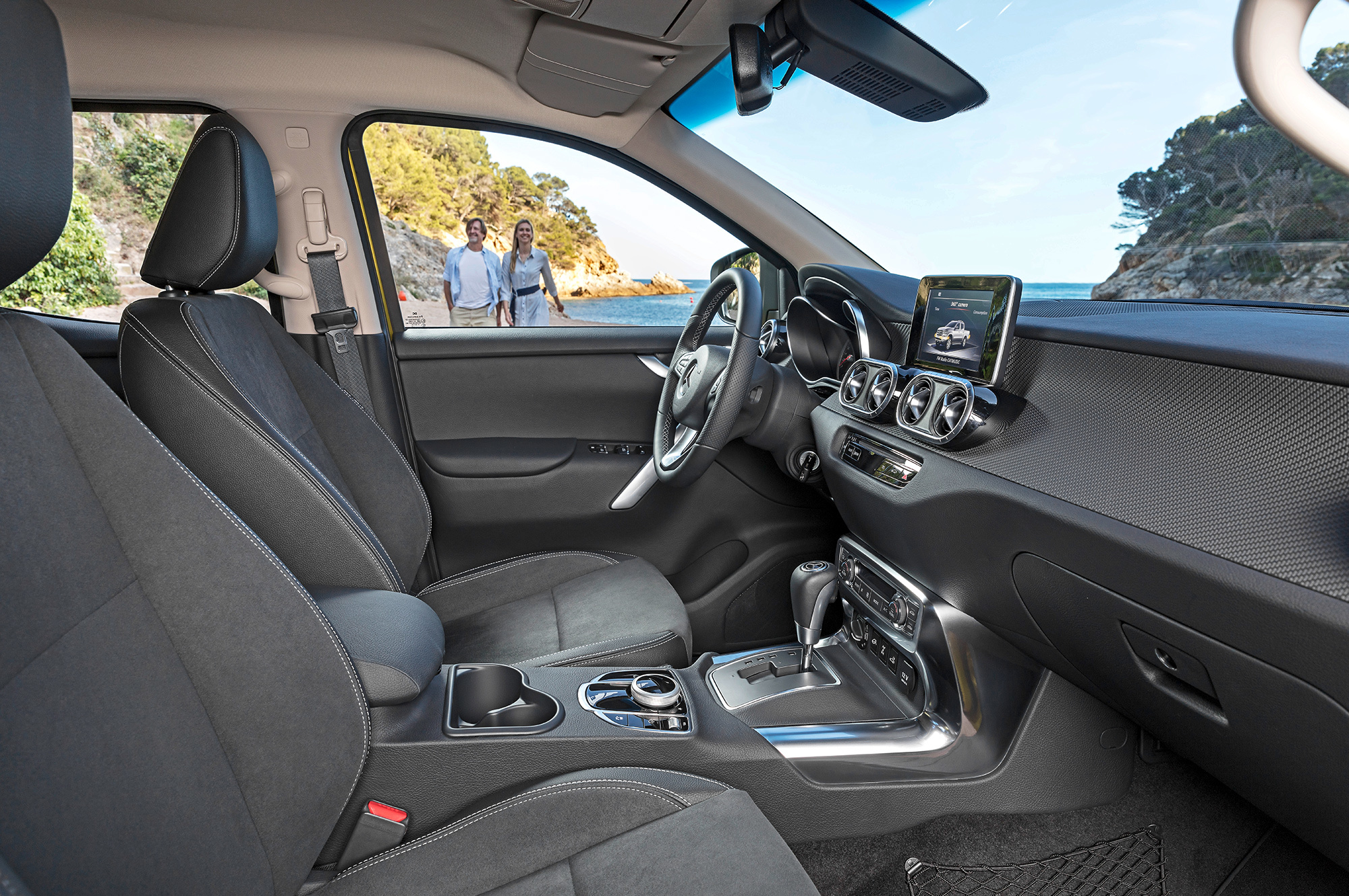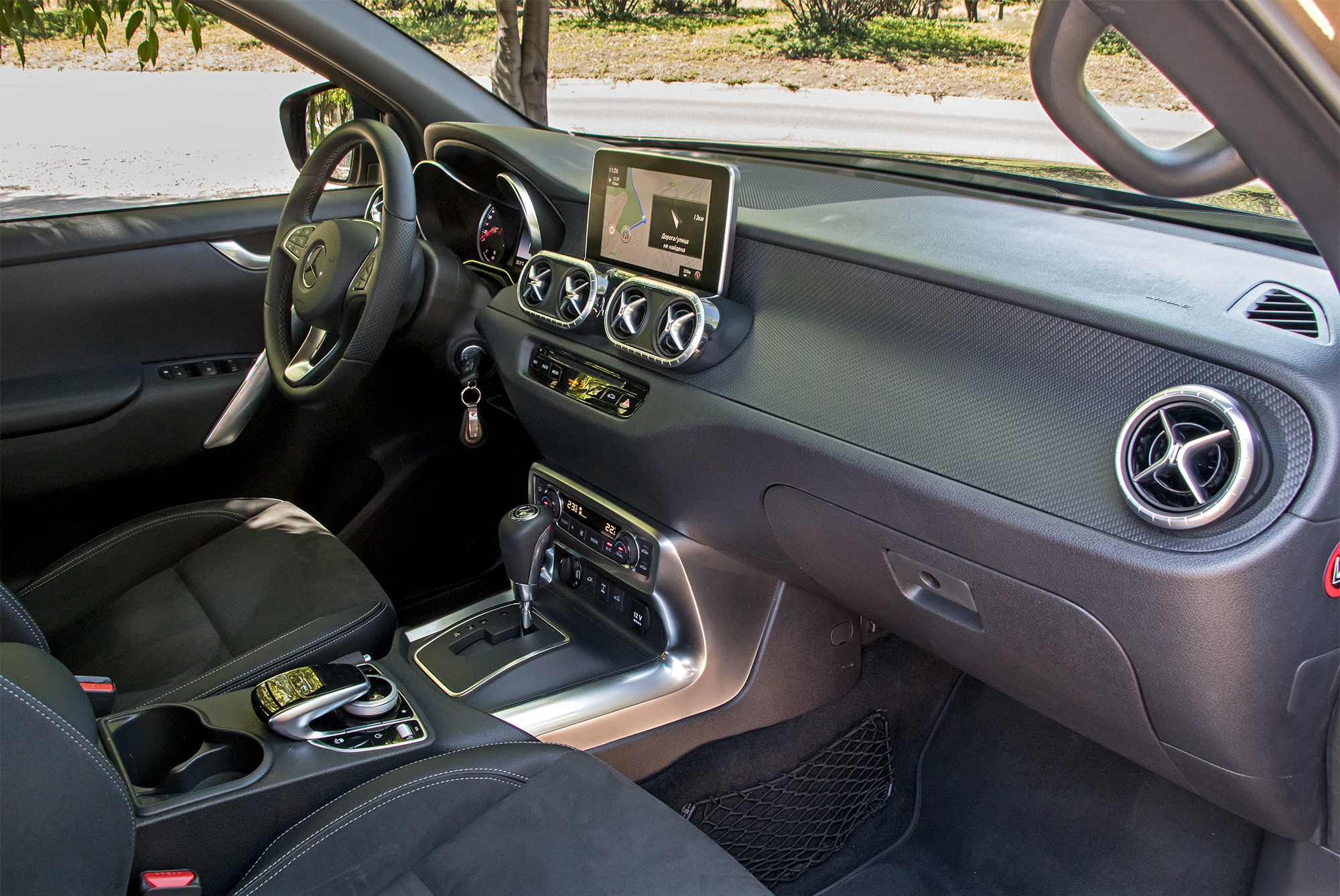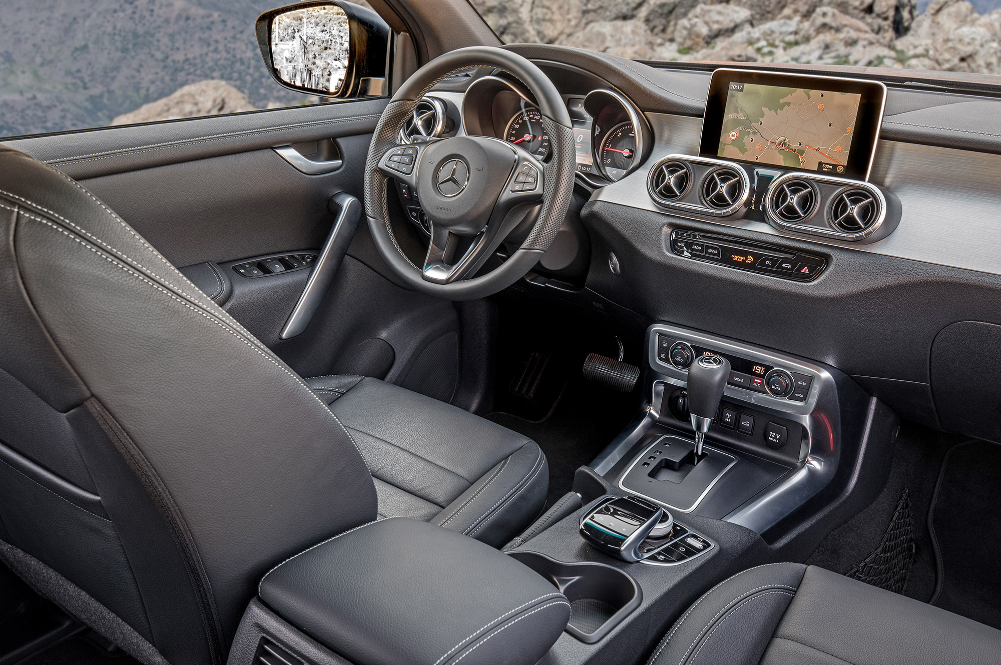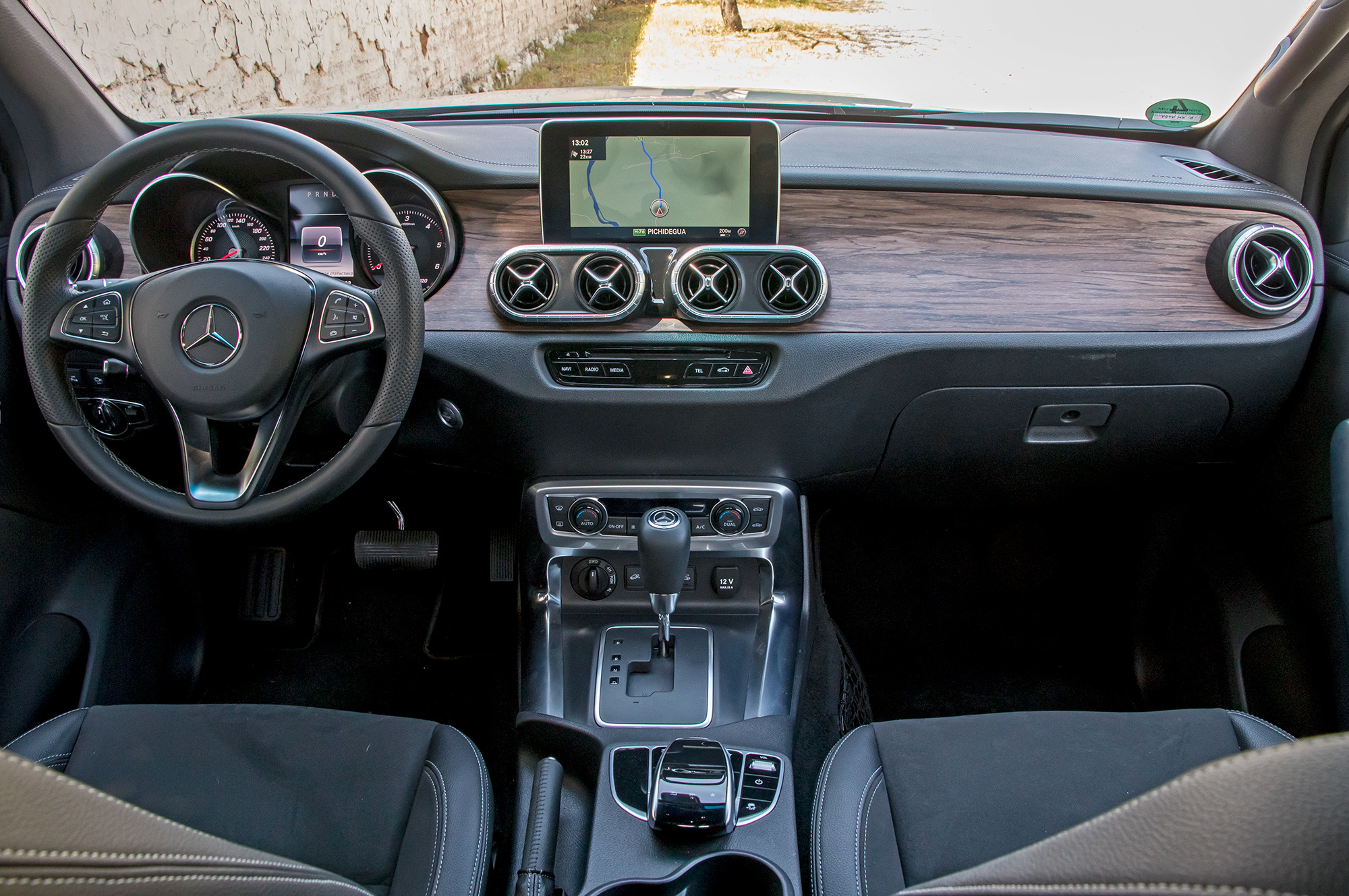 В салоне Мерседеса X-класса работали дизайнеры, а не плотники или каменотёсы. Даже в «голой» версии Pure приятно смотреть на смелые формы передней панели и сдвоенные дефлекторы. Металл везде прикрыт. В дорогих комплектациях добавлены мягкие элементы над приборной панелью и на дверях. Да и без них по воспринимаемому качеству это действительно Mercedes среди пикапов. Угадать в нём немолодой рамник Nissan Navara можно разве что по линии остекления, кнопкам обогрева сидений на боковинах кресел да отсутствию регулировки руля по вылету.