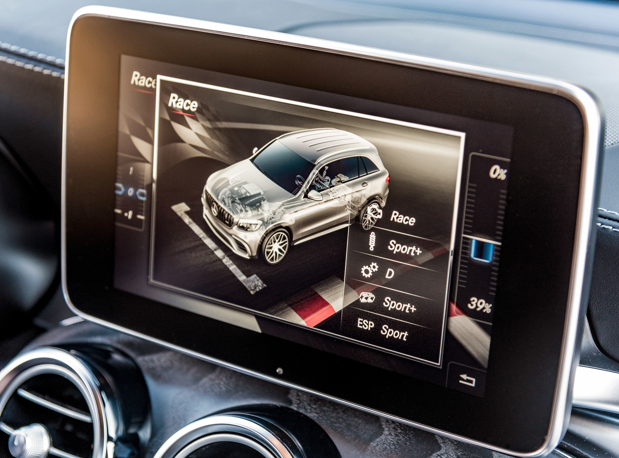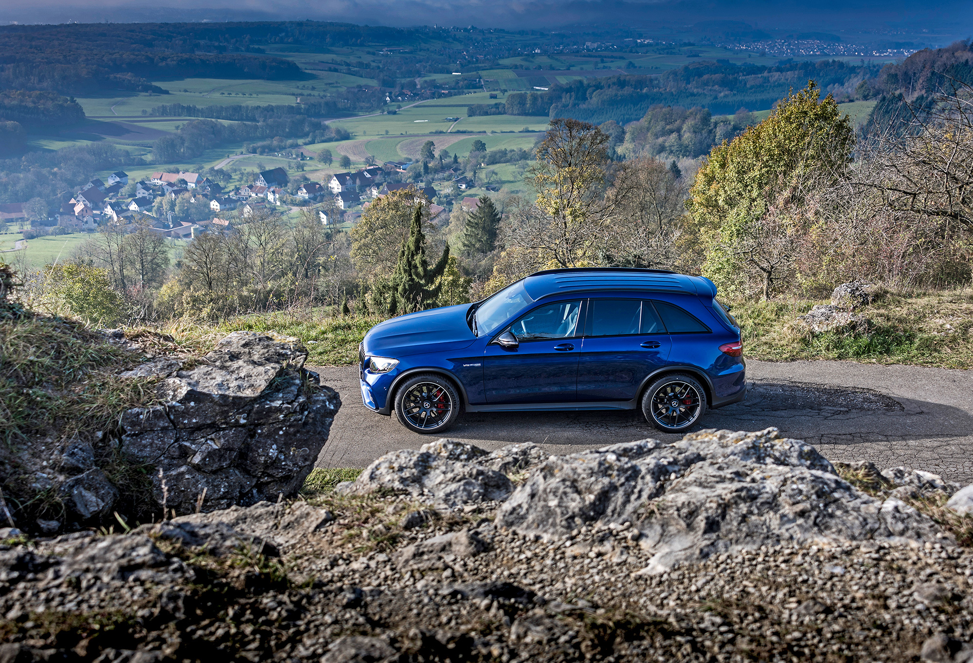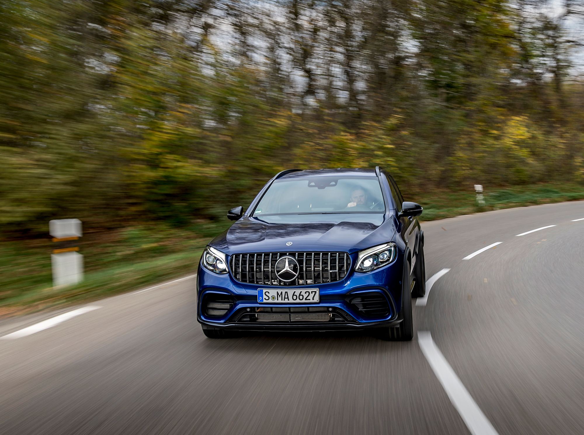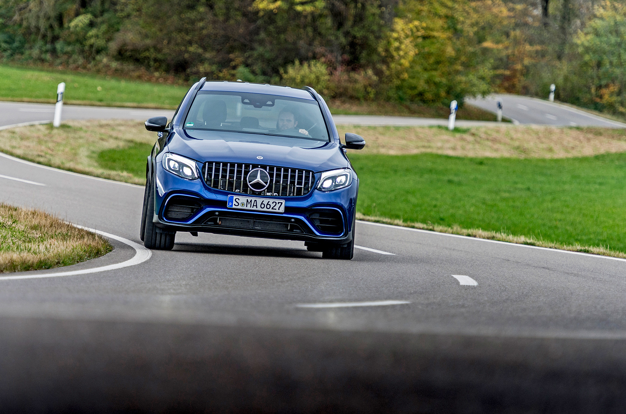 Вдумайтесь: посуху GLC 63 S способен набрать 100 км/ч за 3,8 с! И С 63 S, и купе AMG GT на пару десятых медленнее. В паспорте Stelvio проставлены те же значения, а чуть шустрее только монстр Grand Cherokee Trackhawk мощностью 717 сил. Но заявленные числа — только полдела. Всевластие полного привода лучше всего ощущаешь в сырую погоду, как сейчас под Штутгартом. Включаю режим Sport+, упираюсь левой ногой в тормоз, плюхаю по акселератору — и GLC приседает. Капли дождя на кузове — как мурашки от напряжения в трансмиссии. Отпускаю тормоз. После лёгкой пробуксовки с минимальным уводом в сторону следует прыжок, сопровождаемый мягким ударом по лопаткам.