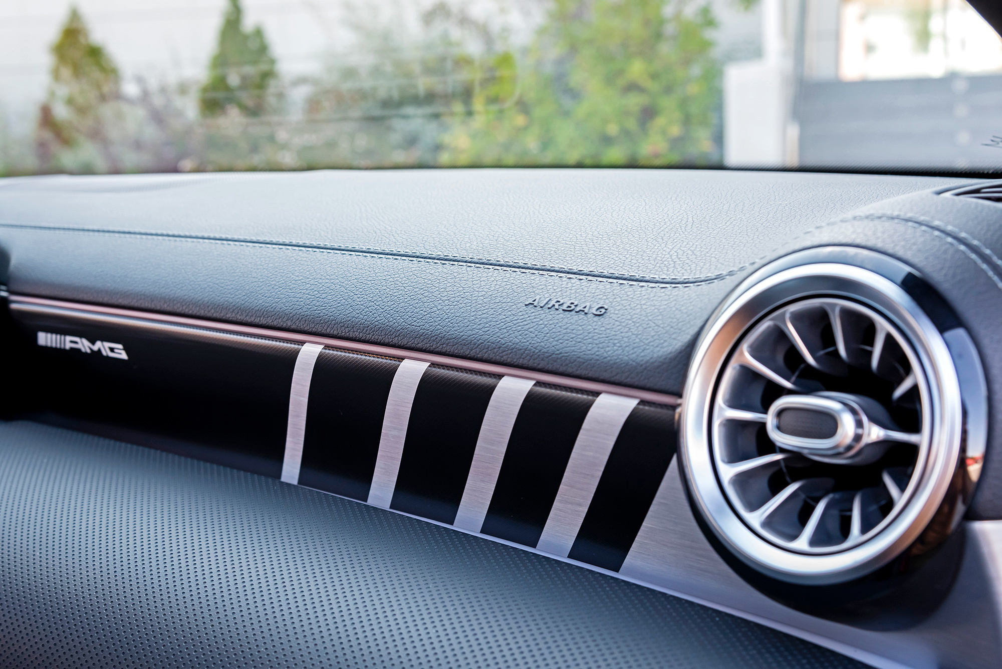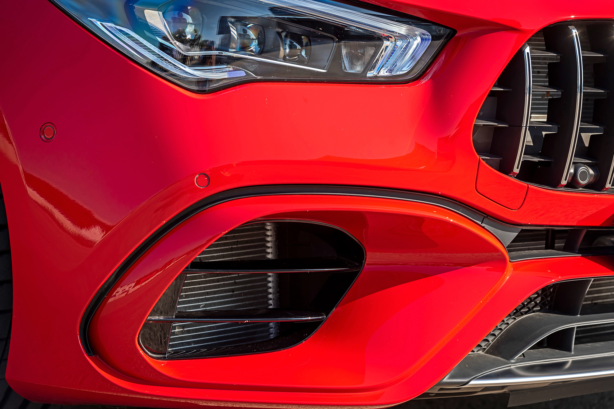 А ведь моторный отсек у новых мерседесовских компактов невелик сам по себе: обратите внимание на «заострённый» спереди силуэт. Поэтому компоновку головки блока двигателя M139 по сравнению с AMG-малышами прошлого поколения или «тридцать пятыми» версиями нынешнего пришлось развернуть на 180 градусов. Выхлопом назад, впуском вперёд. И крепко поработать над охлаждением. Фактически всю переднюю часть, включая боковые элементы бамперов, занимают разнообразные теплообменники.