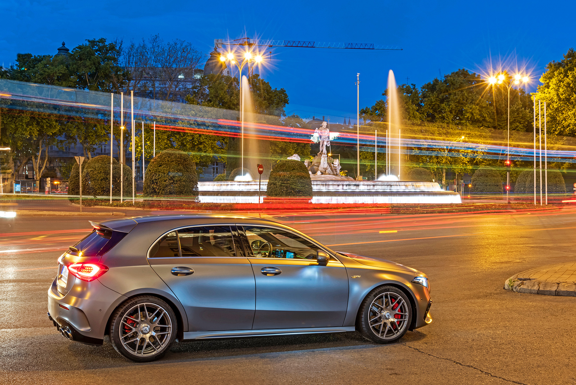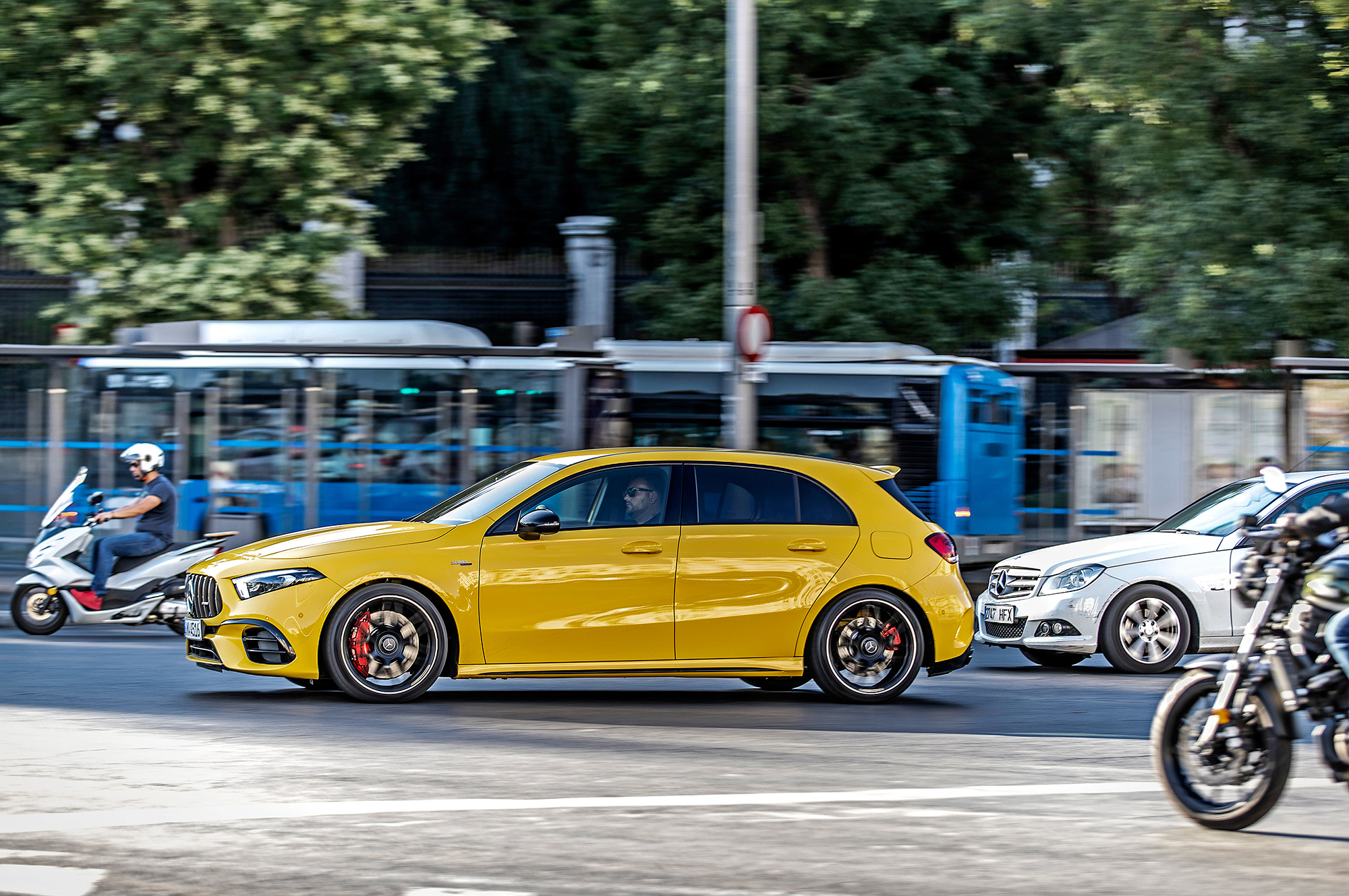 Забудьте всё, что вы знаете о ездовых свойствах «горячих хэтчбеков». Теперь их едва можно назвать «тёплыми», потому что настоящий огонь ― это AMG 45 S. С любой скорости, хоть с двухсот, в ответ на нажатие газа машина бросается вперёд под сухой, будто «компрессорный», стрёкот мотора. Обгон на шоссе занимает метров сто, если не меньше. Ровная тяга доступна с любых оборотов, чтобы заставить вспомнить скорее о динамике суперкаров, чем автомобилей аналогичного форм-фактора.