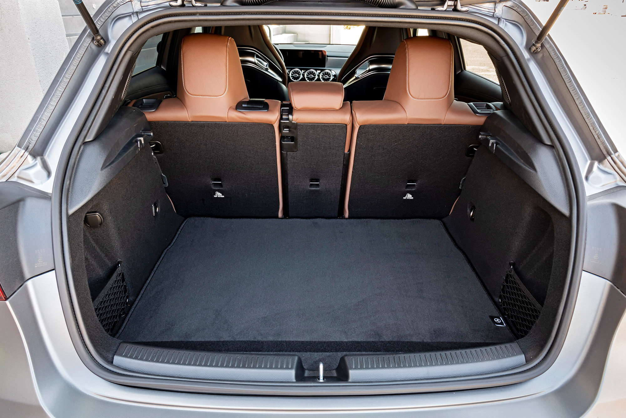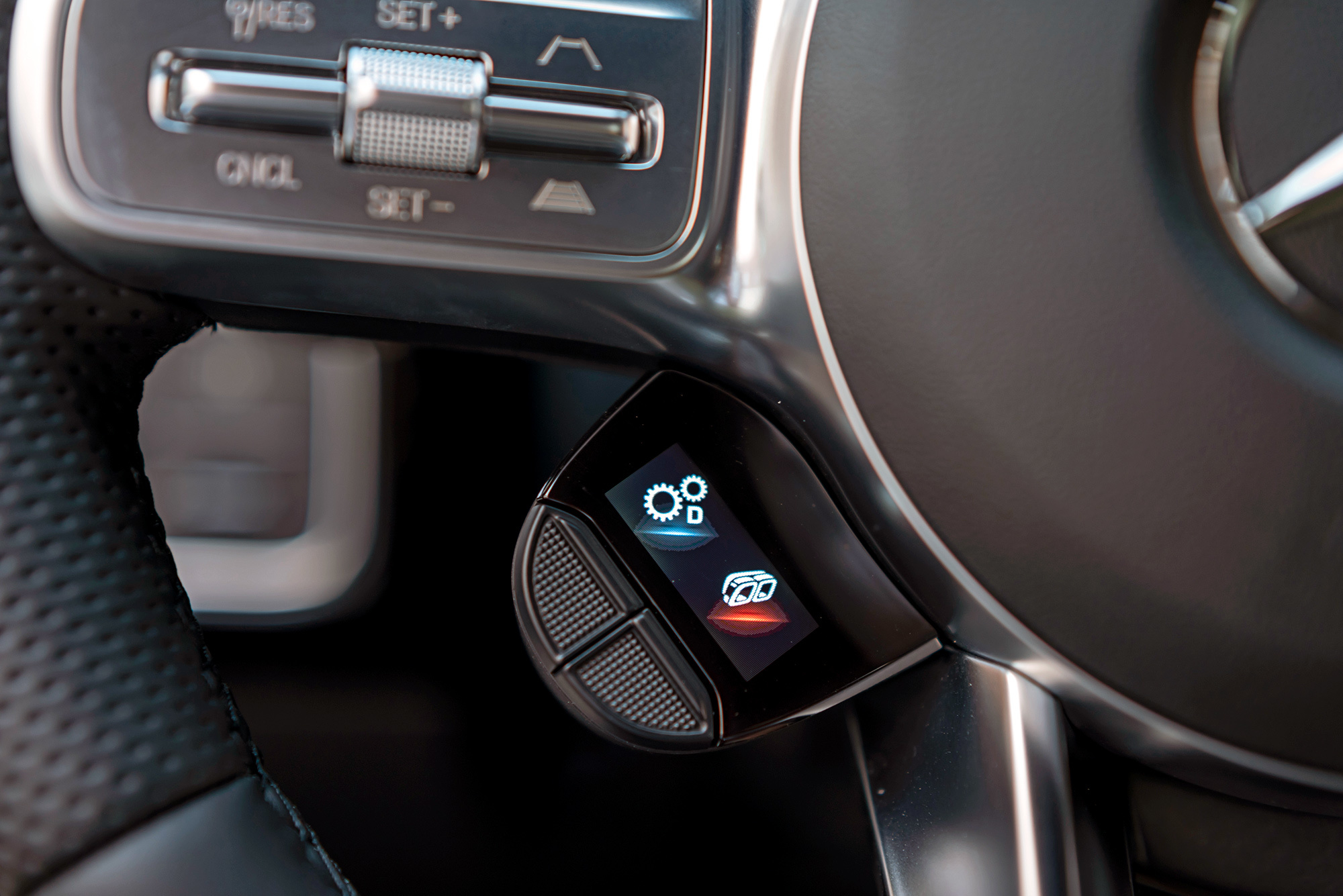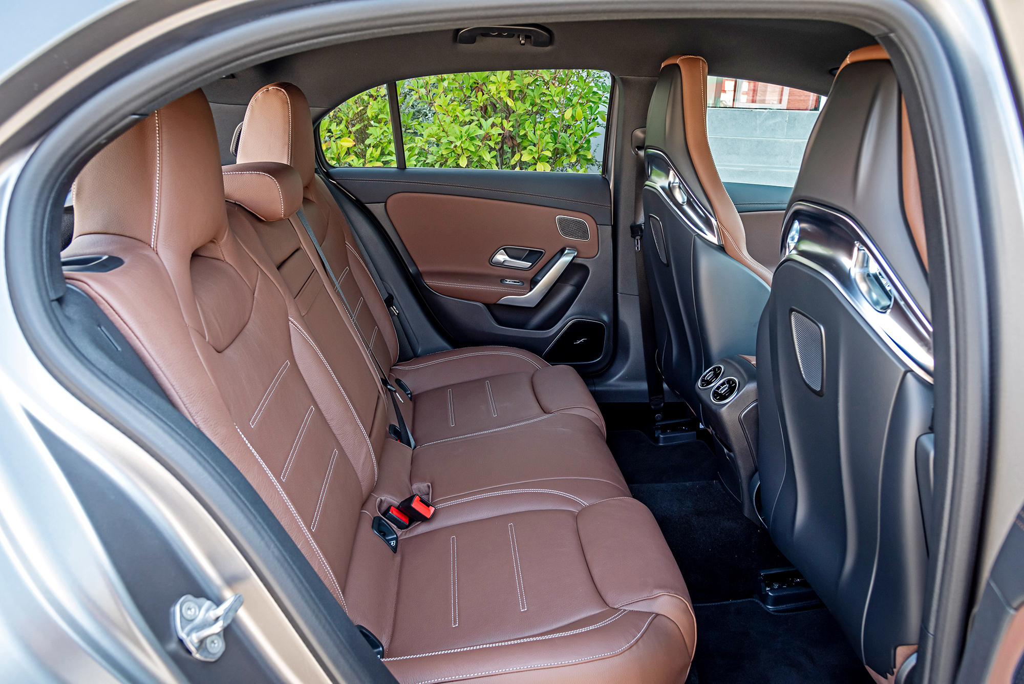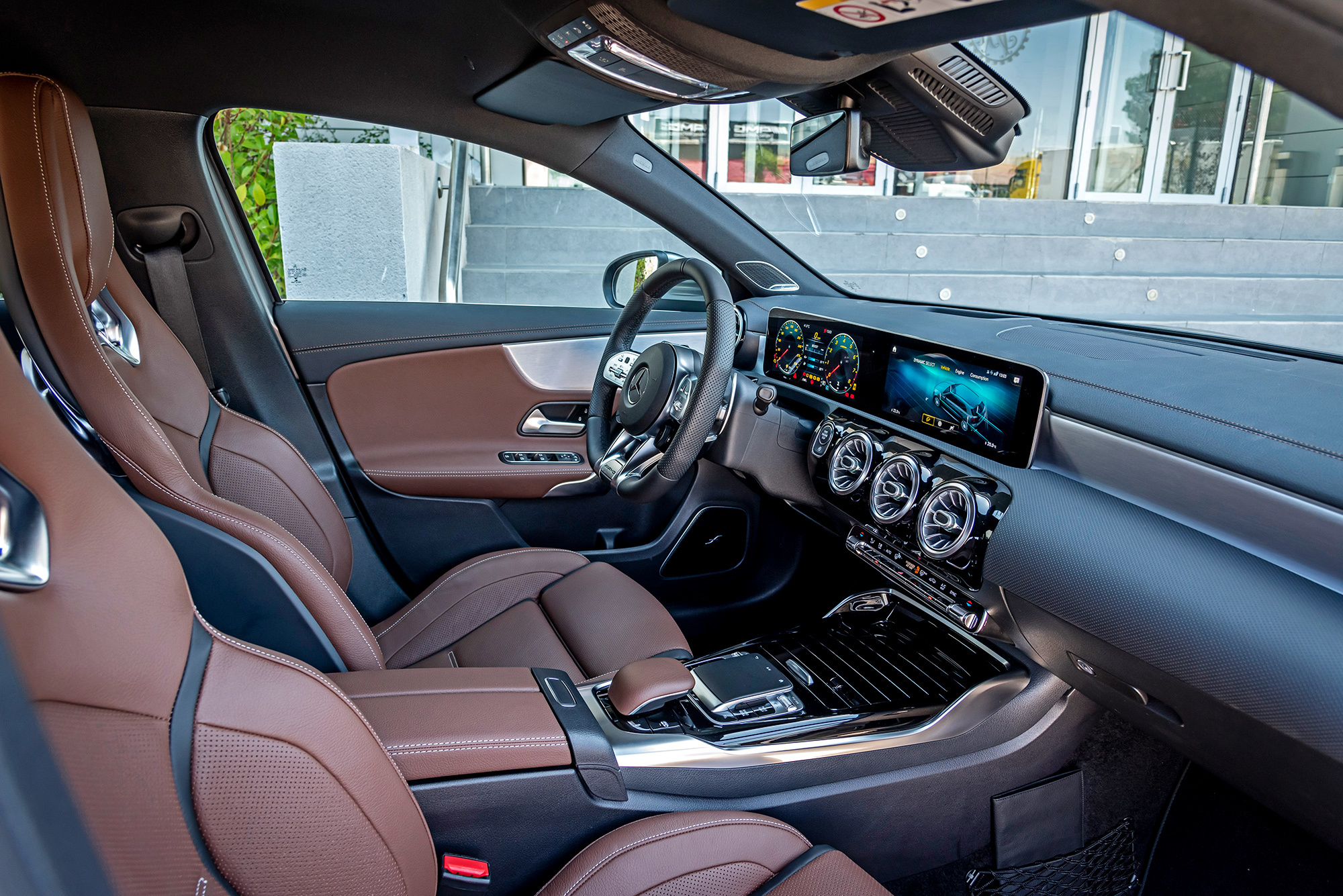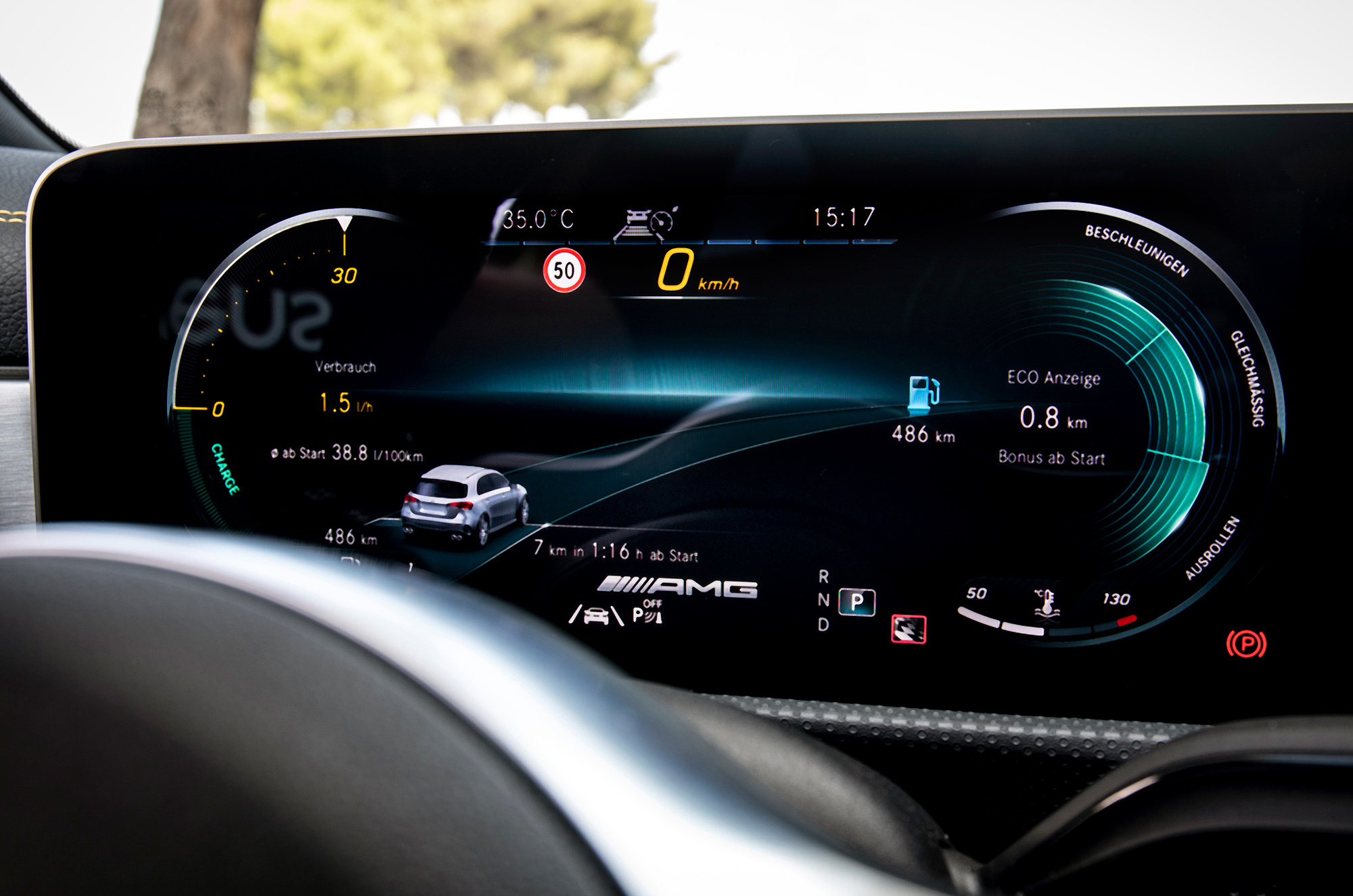За ощущение новизны в интерьере отвечают ковшеобразные кресла и замшевый руль с неудобно скошенным низом. Ожидаемо жёсткие сиденья оснащены минимальным набором регулировок. И если штатного поясничного подпора хватает, то я бы не отказался ослабить давление валиков боковой поддержки на бёдра и усилить их хватку для туловища. Такой возможности не предусмотрено, как и подогрева с вентиляцией. В остальном салон А-класса радует качеством и дизайном, хорош электронный щиток приборов с переработанной для AMG графикой.
