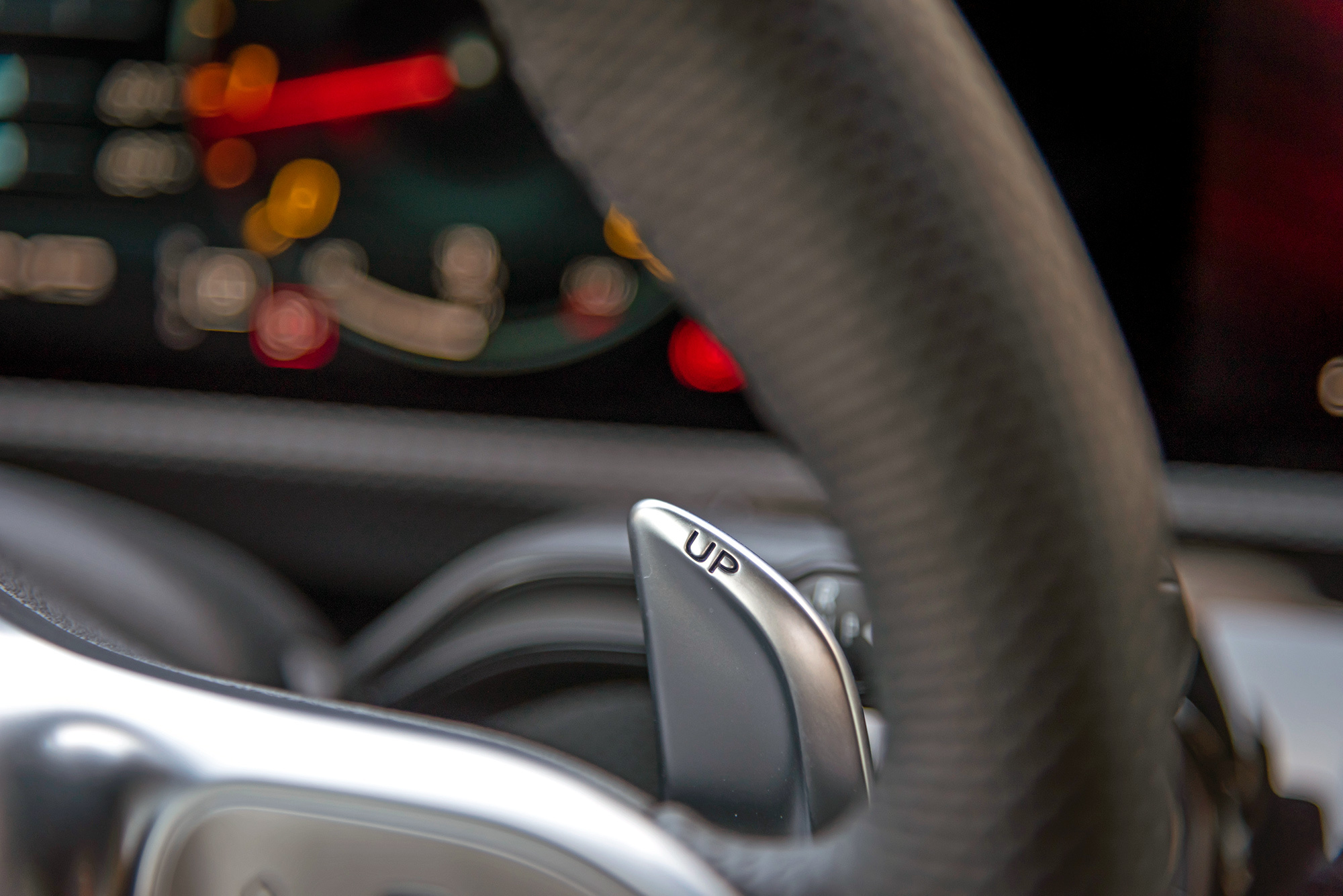 Чтобы кайфануть от управляемости, просто необходимо ехать на трек. Горные серпантины не позволяют подобраться к пределу сцепных свойств шин Michelin Pilot Sport 4S. Машина просто едет, куда скажут, на запредельных скоростях без кренов и намёка на скольжение или писк. Перегрузки заставляют пассажиров мечтать о передышке. Руль по спорткаровским меркам «длинен» (совершает два с половиной оборота от упора до упора) и лёгок, но обратной связи хватает. Усилие можно поднять в одной из трёх спортивных программ, однако на общественных дорогах в этом нет большого смысла.