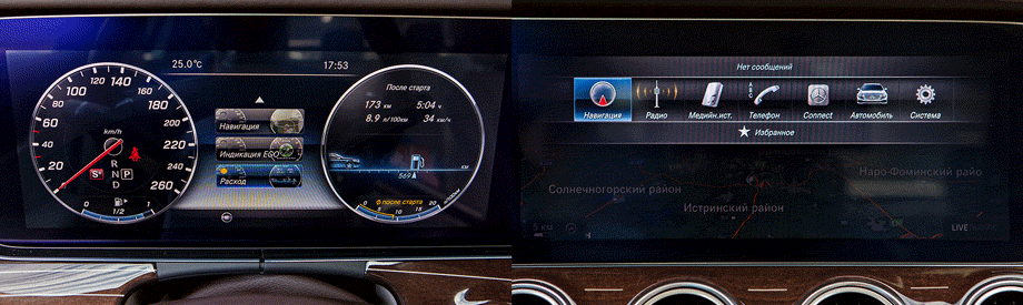 У приборов Мерседеса — три основных варианта оформления на выбор, у контурной подсветки салона — 64. Обживать «ешку» — всё равно что настраивать современный смартфон: выбор тем, чувствительности тачпадов... Накликанный под себя Mercedes становится эмоционально ближе. Смущает лишь то, что при моём росте 176 см и полностью опущенном кресле обод руля перекрывает мне верхушку приборного дисплея, а ещё ни в одном положении великолепного кресла (уж как я его ни двигал!) не вижу фирменную звезду-прицел целиком: чтобы её нижняя часть не пряталась за кромкой капота, надо упереться лбом в противосолнечный козырёк.