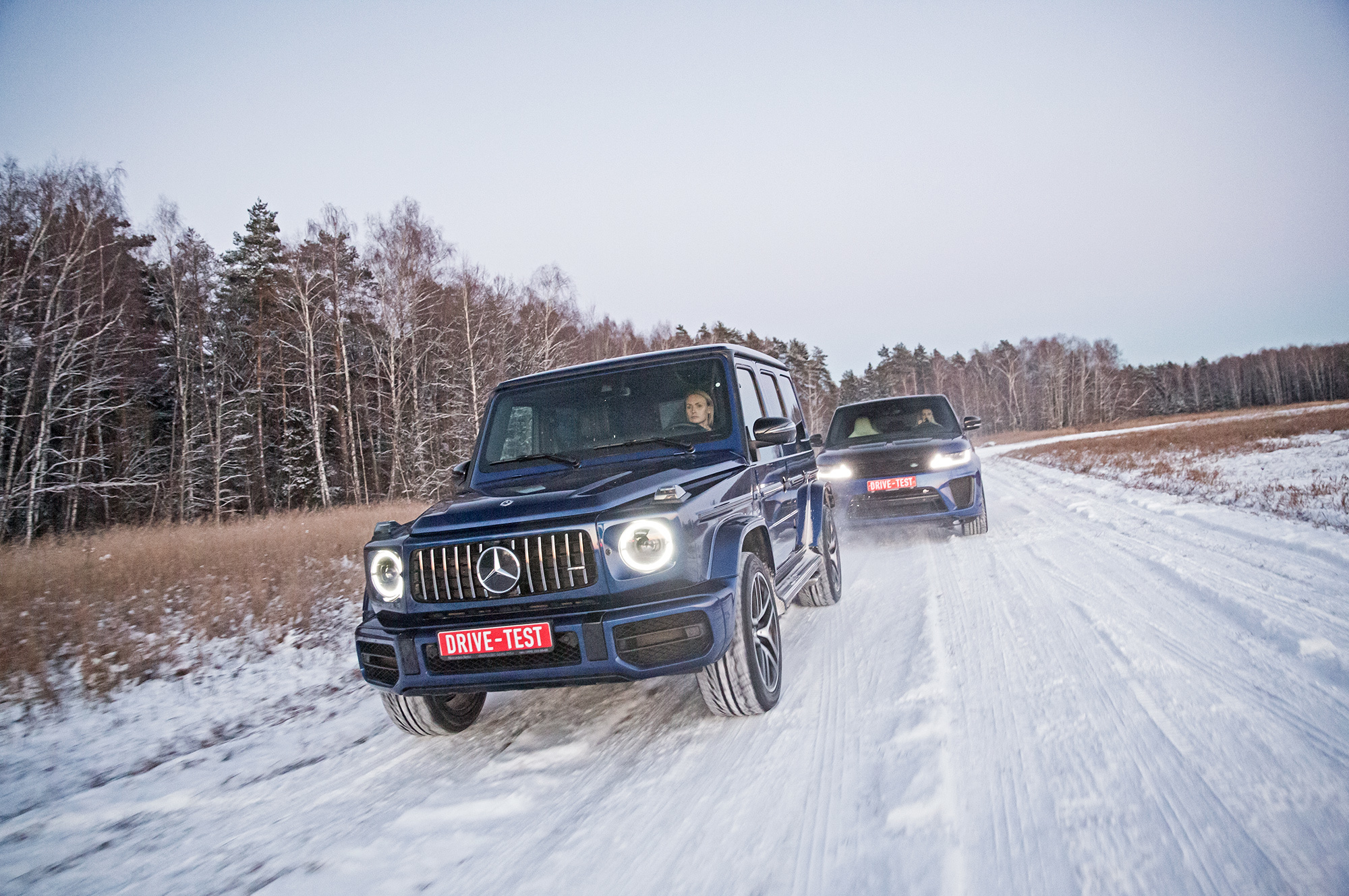 Удивительно, насколько они всепогодны! На осенних замерах заправленный G 63 с одним водителем набирал у нас 100 км/ч за пять секунд. И сейчас на сыром асфальте в мягких шинах Nokian WR SUV3 делает это за 4,9 с по Рейслоджику. Раскатился. А SVR всего на полсекунды медленнее, хотя его ContiCrossContact Winter — просто драная тряпка. Каждый на разгоне производит неизгладимое впечатление по-своему. Range Rover, как и положено, орёт благим матом, а G 63 встаёт на дыбы, как боевой слон. Наверное, я путаю боевого с цирковым, но вы меня понимаете.