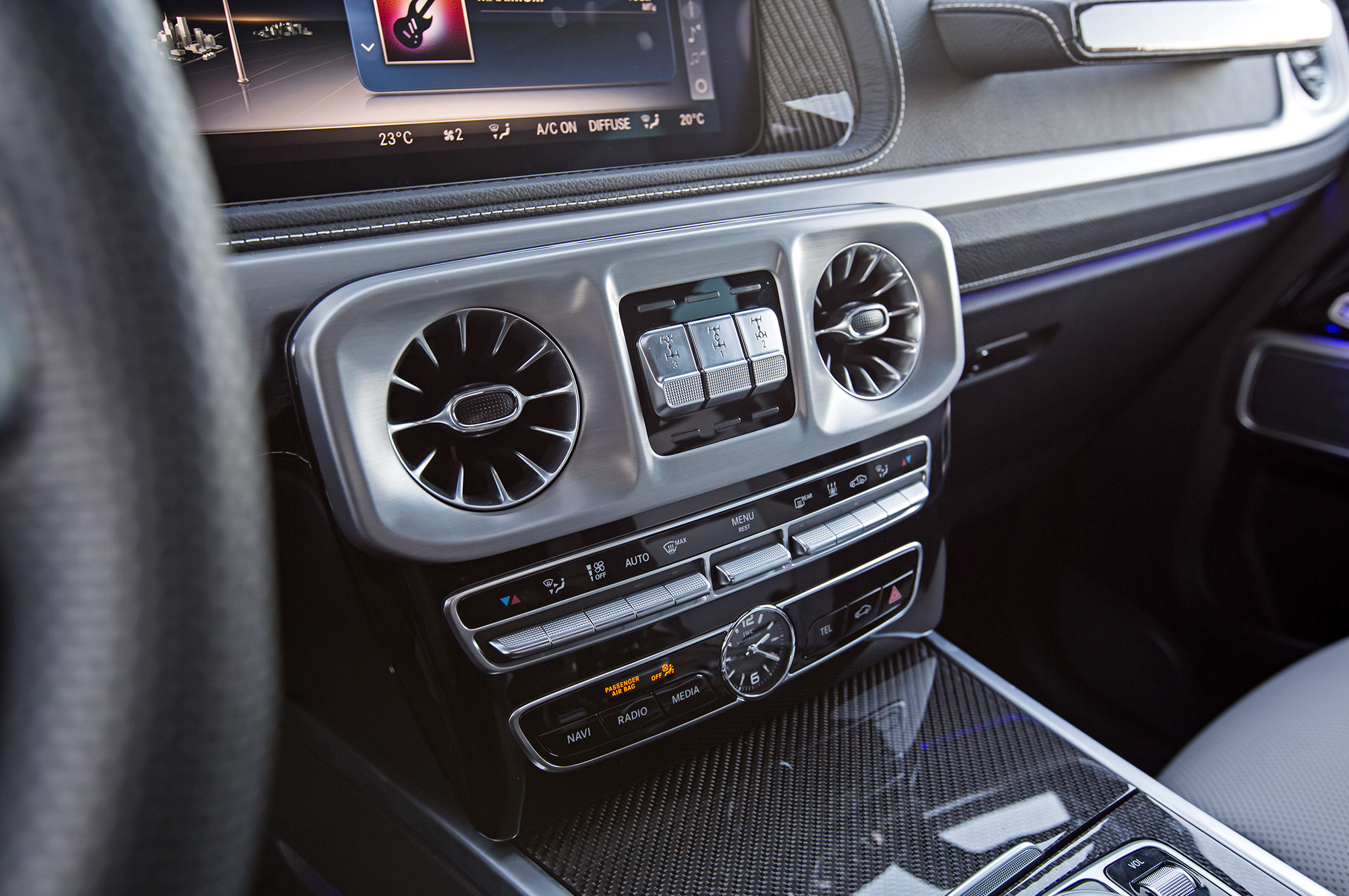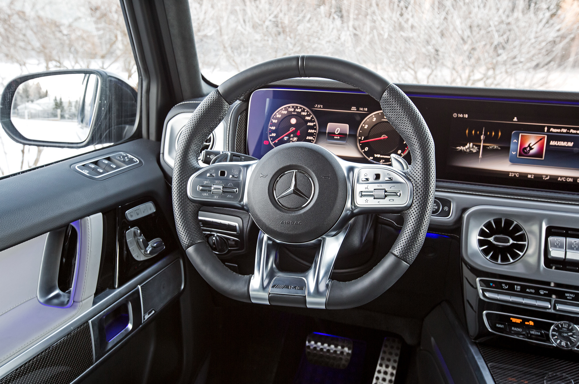 Человеку, не водившему старый G-класс, не понять моего восторга от педального узла, слегка притеснённого широким центральным тоннелем. Наконец-то сижу как белый человек. Только ремень безопасности непривычно расположен на сильно сдвинутой вперёд средней стойке, словно в УАЗе. Не оттого ли фронтальный краш-тест Euro NCAP выявил слабую защиту груди водителя?