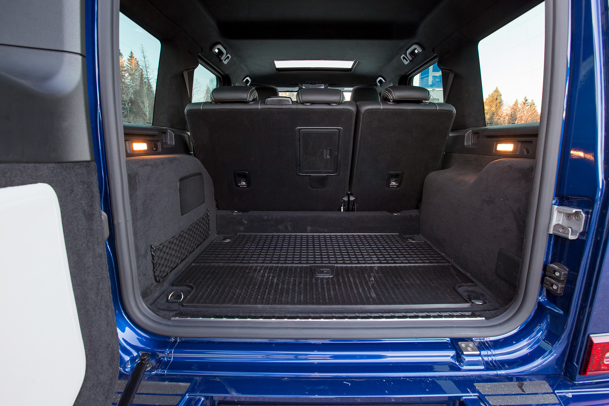 Впрочем, даже в стандартном дорожном режиме пневмоподвески дорога из Рейнджа видна как на ладони, отлично просматривается капот и читаются габариты. Удачно спрофилированы тонкие стойки лобового стекла. Боковые зеркала лучше, чем у Мерседеса, низкие крепления не мешают. В целом сухим днём обзорность из окон чуть лучше, чем в Гелике. Однако система кругового обзора у Мерседеса работает чётче, картинка нагляднее, необычные дворники лучше расчищают стекло перед пассажиром, а складные задние подголовники не маячат в проёме. Хотя часть его и перекрыта запаской.