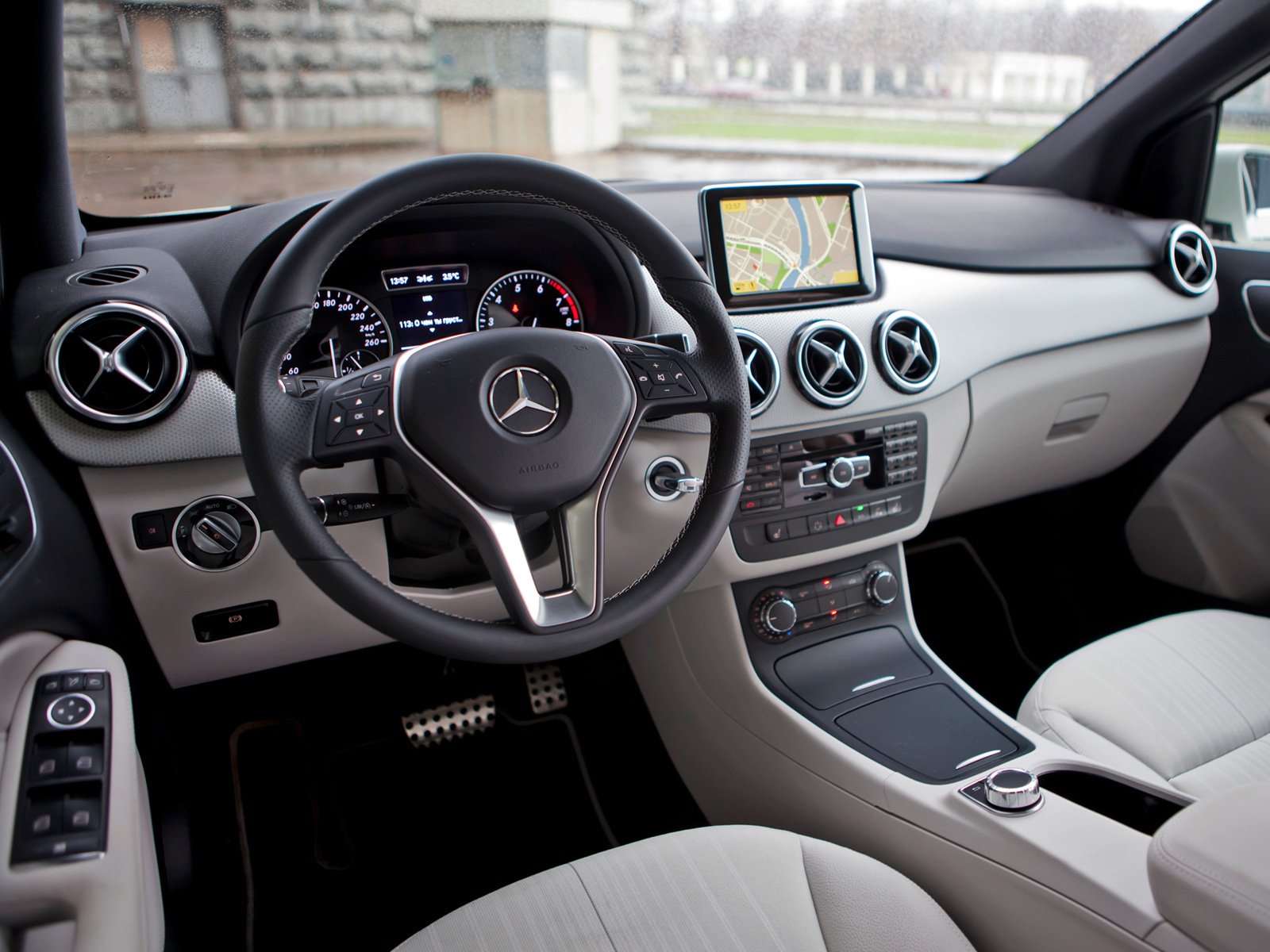 Заданная экстерьером стилистика нашла отражение и в интерьере. Смотреть на переднюю панель Турана, что часами глядеть в окно пасмурным днём, — скучно. Но Volkswagen располагает к себе неплохой эргономикой и качеством исполнения. В B-классе тоже удобно, салон так же собран на совесть, а материалы отделки ещё лучше. Но как сильно поднимается настроение в Мерседесе после Фольксвагена — словно попал на первоклассную комедию в стиле Квентина Тарантино после скучного бессмысленного кино.