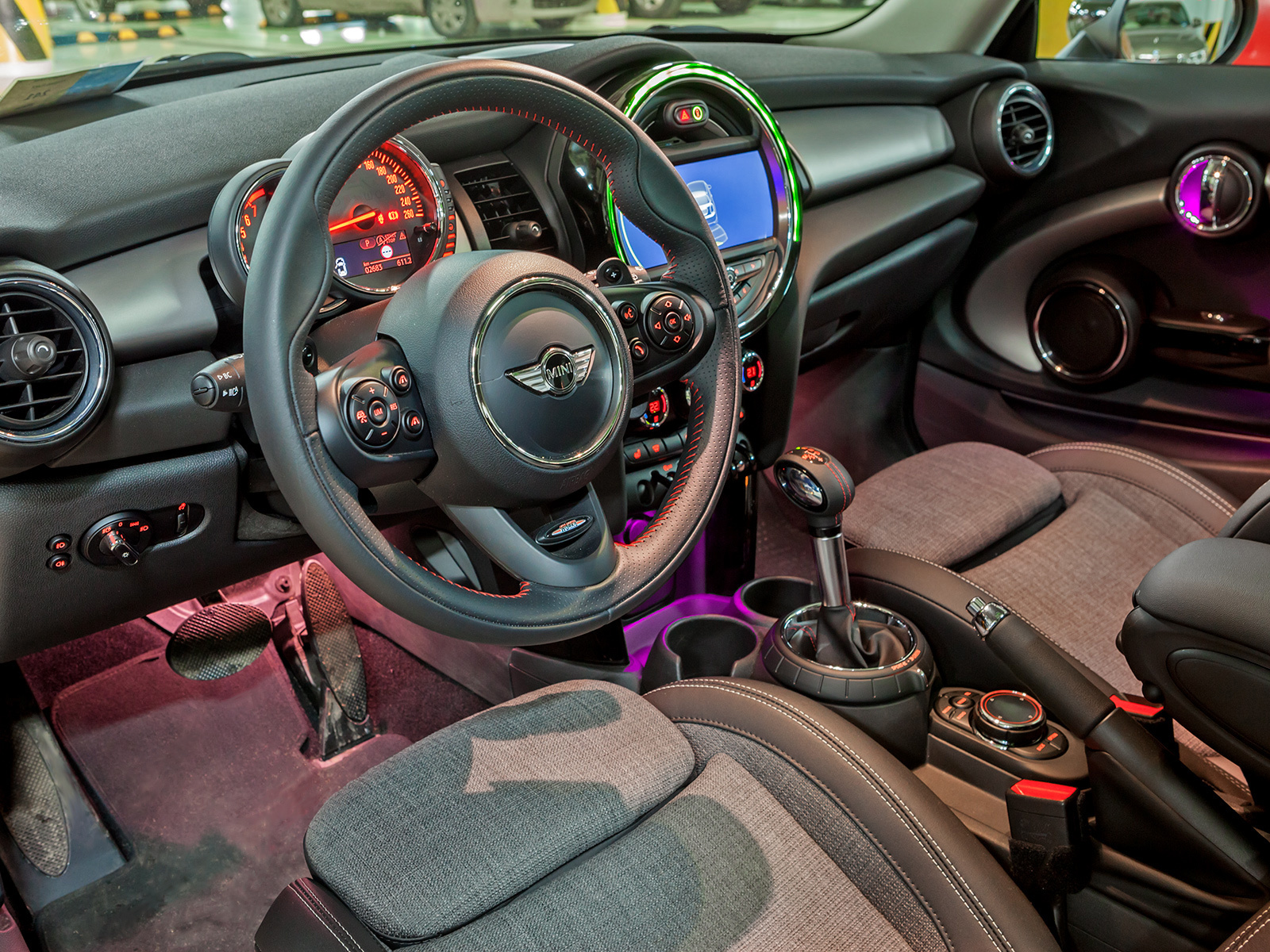 От огромного спидометра в центре передней панели предыдущего Mini R56 было мало толку. Хорошо, что приборы снова организованы по образцу R50/53. (Машины всех трёх поколений называются New Mini, так что индексы нам в помощь, чтобы не запутаться.) Уже тогда при наличии в центре большого мультимедийного экрана спидометр с тахометром выносились на руль. Современный Mini трудно вообразить без широкоформатного дисплея, поэтому основные приборы снова расположены там, где им самое место, — непосредственно перед водителем. Но если раньше у спидометра с тахометром были отдельные корпуса на ножках, то теперь они объединены. Интерфейс общей для автомобилей BMW мультимедийной системы стал ещё более дизайнерским, «минюшным». Шрифты на клавишах и приборах заострились.