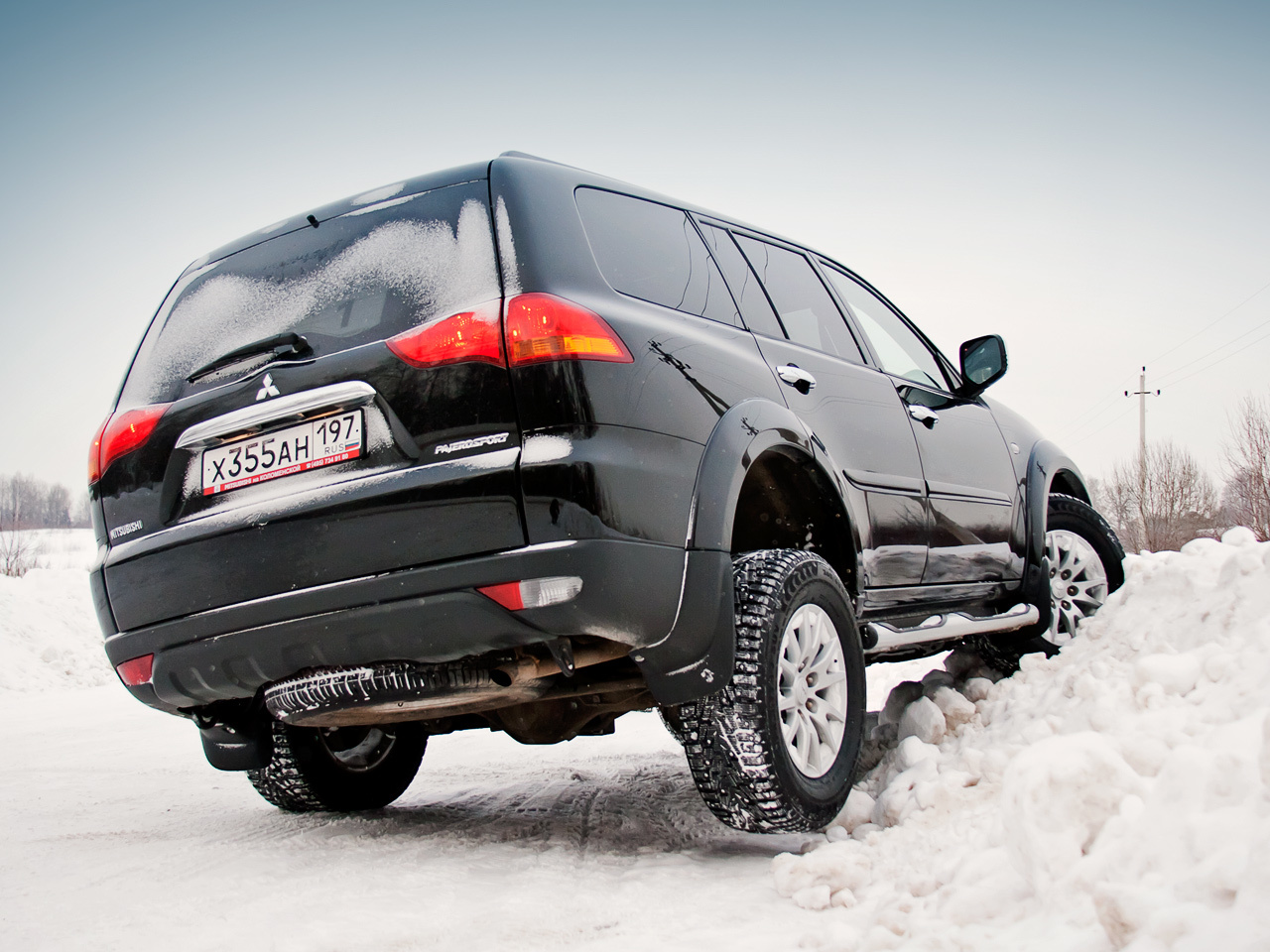 - Двигатель и топливный бак снизу прикрыты стальной защитой, а задний мост поднят как можно выше. Оцените ход задней подвески: чтобы вывесить колесо, мы смяли не один сугроб. Диагональное вывешивание — небольшая проблема для Pajero Sport.