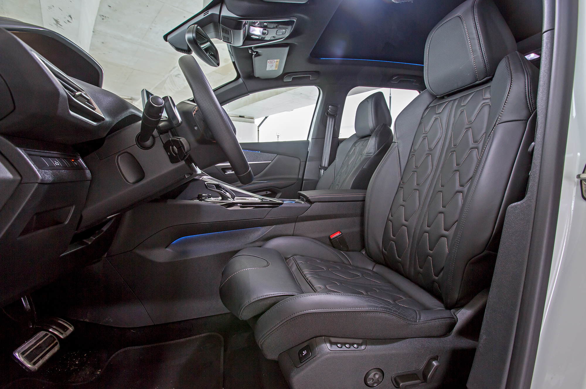 Интерьер Peugeot из другой лиги. Космолётный дизайн визуально раздвигает и без того самый широкий салон. Спереди чувствуешь себя будто в автомобиле классом выше, хотя сами кресла плосковаты и жестковаты. Материалы отделки с «джинсовыми» вставками, подгонка панелей и организация фоновой подсветкой ― безусловно лучшие. Даже центральный и перчаточный боксы отделаны флоком и подсвечены, не говоря уж об их необъятных размерах. В плафонах ― светодиоды. На стойках лобового стекла ― ткань, а не голый японский пластик.