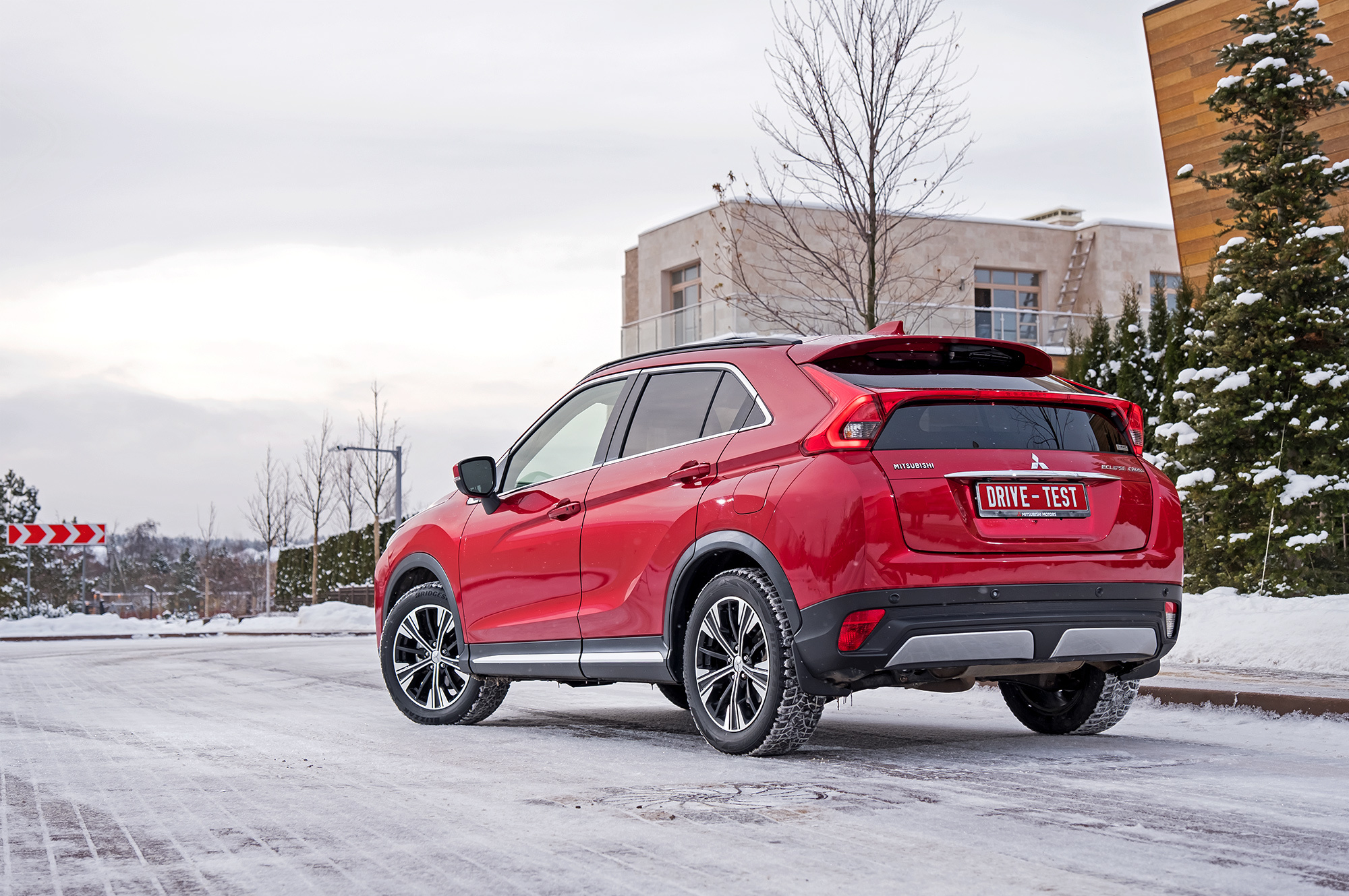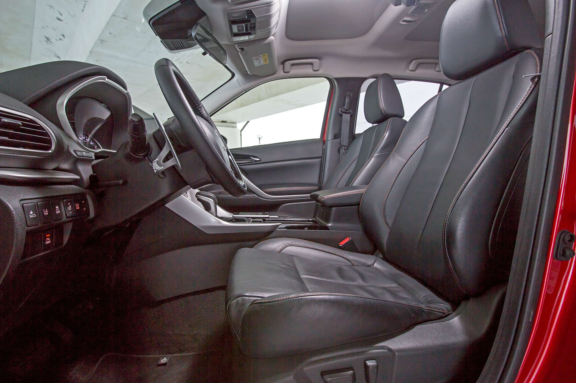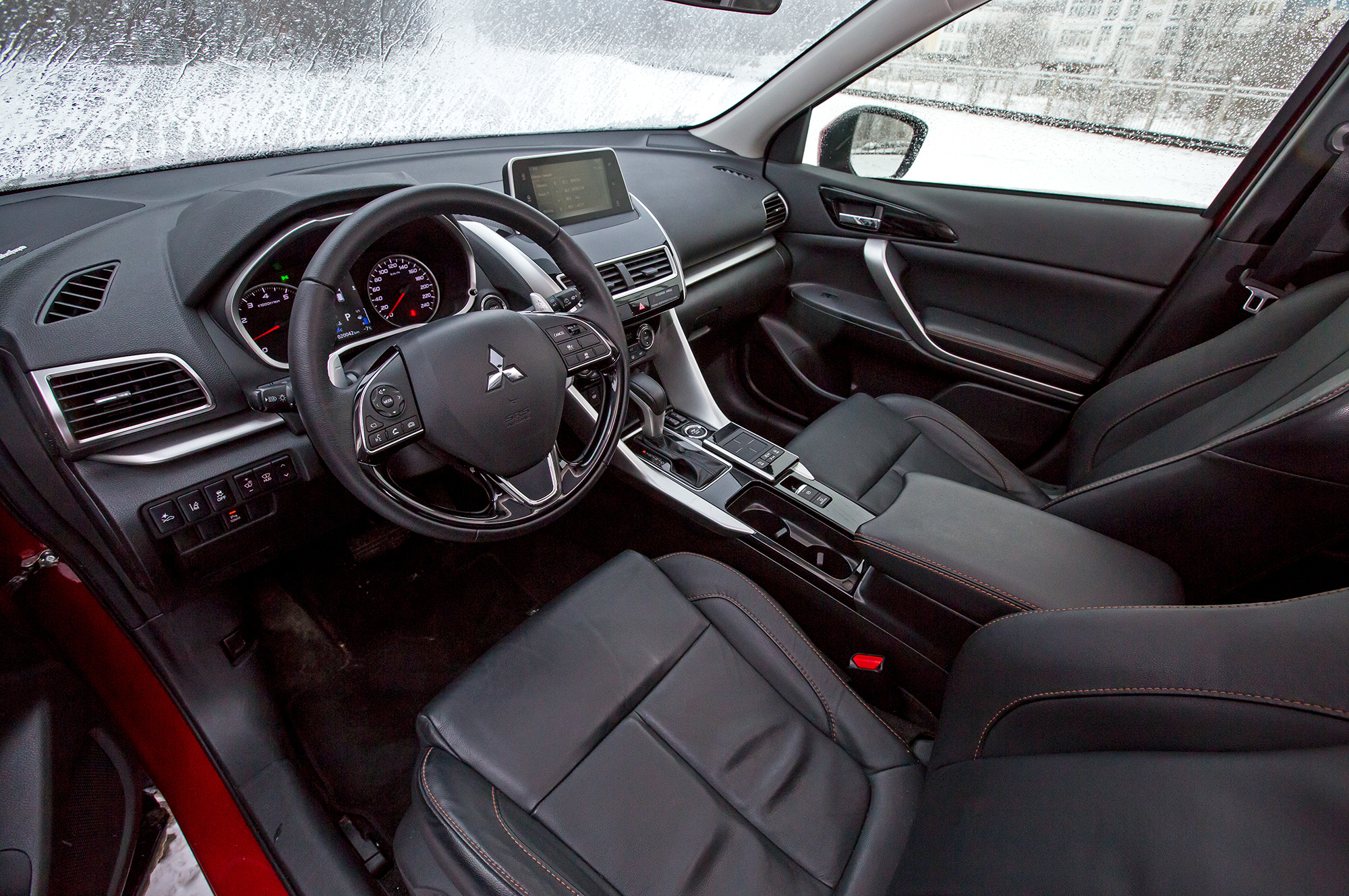 Eclipse выглядит свежо и небедно. Хромированный «икс» и чёрный глянец на переднем бампере смело выставлены навстречу грязным дорогам. Кузовные зазоры хоть и ровные, но самые большие, а красная поперечина на крышке багажника дышит под рукой. Бесключевой доступ ― с ретрокнопками в передних ручках. В салон проникаешь легко, ведь крыша высокая, да и за рулём устраиваешься как дома. Или, скорее, на даче ― мягковатое сиденье с высокой спинкой и неустранимым провалом в области поясницы будто просижено.