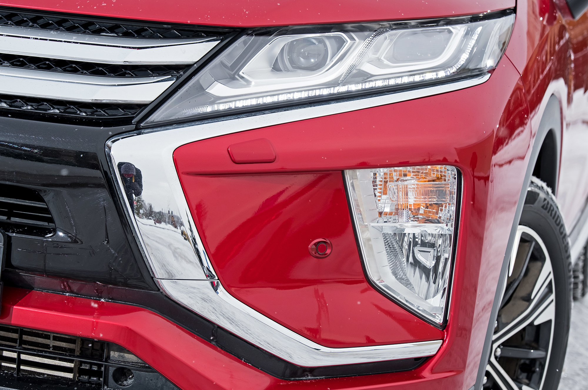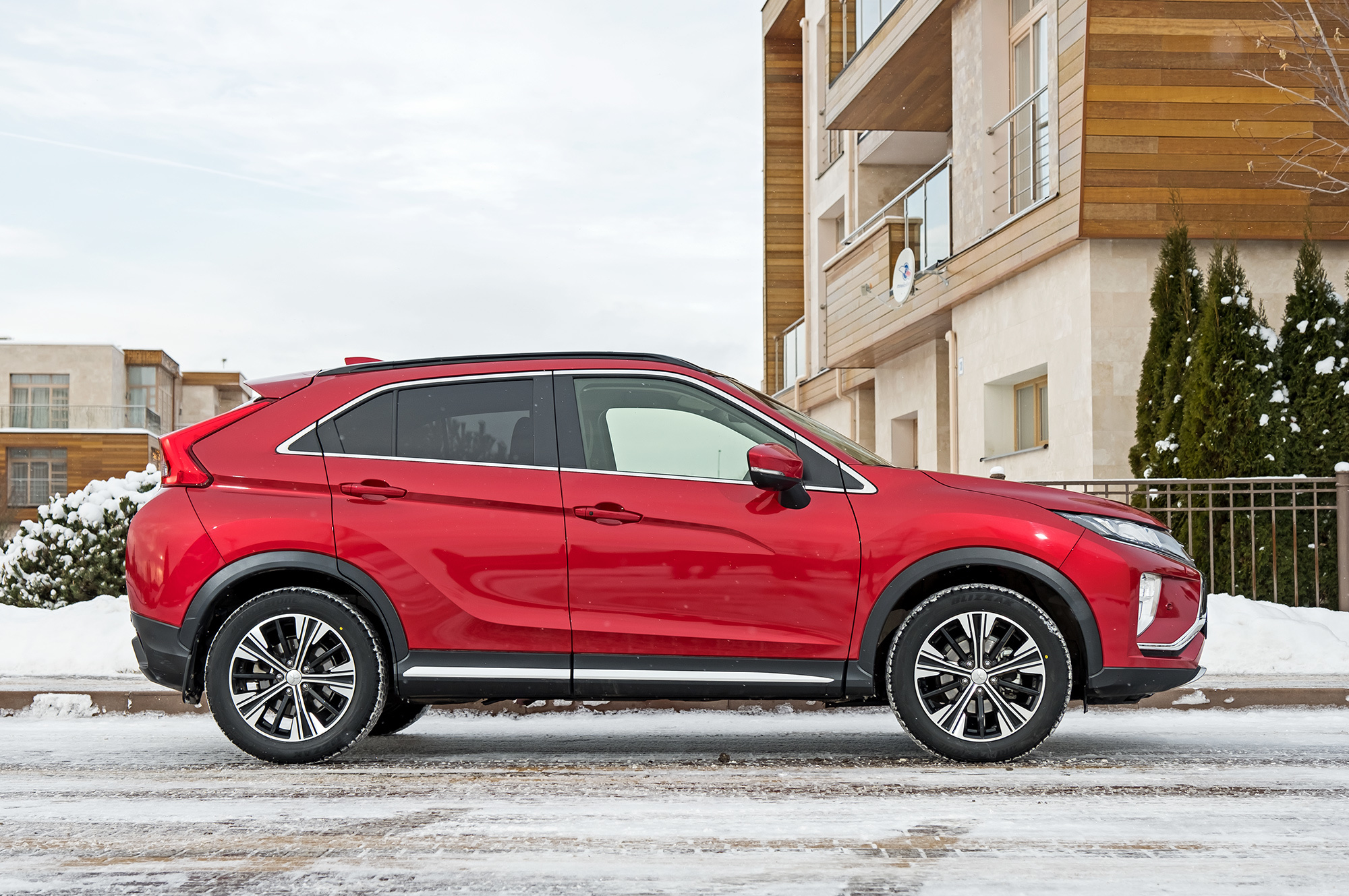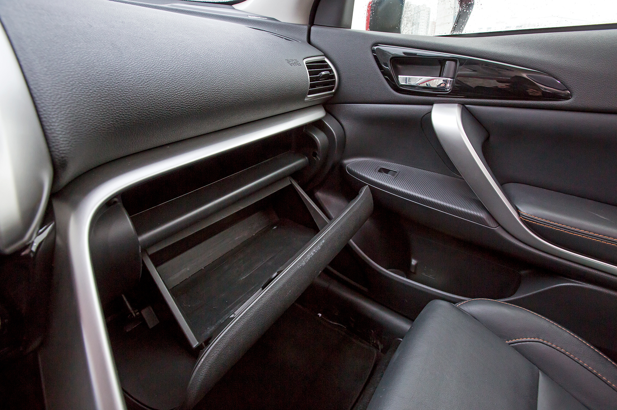 Eclipse выглядит свежо и небедно. Хромированный «икс» и чёрный глянец на переднем бампере смело выставлены навстречу грязным дорогам. Кузовные зазоры хоть и ровные, но самые большие, а красная поперечина на крышке багажника дышит под рукой. Бесключевой доступ ― с ретрокнопками в передних ручках. В салон проникаешь легко, ведь крыша высокая, да и за рулём устраиваешься как дома. Или, скорее, на даче ― мягковатое сиденье с высокой спинкой и неустранимым провалом в области поясницы будто просижено.