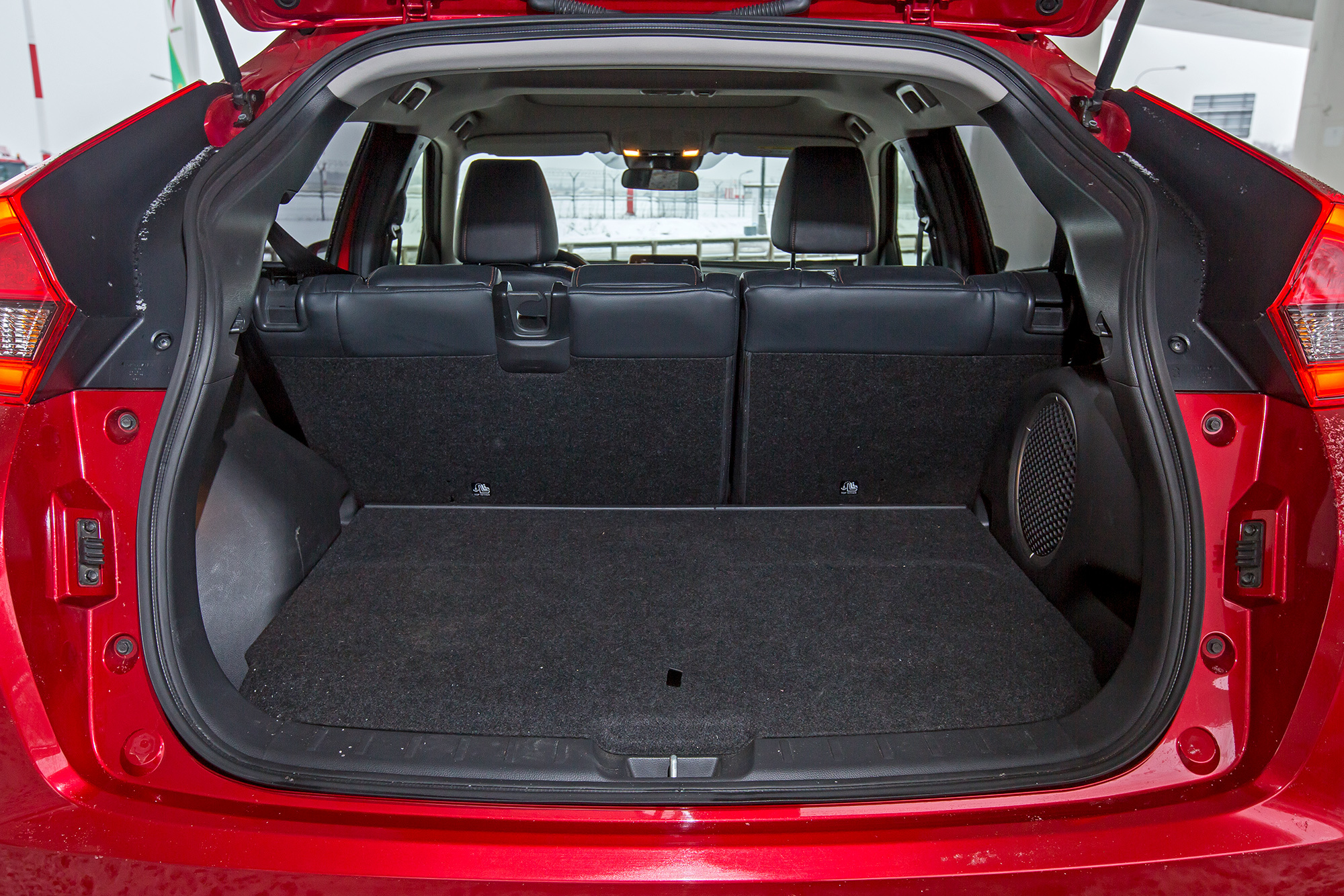 С Эклипсом я уже встречался на европейском тест-драйве. Российская спецификация отличается настройками мотора и металлической защитой при неизменном клиренсе. Полноценная запаска уменьшила багажник с низко открывающейся дверью: он здесь самый маленький, с сильно «горбатым» полом при сложенных задних сиденьях. Зато сами пассажирские места ― наиболее просторные и удобные, с регулировками в продольном направлении и угла наклона спинки. Пространства маловато только над головой высокого седока, но по ширине есть потенциал для перевозки сразу троих. Хотя среднему пассажиру мешает замок его же ремня.
