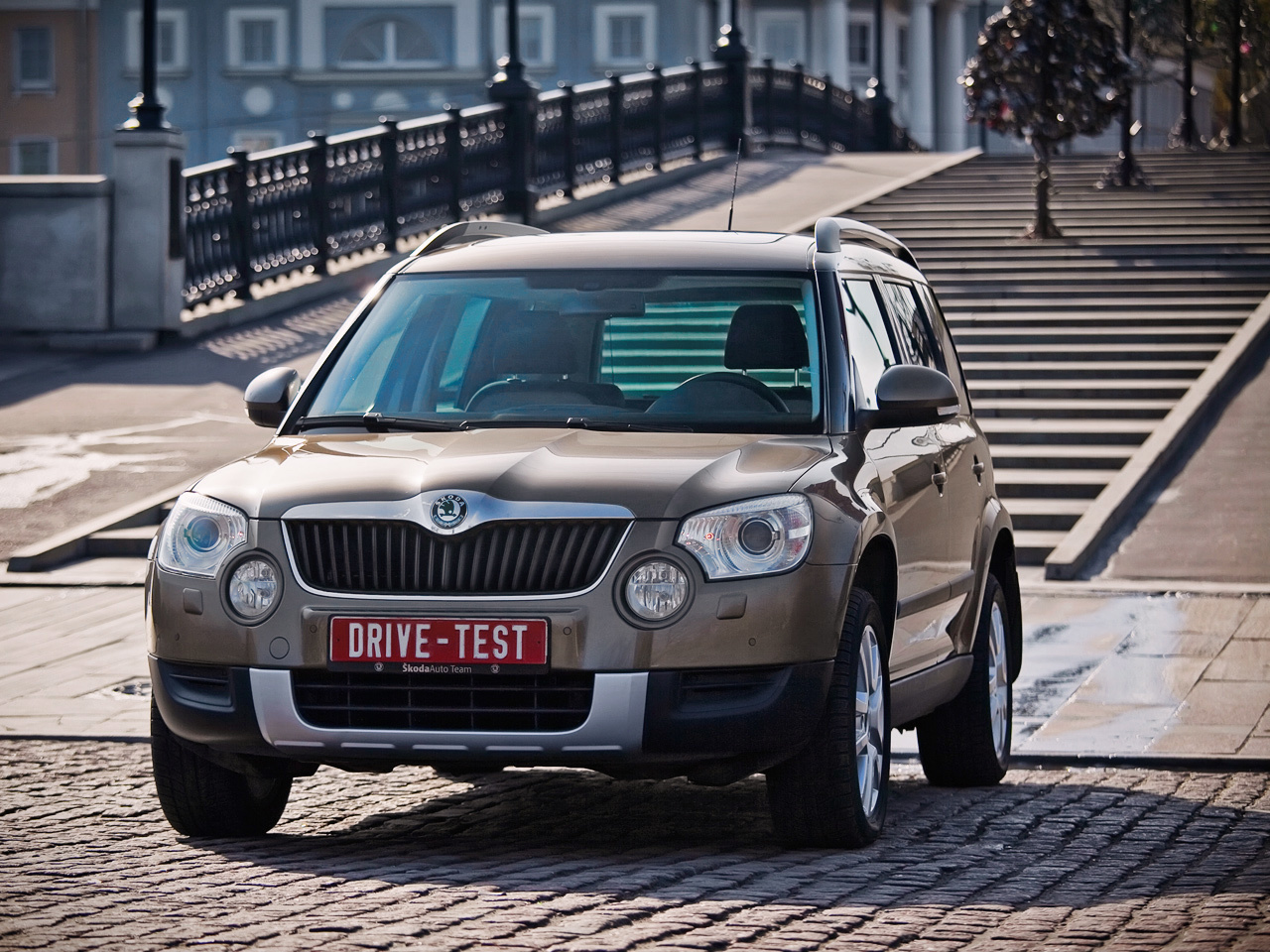 Основная среда обитания наших подопечных — город. Вот с него и начнём. Аккуратно спускаемся с высокого бордюра... и цепляемся нижним рычагом подвески Yeti за камень. Для городского паркура дорожный просвет Шкоды явно маловат — всего 180 мм. Зато уж если «снежный человек» спрыгнул «со скалы» и не покалечился, ему все ветра попутные.