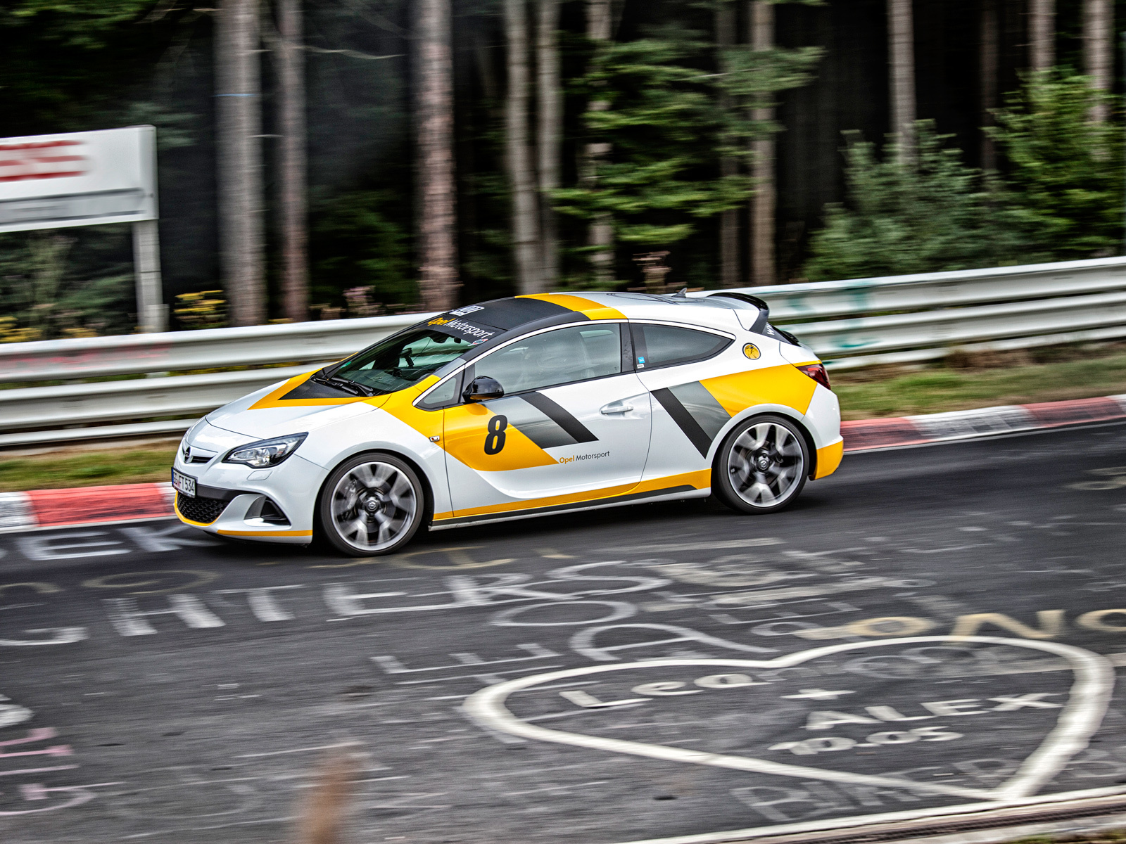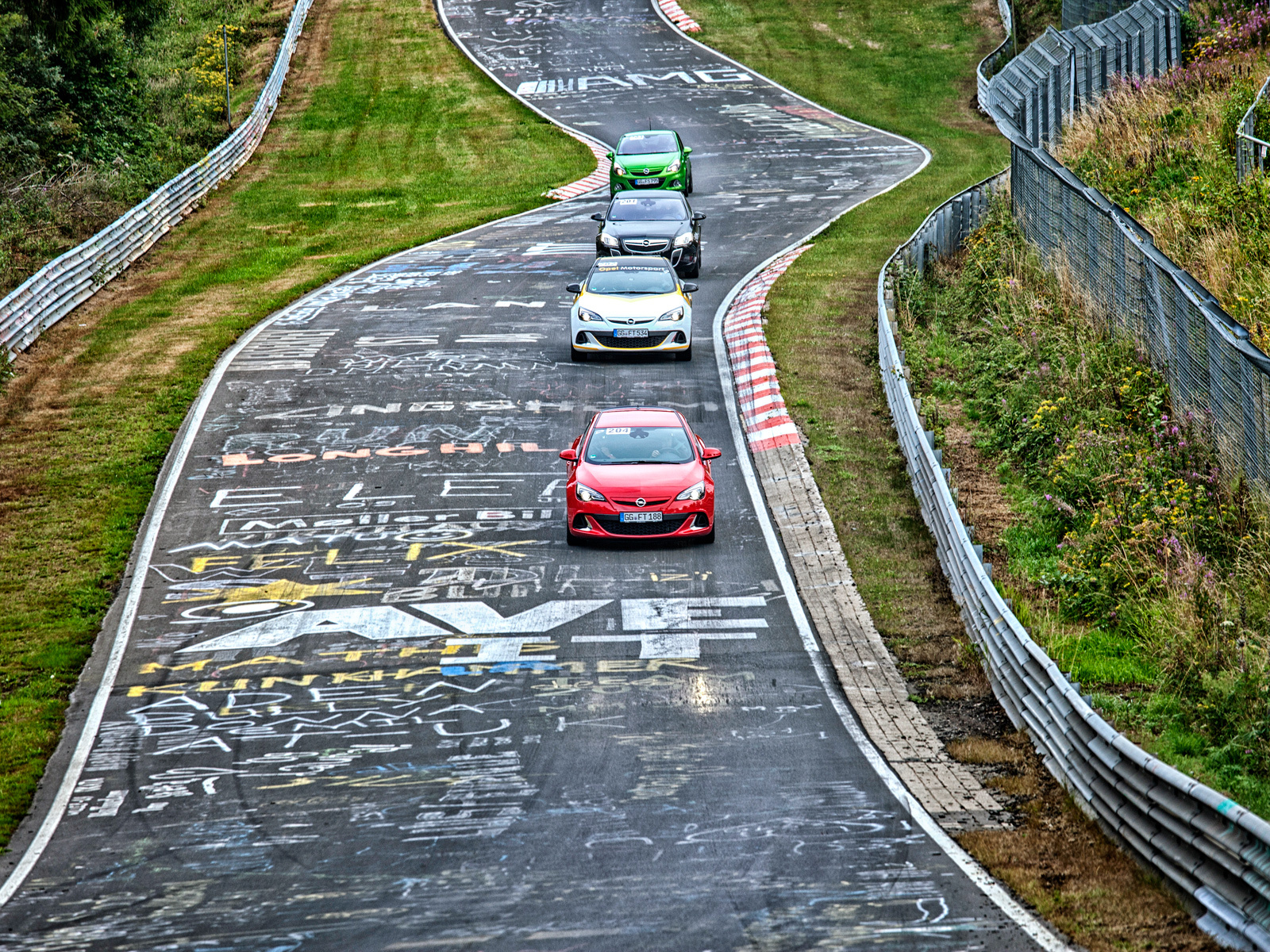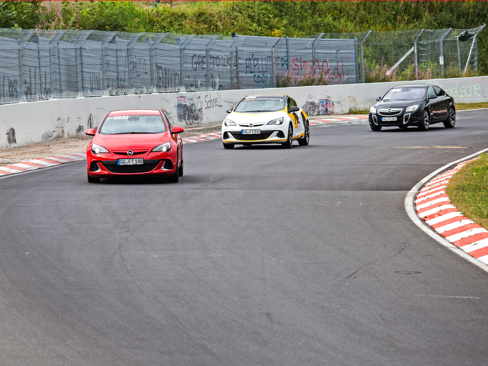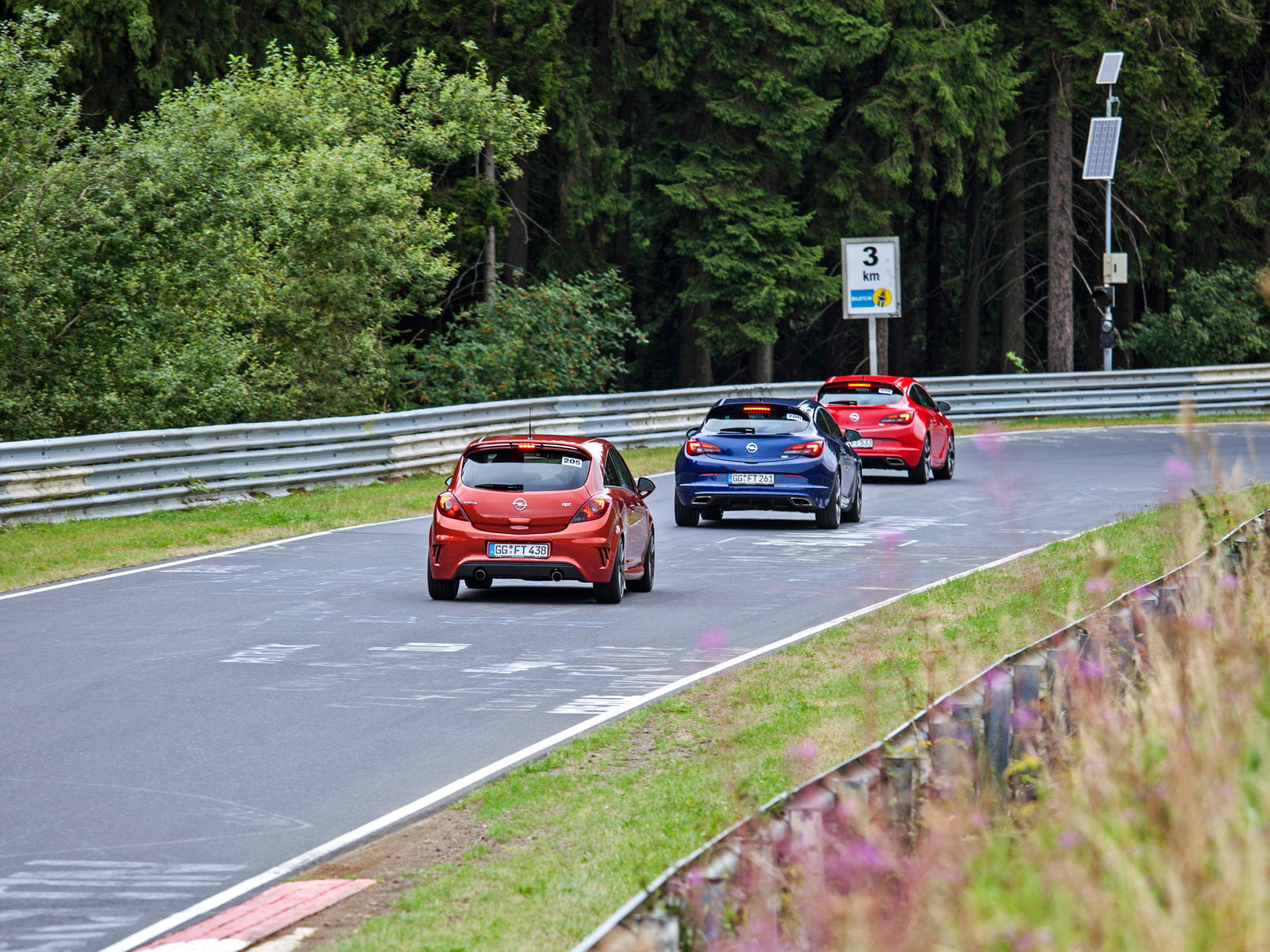 Наконец, собственно наша главная героиня — Astra OPC. В таком окружении она блещет! Она в своей стихии: управляемость, устойчивость и настройка силового агрегата — всё подобрано под требования Нордшляйфе. За рулём трёхдверки понимаешь, почему парочка Астр во главе колонны постоянно отрывается от остальных. Следовать за инструктором легко: у машины всегда есть запас по моменту для разгона, а торможение одновременно и стабильно, как на Инсигнии, и эффективно, как на Корсе.