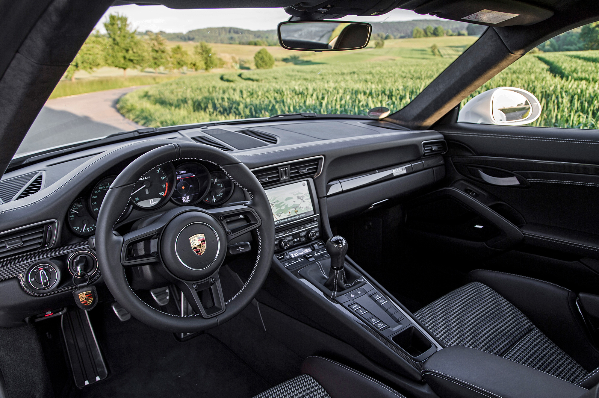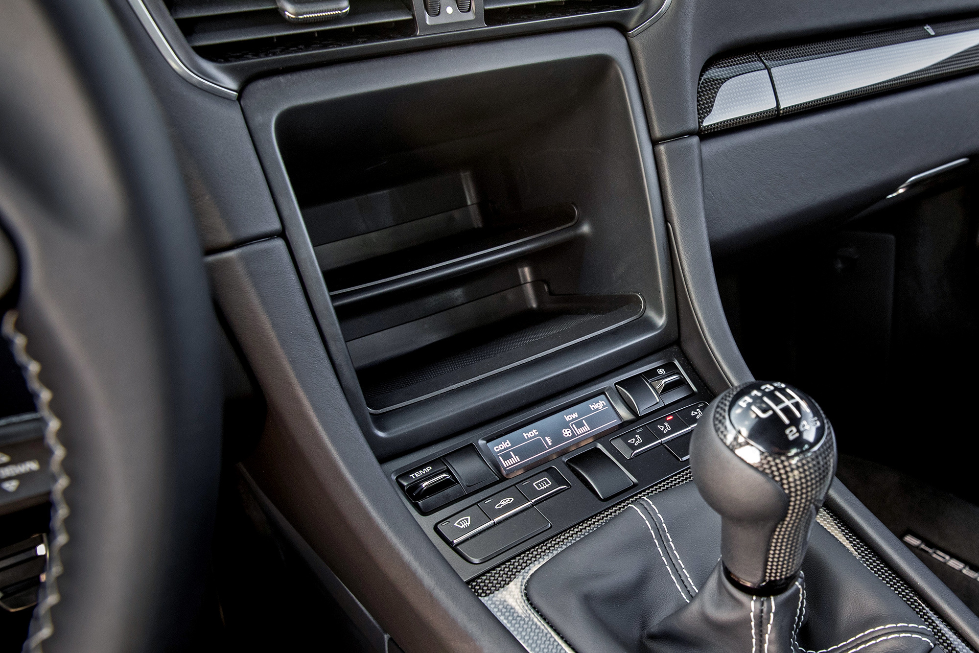 Для таких приверед тут тяжёлая, длинноходная левая педаль, связанная с жёстким однодисковым сцеплением, и облегчённый маховик. В описании этой опции Porsche предупреждает: так шумнее, больше вибраций и проще заглохнуть. Точно — глушу раз пять за день, потому что туговато для тонкой работы. А рычаг «механики» движется свободно, хотя без легкомысленности. Продольные ходы по-поршевски внушительны, но это никак не влияет на чёткость. Рука сама тянется к хваткому углепластиковому набалдашнику. Всё-таки шесть передач — золотой стандарт!