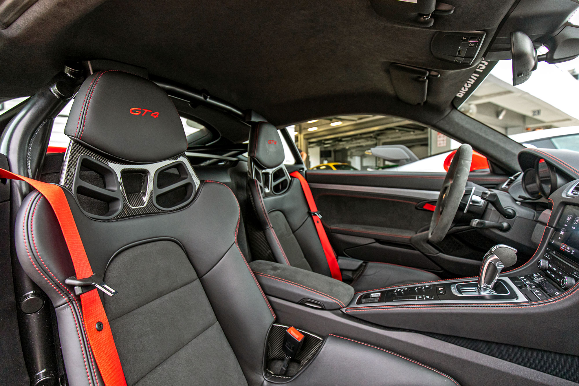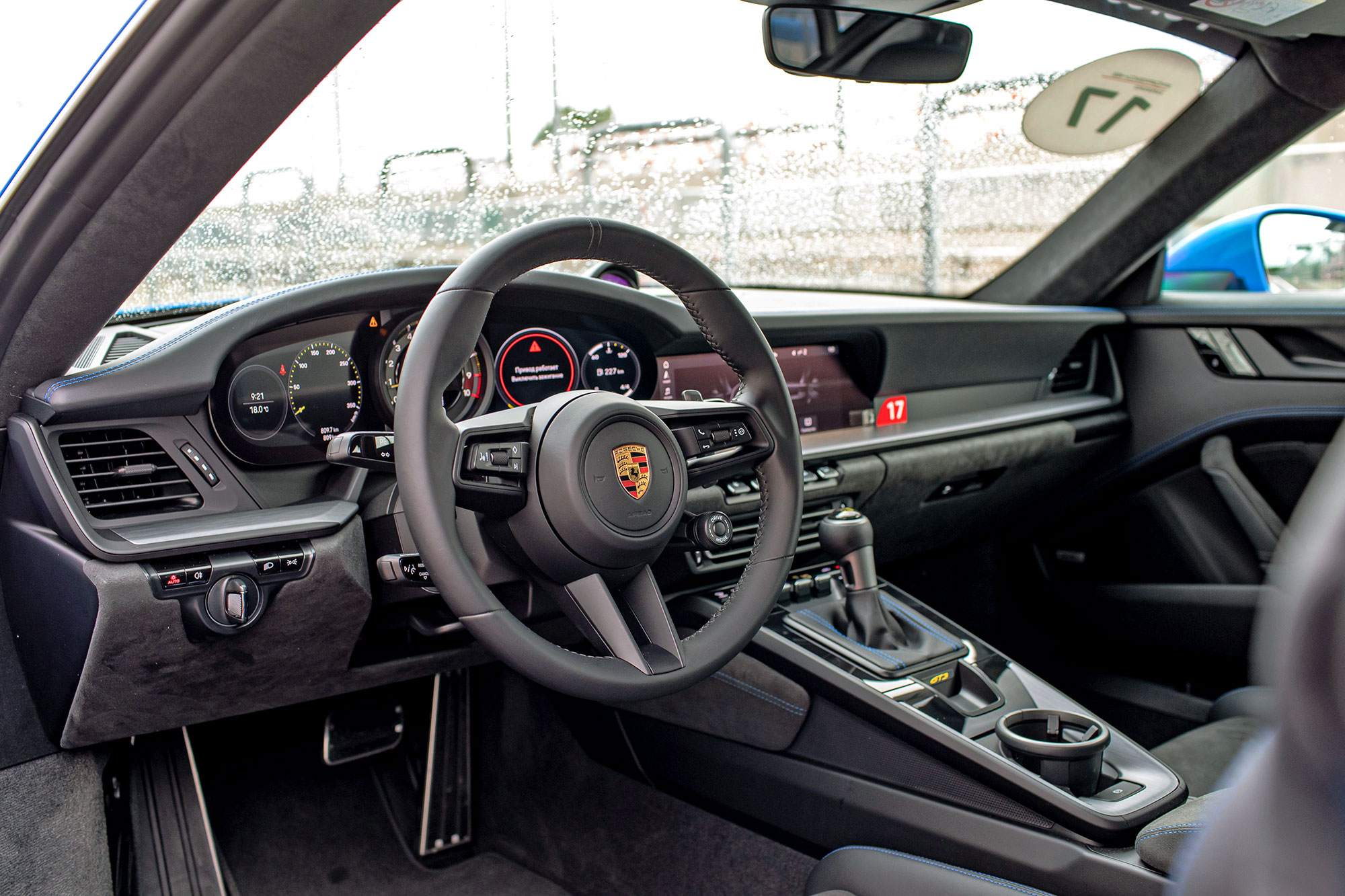 В салоне GT3 эффект новизны слегка притупляют углепластиковые кресла, не первый год кочующие по модельному ряду Porsche. Выкройка обивки слегка изменена для поколения 992, но базовые недостатки остались прежними. Сидишь высоковато, спинка свободна, и её нельзя сложить, что затрудняет доступ в заднюю часть салона. Допустим, с пакетом Clubsport позади кресел не разгуляешься из-за каркаса, но даже туда иногда что-то нужно положить.