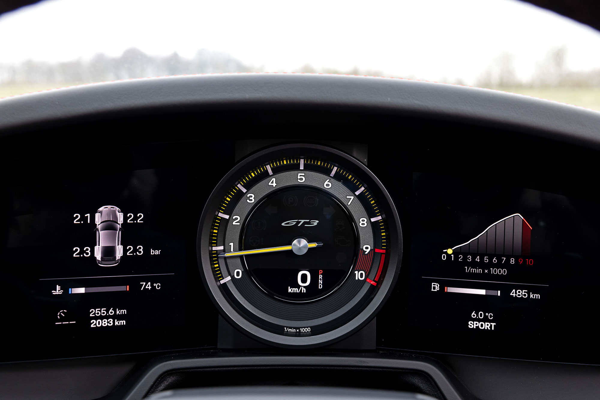 Что касается немилого мне цифрового интерьера, то на треке на него не обращаешь внимания. Причём для приборной панели Флахт внедрил режим трёх циферблатов — грубо говоря, как в Каймане. Это довольно иронично, учитывая упорство, с которым Porsche цепляется за традиционную раскладку с пятью шкалами. Хотя на 992-м виртуальные приборчики по краям всё равно перекрыты рулём.