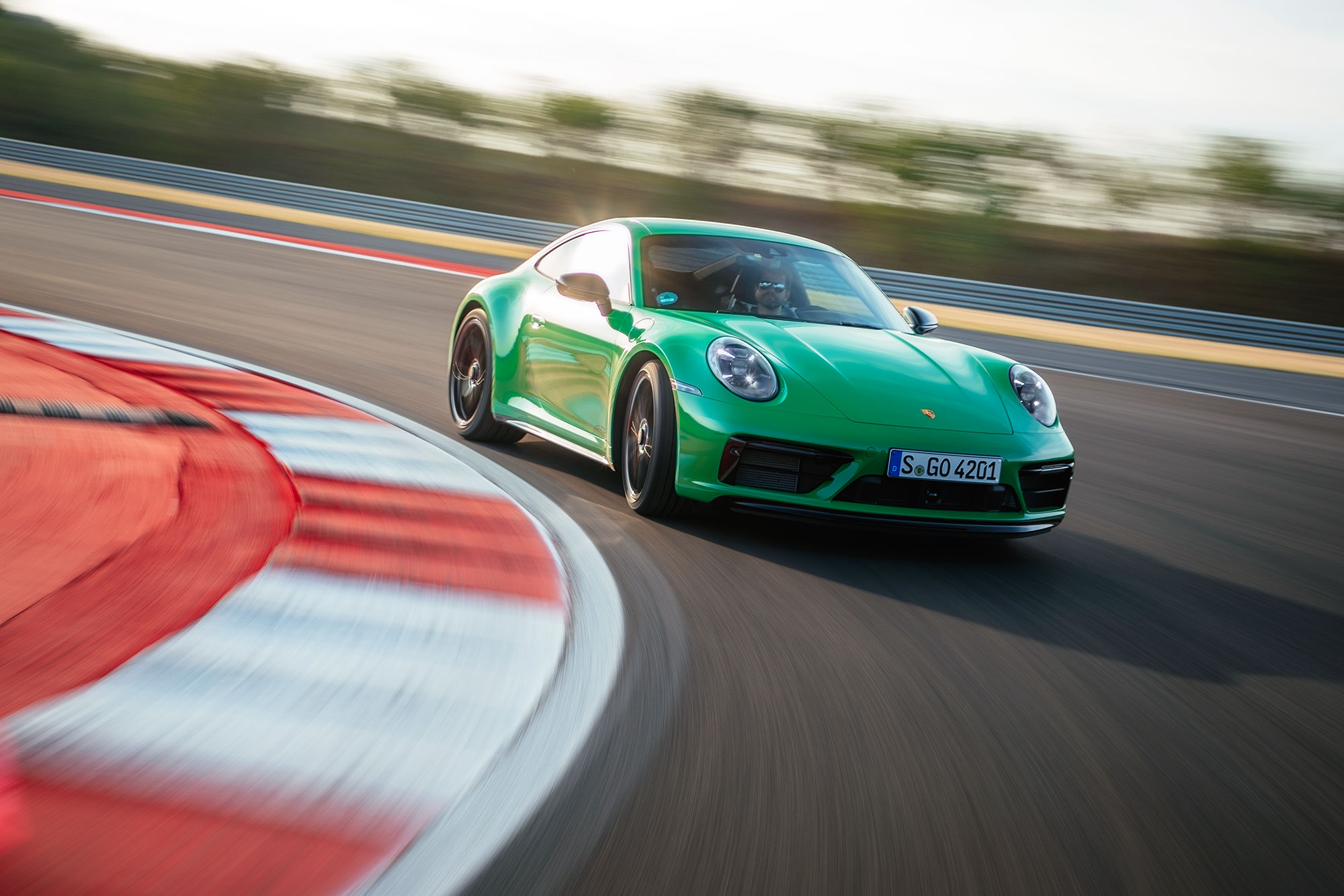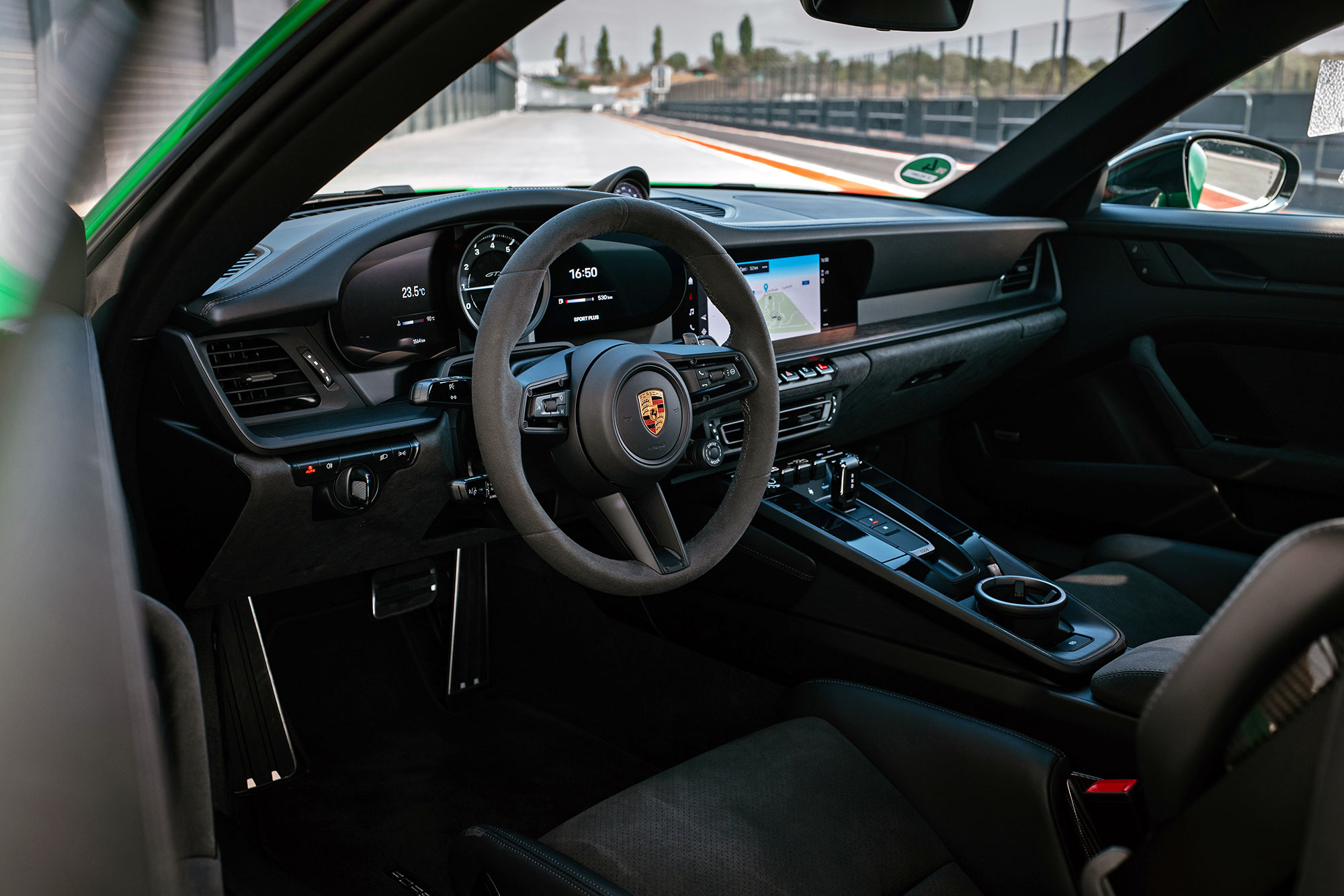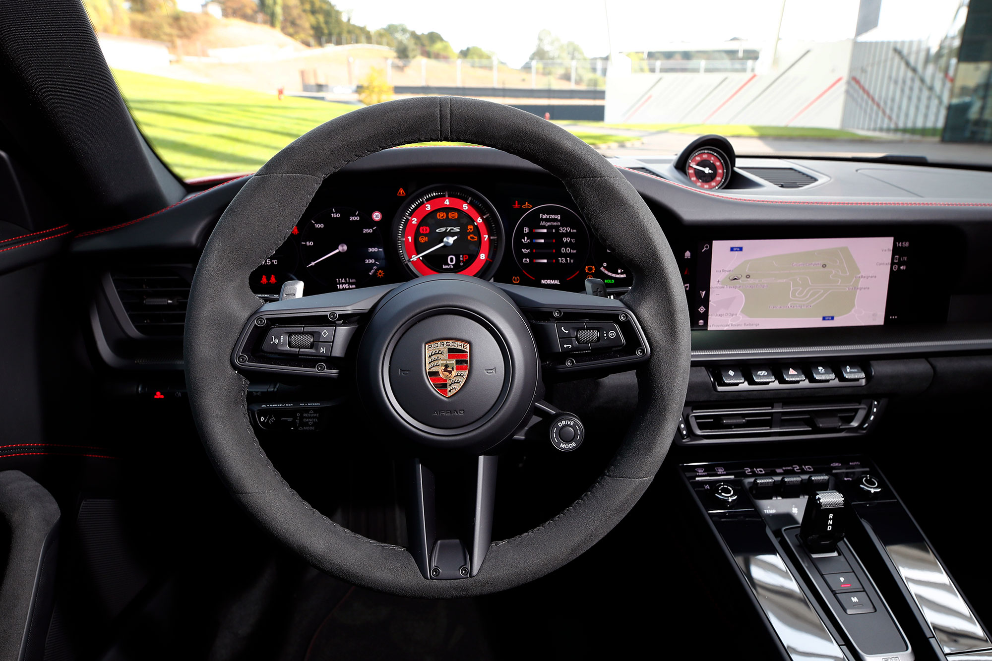 Мне довелось уже изрядно поездить на разных Porsche серии 992 по треку — и всё же не перестаю удивляться держаку, который они развивают на дорожных шинах. В данном случае это Pirelli P Zero. Факт — новейшие «девятьсот одиннадцатые» нужно как следует пришпорить, чтобы всё встало на свои места. На треке Porsche сбрасывает маску дорожного спокойствия и сразу показывает серьёзную скорость. Настолько, что заданный немецким инструктором темп кажется чересчур сдержанным. Впрочем, меньше всего организаторам хочется видеть дыру размером с 911-й в новеньком отбойнике, так что их можно понять.