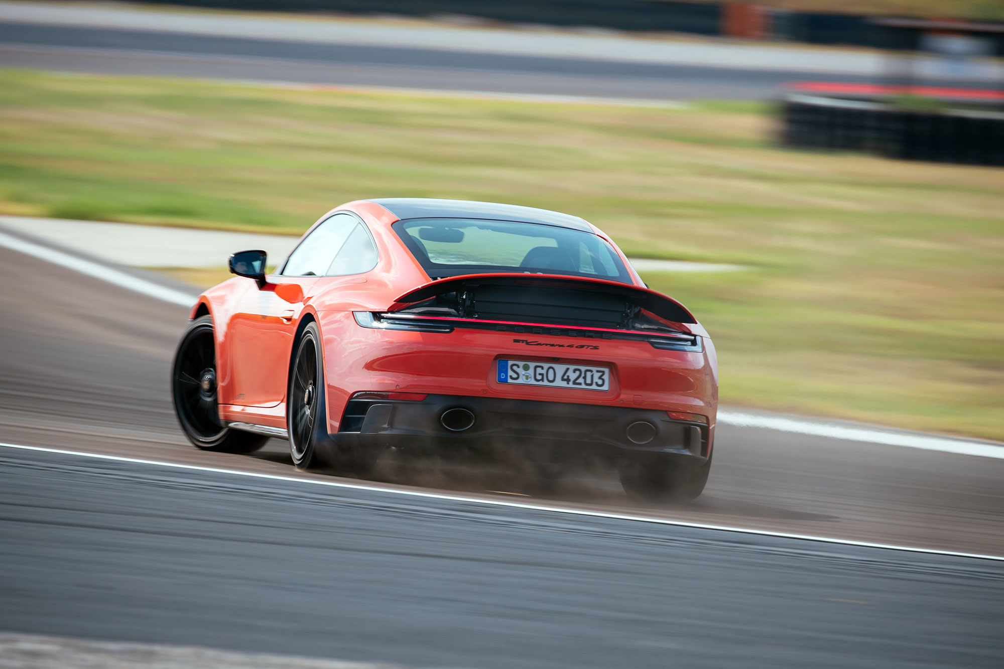 Когда меняешь полноприводный GTS на заднеприводный, становится очевидно, что этот зелёный веселее. Не думаю, что его время круга ощутимо лучше. Но с передней оси сброшены 50 кг, усилие на руле очищено от влияния приводных валов — и всё это придаёт базовому «гэтээсу» ощущение большей свободы. Он кажется легче, острее и ещё точнее. В нём появляется настроение сказать пару слов для «Закадра» — в конце статьи вы найдёте небольшое POV-видео.