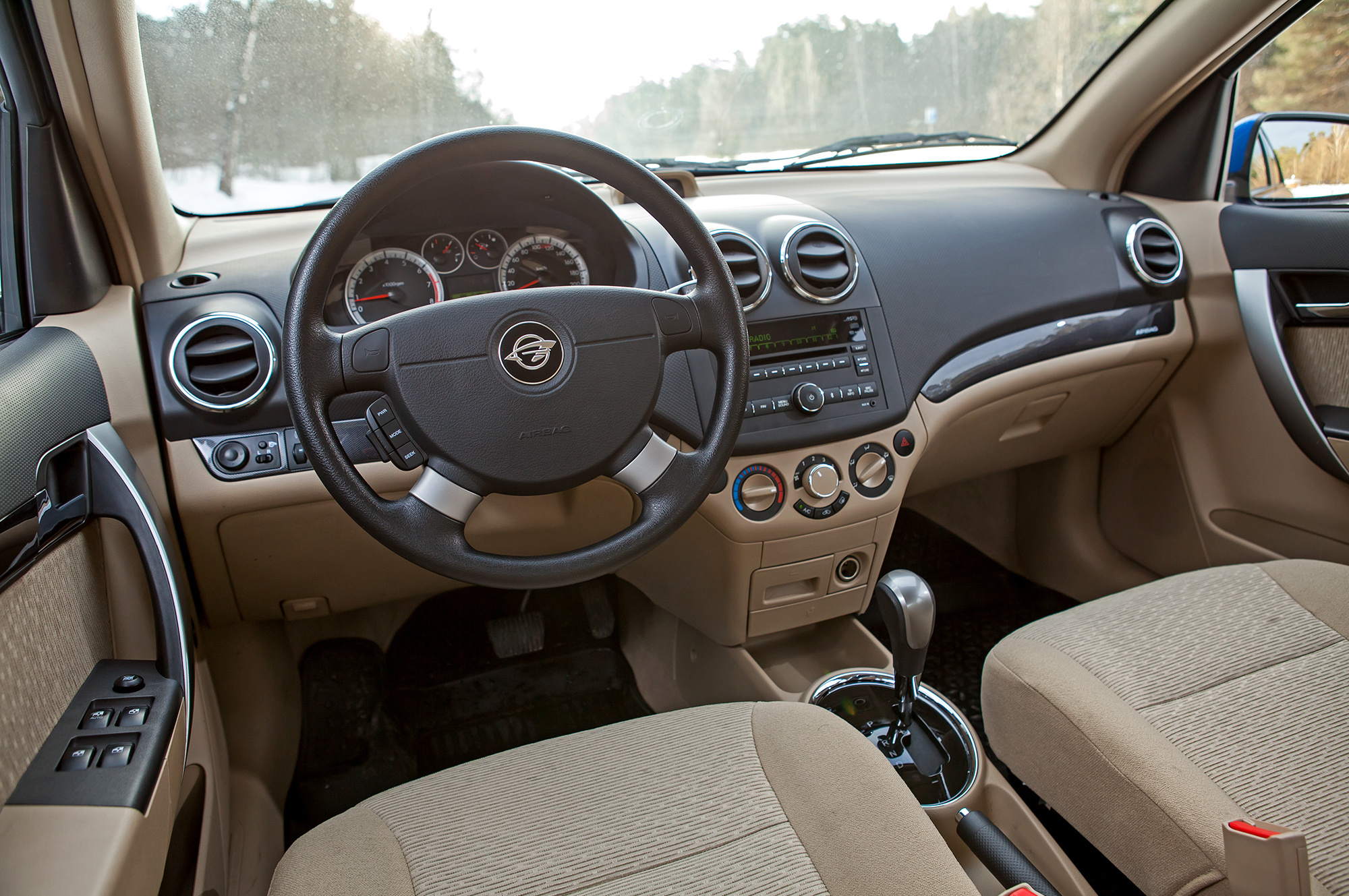 Слева от руля «элегантной» Нексии есть кнопка складывания зеркал, справа — работающее через два раза на третий bluetooth-соединение с магнитолой. Однако нет подогрева сидений и — при всей центральности замка — кнопки запирания дверей. Уселся за руль, дал по шапке «солдатику», и мой Ravon — моя крепость. Быстро выскочить из машины в случае чего не удастся: чтобы разблокировать замки, нужно изворачиваться и тянуть штырёк вверх. Селектор трансмиссии — в «Драйве», руки — на тонком руле десятилетнего Aveo с кнопками клаксона на верхних спицах. Баранка непривычная, но удобная и лёгкая в обращении — на парковке её повернёт и ребёнок.