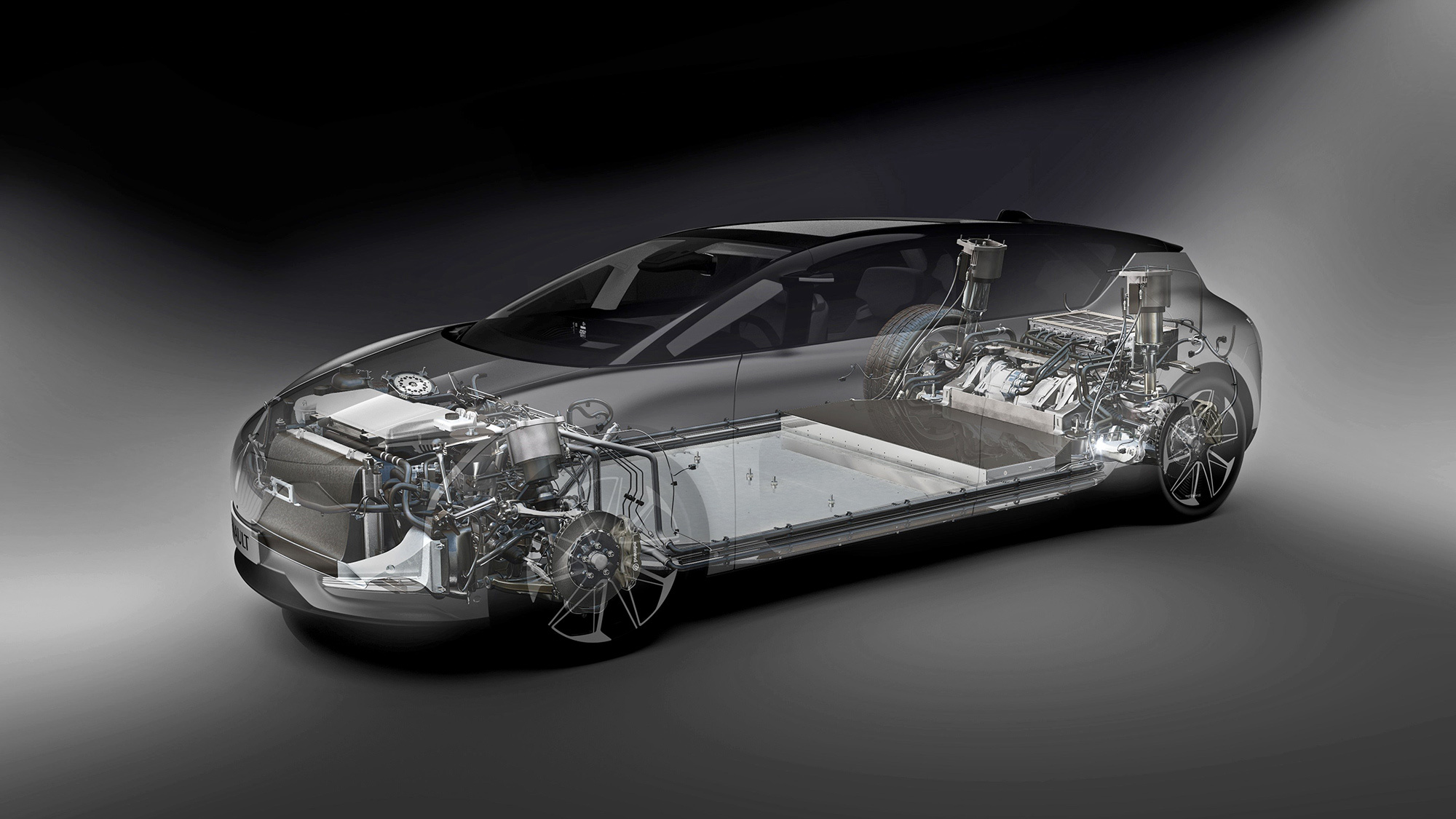 Symbioz — первый носитель новой гибкой электромобильной платформы, напоминающей архитектурой Теслу. Кузов выполнен из стали с алюминием, под полом — плоская батарея ёмкостью до 100 кВт•ч, как у топовых Model S и Model X. Отличительная особенность Renault — полноуправляемое шасси. В детали инженеры не углубляются, намекая, что не стоит ждать серийный Symbioz. Появятся иные электромобили разного размера. На прототипе установлено по электродвигателю на заднее колесо. Заявленная пиковая мощность — аж 680 сил. Мне удаётся проехать короткий отрезок самому — их там сильно меньше.