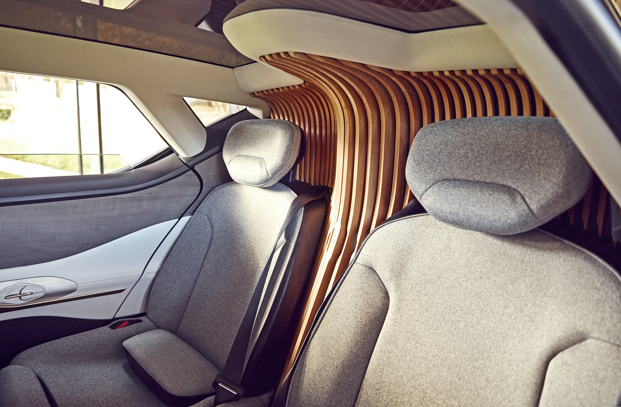 Вживую интерьер отличается от того, что видишь на вылизанных снимках, и сделан грубее. Пластик выполнен по обходной технологии, кривовато подогнаны панели, что-то поскрипывает и гремит на неровностях, а противосолнечные козырьки болтаются. Мониторы вместо зеркал заднего вида кажутся чужеродными. Вместо трёх основных экранов просится одна панель. Но общий домашний стиль нравится. Центральной консоли нет, кнопок минимум, а воздуха максимум. Хороша атмосферная подсветка. Судя по разным концептам, таким салон беспилотника видится многим дизайнерам, и это прекрасно. Вот бы провести тут автономный часок по дороге со съёмок...