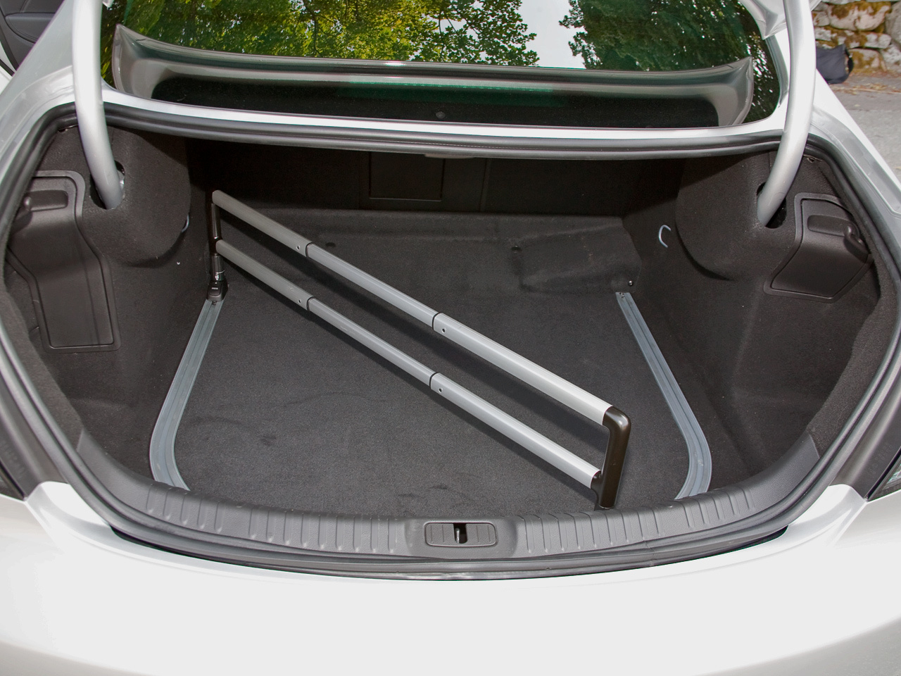 - Багажник снабжён опелевской раздвижной перегородкой, которая движется тут по U-образной направляющей. Делить полезное пространство «по интересам» очень удобно: например, если нужно зафиксировать небольшую, но ценную сумку вроде кофра с фотоаппаратом.
