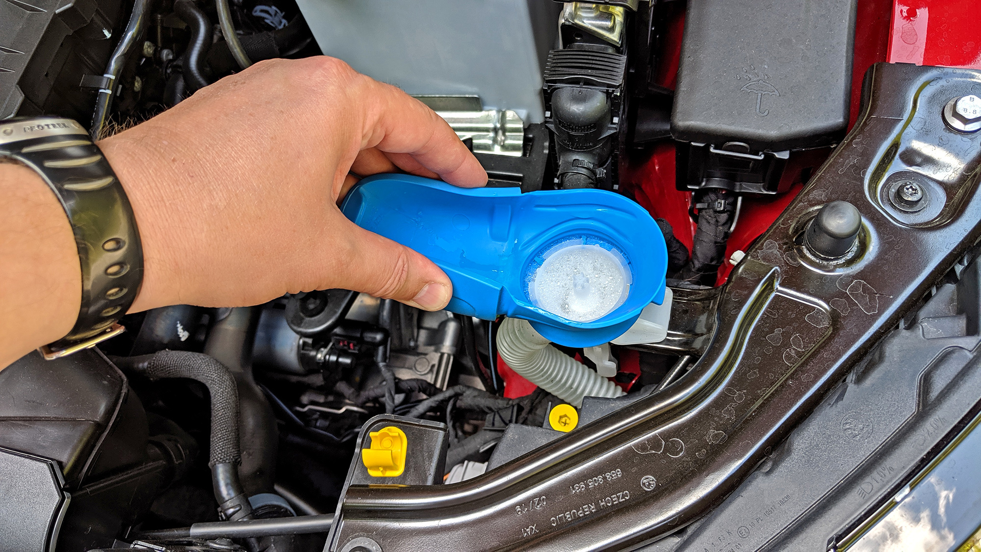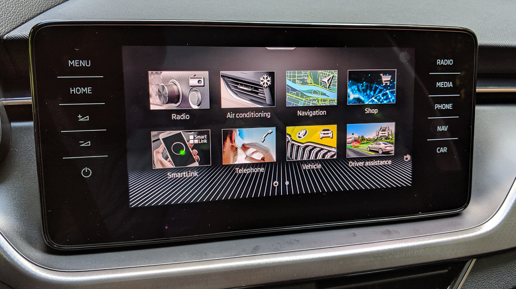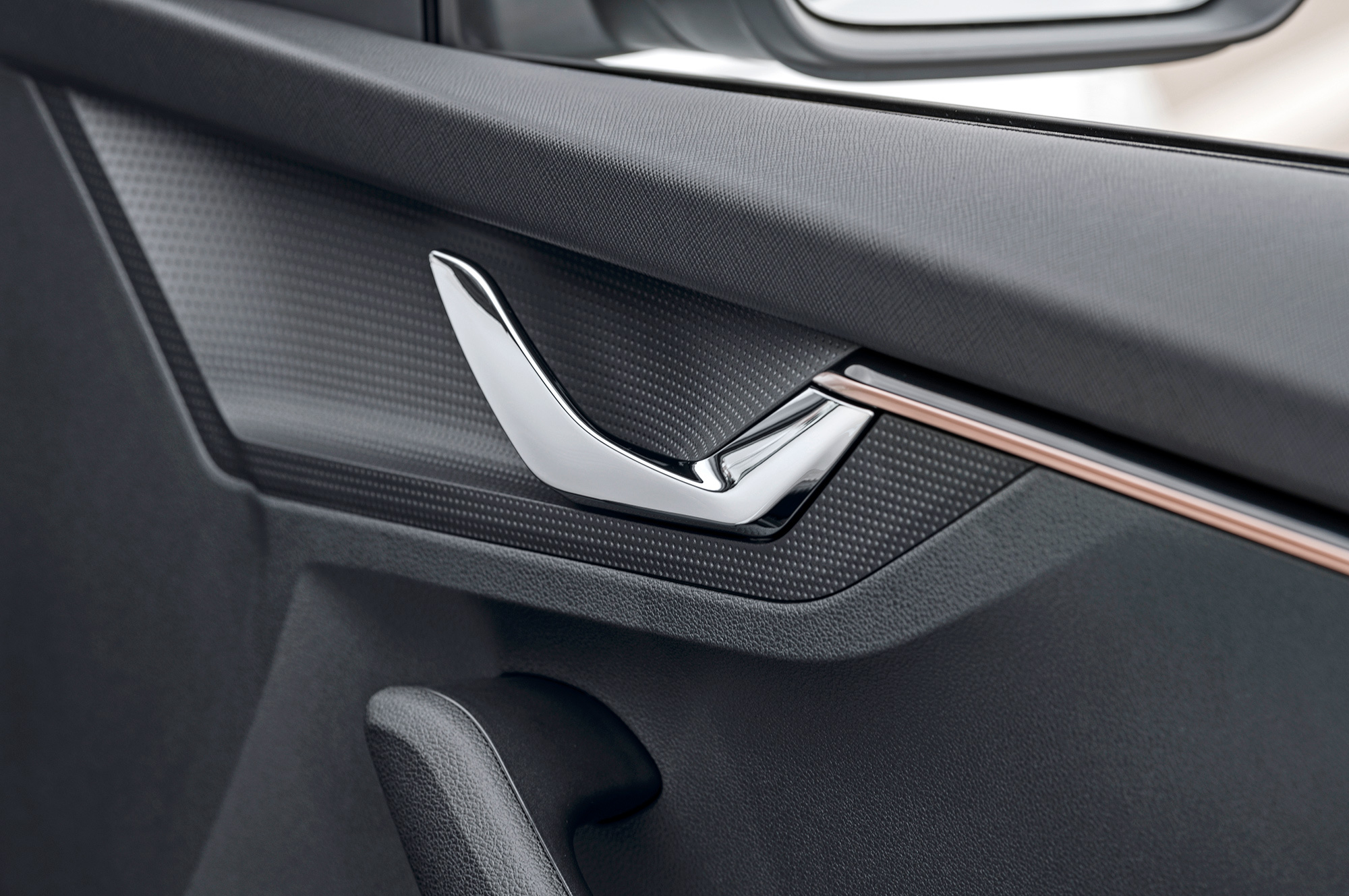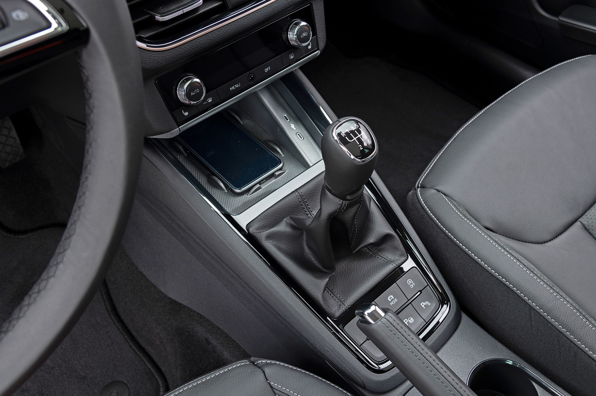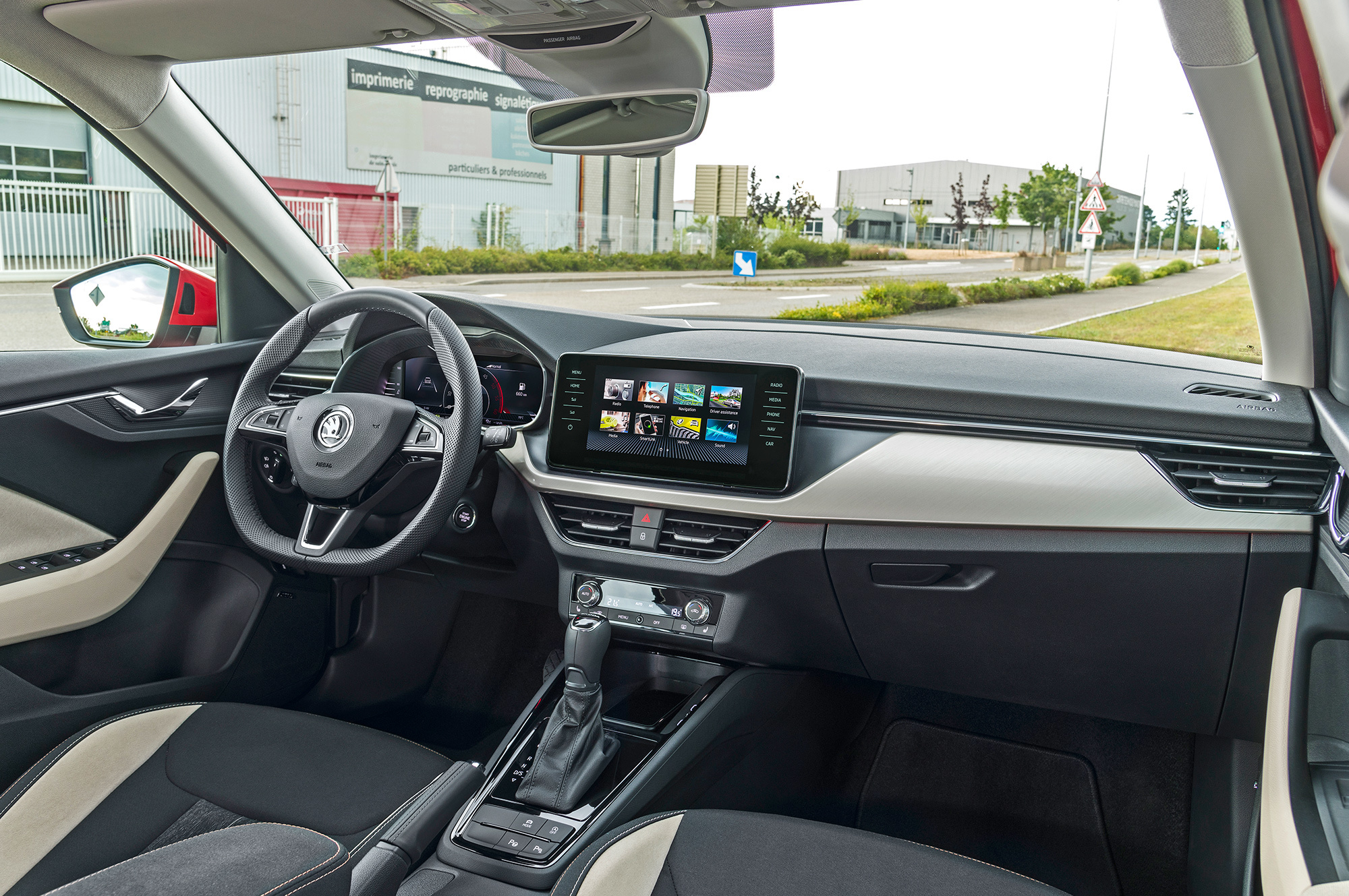 Не по-шкодовски интересный интерьер удачно обрамляет высоко выставленный центральный экранище. Качество отделки достойно, козырёк приборного щитка и передних дверных панелей выполнены из мягких материалов. Цифровые приборы, электропривод двери багажника, выезжающий из-под бампера фаркоп, не говоря уж про шкодовские фенечки типа зонтика или фонарика и выдвижных защитных кантов дверей… Кажется, никогда список опций для машины ценой от 18 000 евро в Германии не был столь богат.