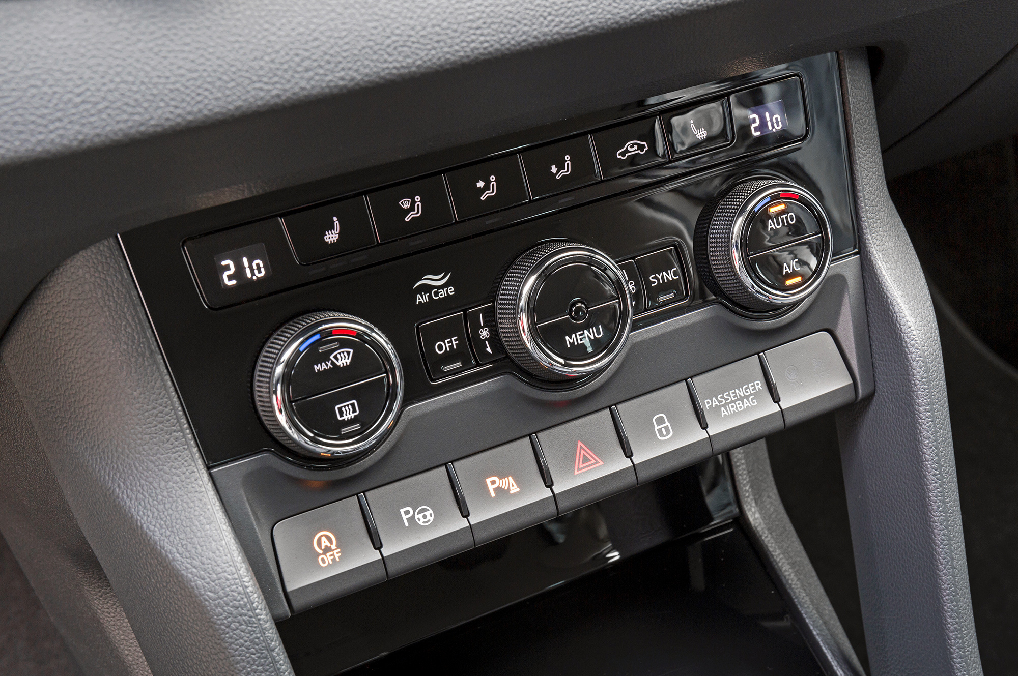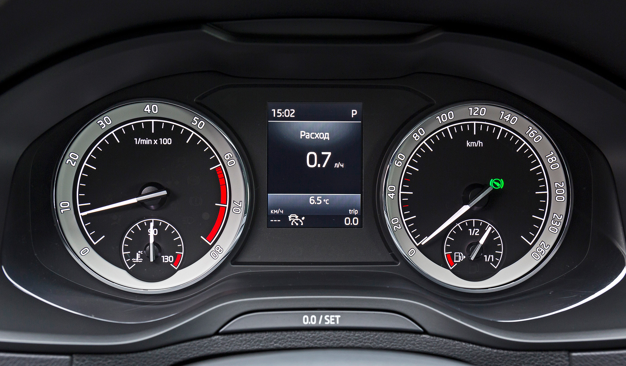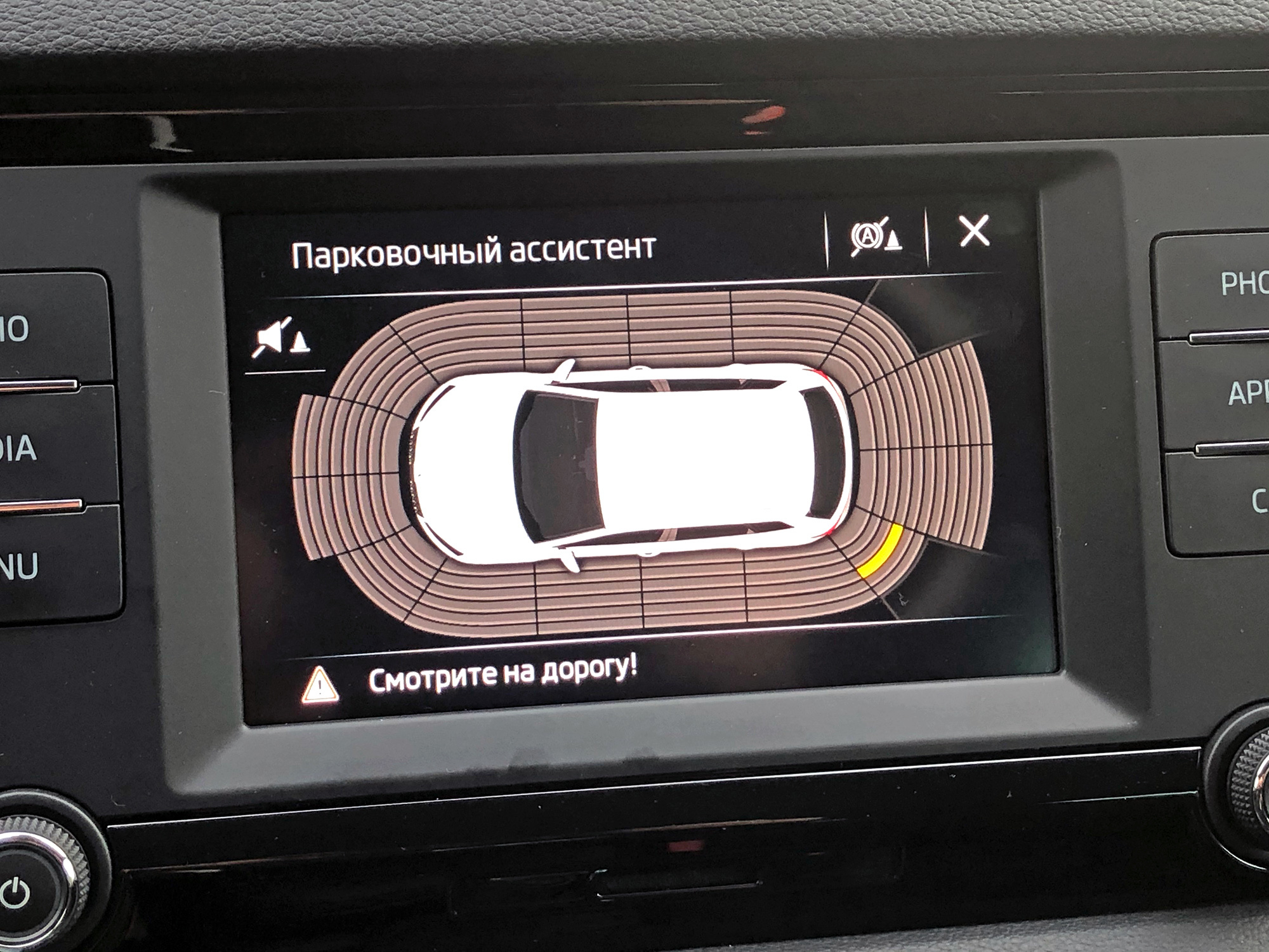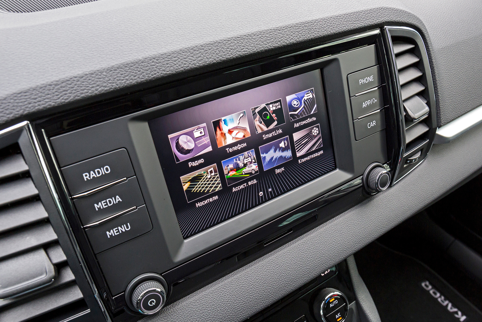 Мягкого пластика хватило только на переднюю панель. Её формой Karoq напоминает старший Kodiaq. Обшивка дверей грубовато-пластмассова. Аналоговые приборы чуть подпорчены типичной для Шкод радиальной оцифровкой и серым фоном шкал — без него показания читались бы лучше. Мультимедийка Swing с небольшим дисплеем (всего шесть с половиной дюймов по диагонали) и крупными кнопками по краям смотрится бедненько.