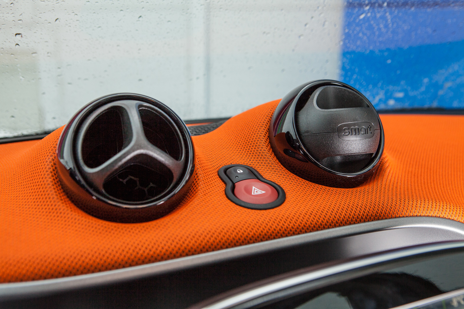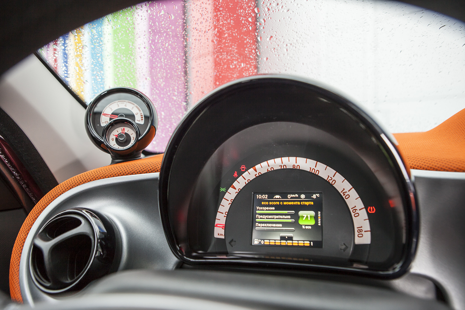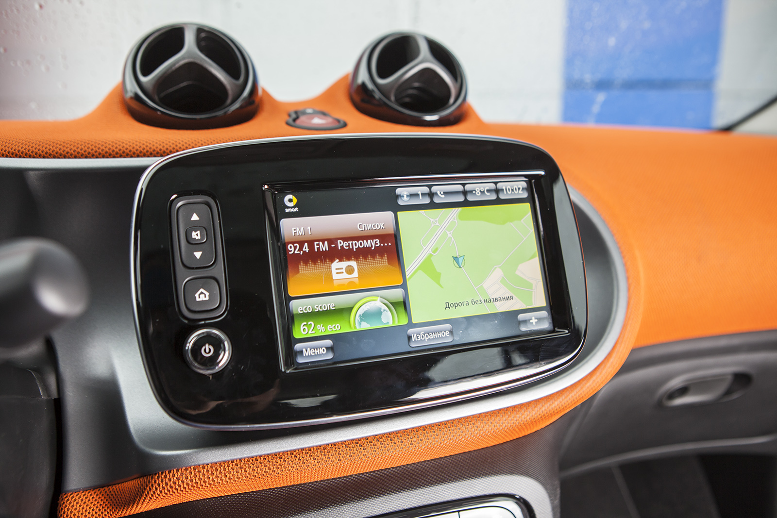 На самом деле реношность Смарта меня не пугает — после счастливых лет за рулём хот-хэтча Clio RS на эти дверные ручки, джойстик регулировки зеркал, кнопки стеклоподъёмников и потолочный плафон освещения я смотрю с ностальгией. Но как быть тем, для кого Renault — это бюджетные модели? Концентрироваться на чисто смартовских элементах! Благо их тут немало: блок климат-контроля с прозрачным ползунком на температурной шкале, воздушные дефлекторы, намекающие на фамильную принадлежность машинки, красивый руль с удобными кнопками — и, наконец, дисплей борткомпьютера с качественной картинкой.