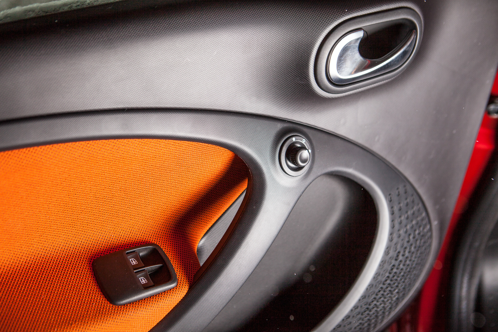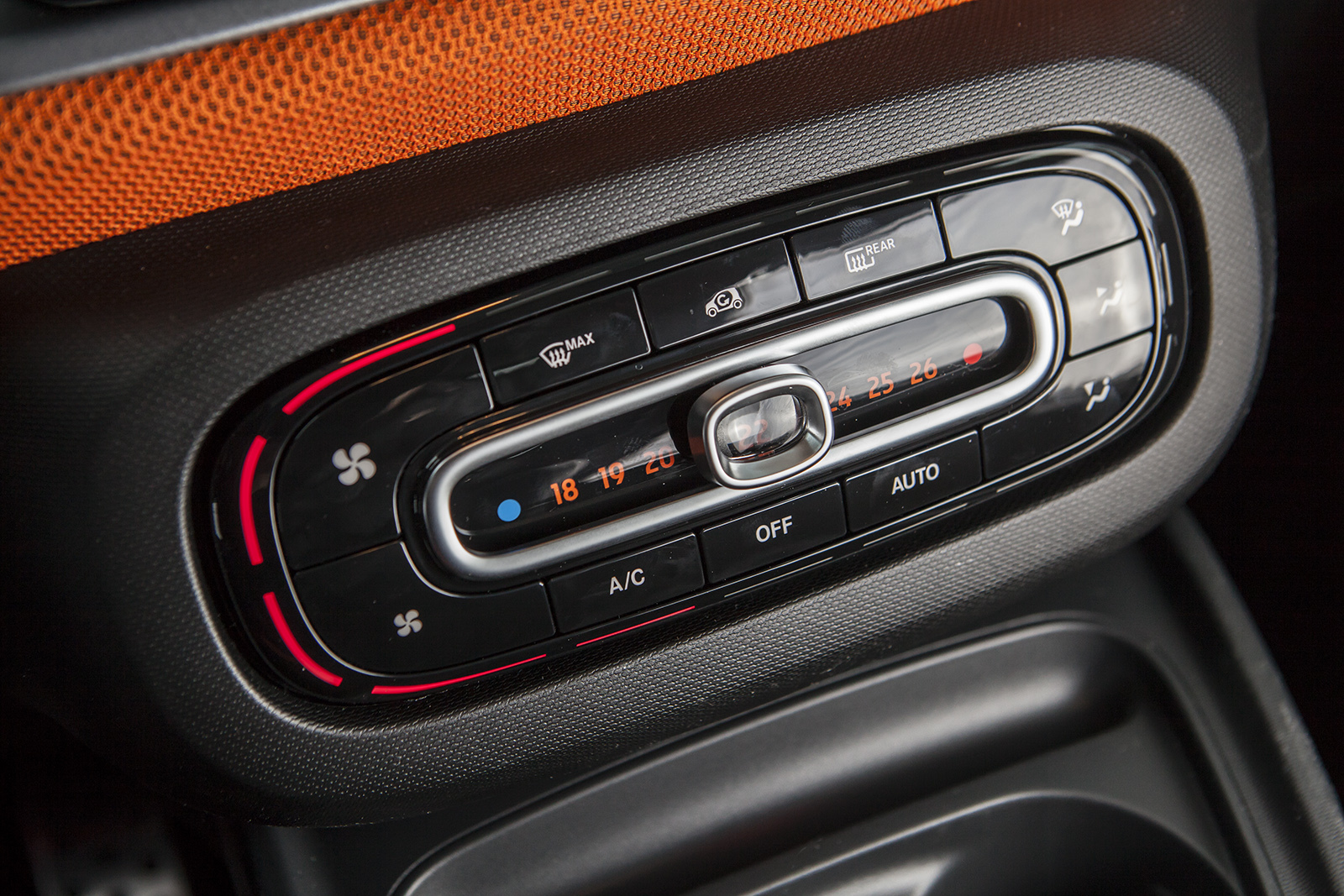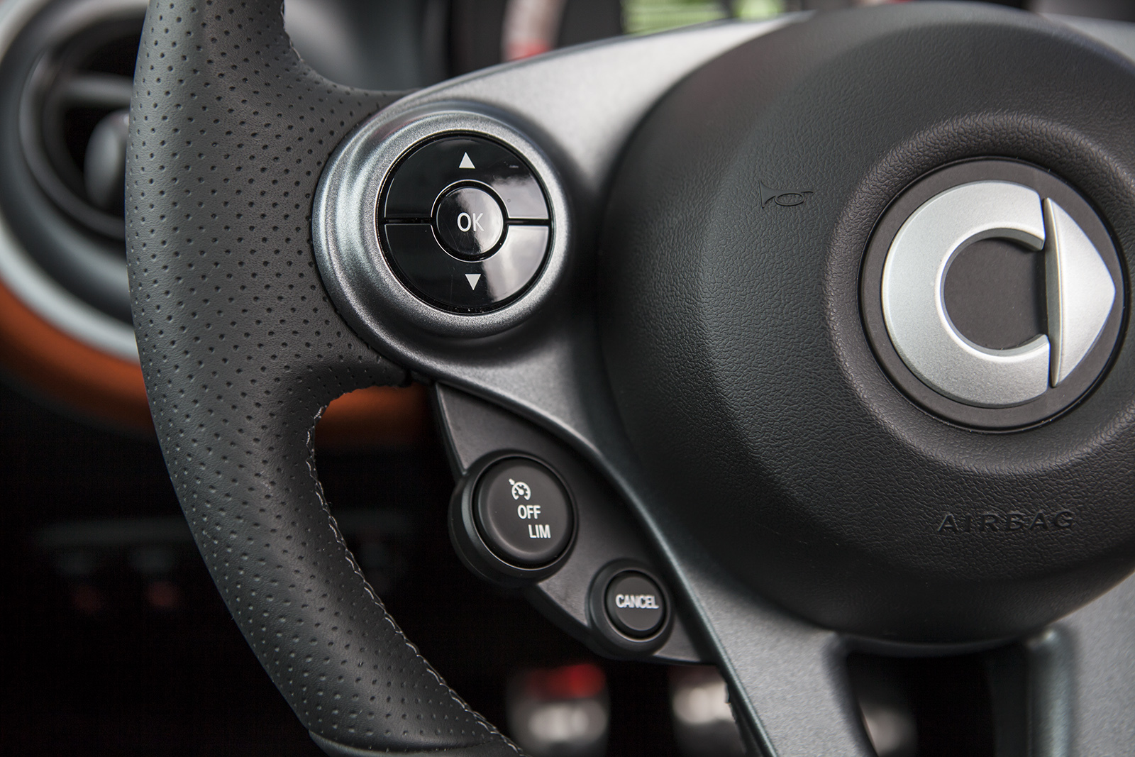 На самом деле реношность Смарта меня не пугает — после счастливых лет за рулём хот-хэтча Clio RS на эти дверные ручки, джойстик регулировки зеркал, кнопки стеклоподъёмников и потолочный плафон освещения я смотрю с ностальгией. Но как быть тем, для кого Renault — это бюджетные модели? Концентрироваться на чисто смартовских элементах! Благо их тут немало: блок климат-контроля с прозрачным ползунком на температурной шкале, воздушные дефлекторы, намекающие на фамильную принадлежность машинки, красивый руль с удобными кнопками — и, наконец, дисплей борткомпьютера с качественной картинкой.