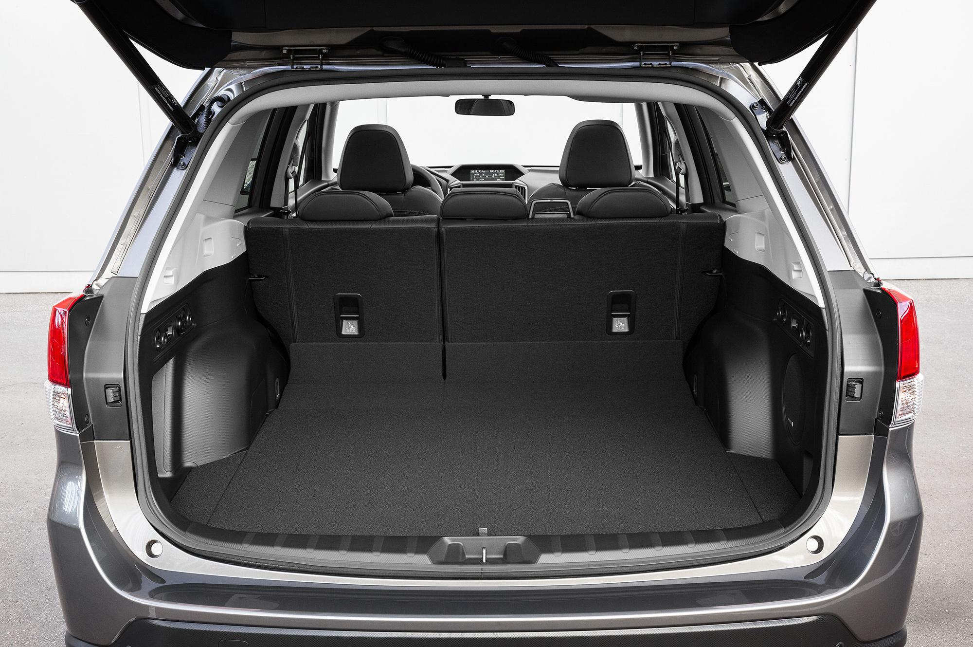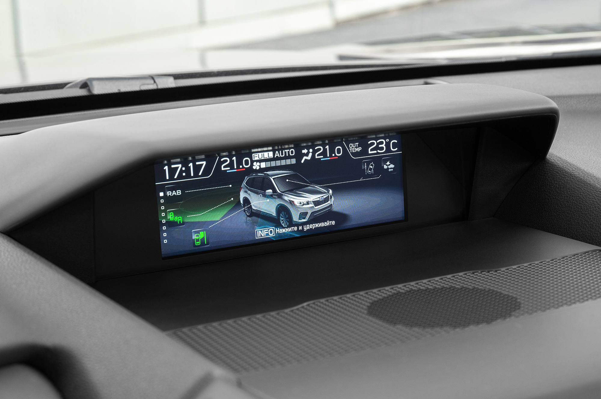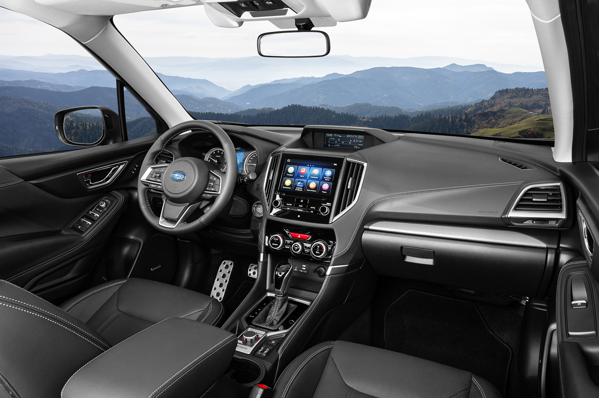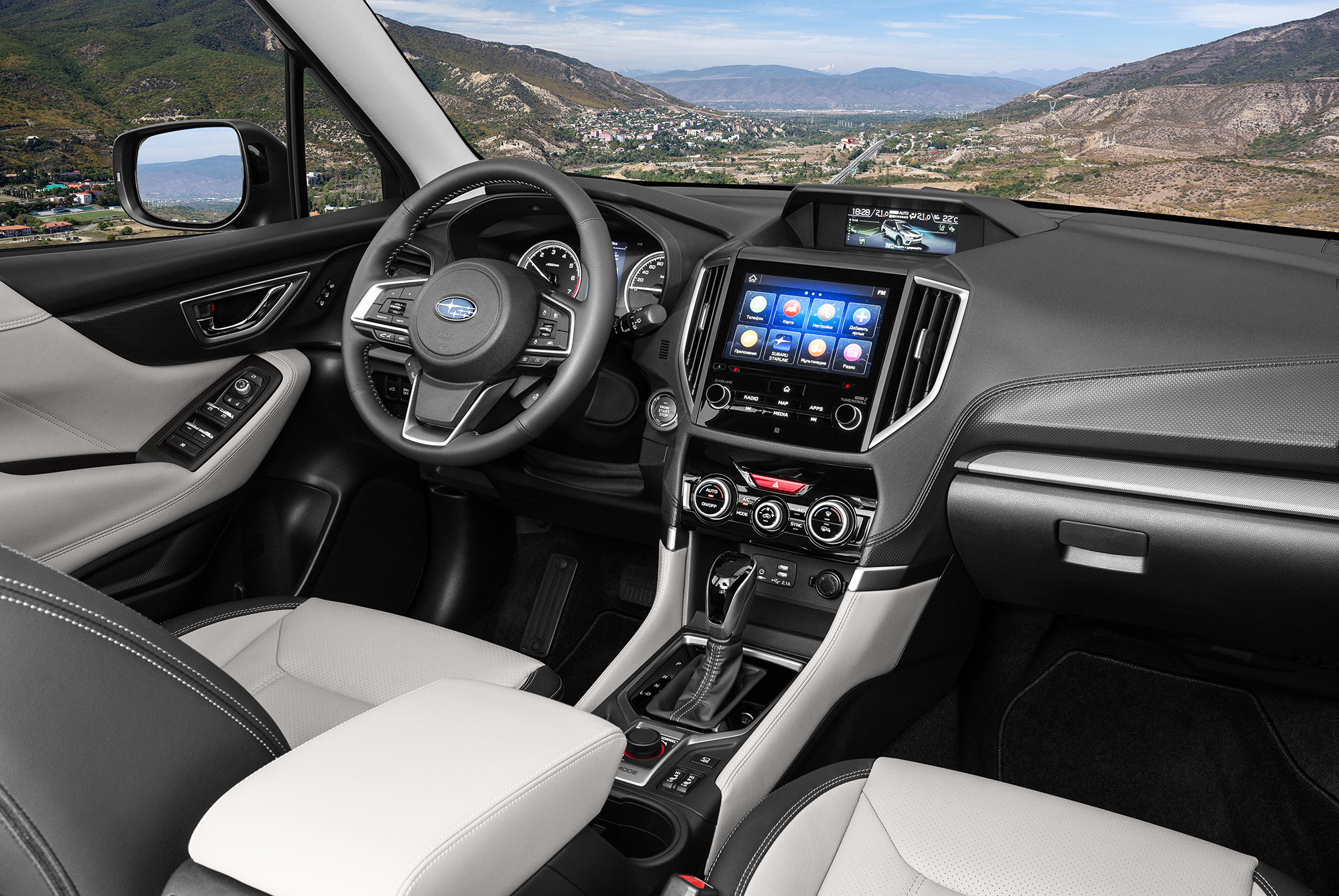 Интерьер сохранил привычные субароводам компоновочные решения вроде двух цветных дисплеев (на верхний, в частности, выводится картинка с бордюрной камеры «правого вида»). Добротная отделка сочетается с экономией: стрелочные приборы снабжены лишь небольшим дисплеем, жестковатое кресло лишено регулировки поясничного подпора, бардачок ― охлаждения, а салонный свет, за исключением пары диодов, сохраняет верность лампам накаливания. А вот обзорность благодаря высокой крыше и большим стёклам — отменна, и к эргономике вопросов почти нет.
