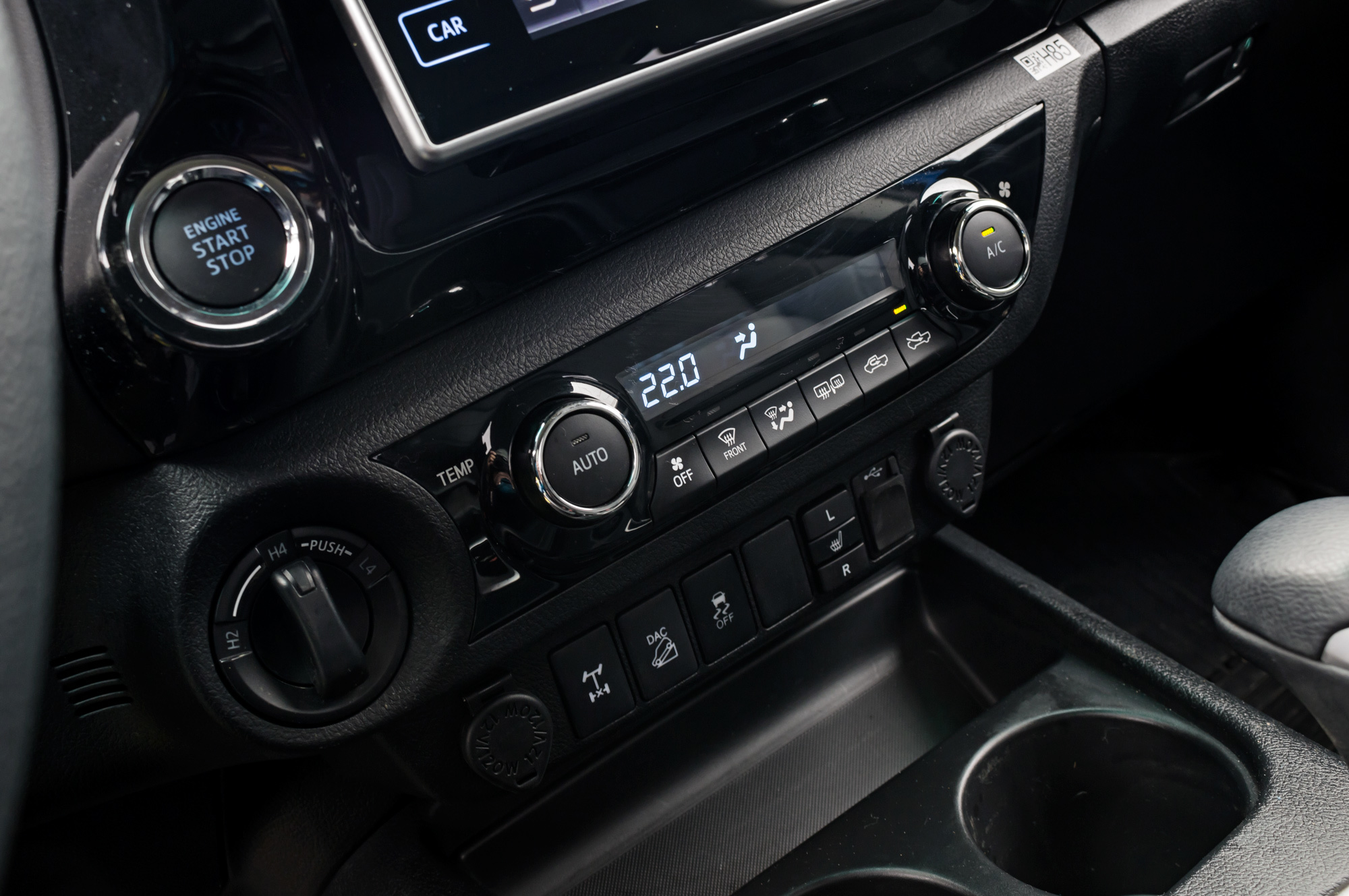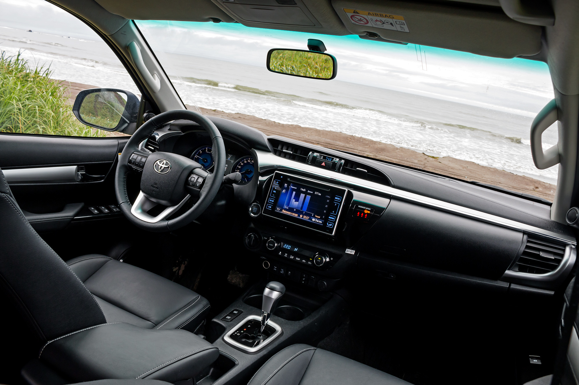 Интерьер — прям Hi, то бишь привет, lux! Пусть пластик не прожмёшь, но усыпанный кнопками руль теперь регулируется по вылету, на приборной панели цветной дисплей борткомпьютера, центральную консоль украшает семидюймовый тачскрин мультимедийной системы, а вместо рычага раздатки — вращающаяся рукоятка. Всё — в стремлении Тойоты обуниверсалить пикап, мол, хоть в грязи на нём, хоть в князи. Увеличены продольный и вертикальный диапазоны регулировки кресла водителя, растянутый вдоль и поперёк центральный подлокотник обзавёлся мягкой обивкой.