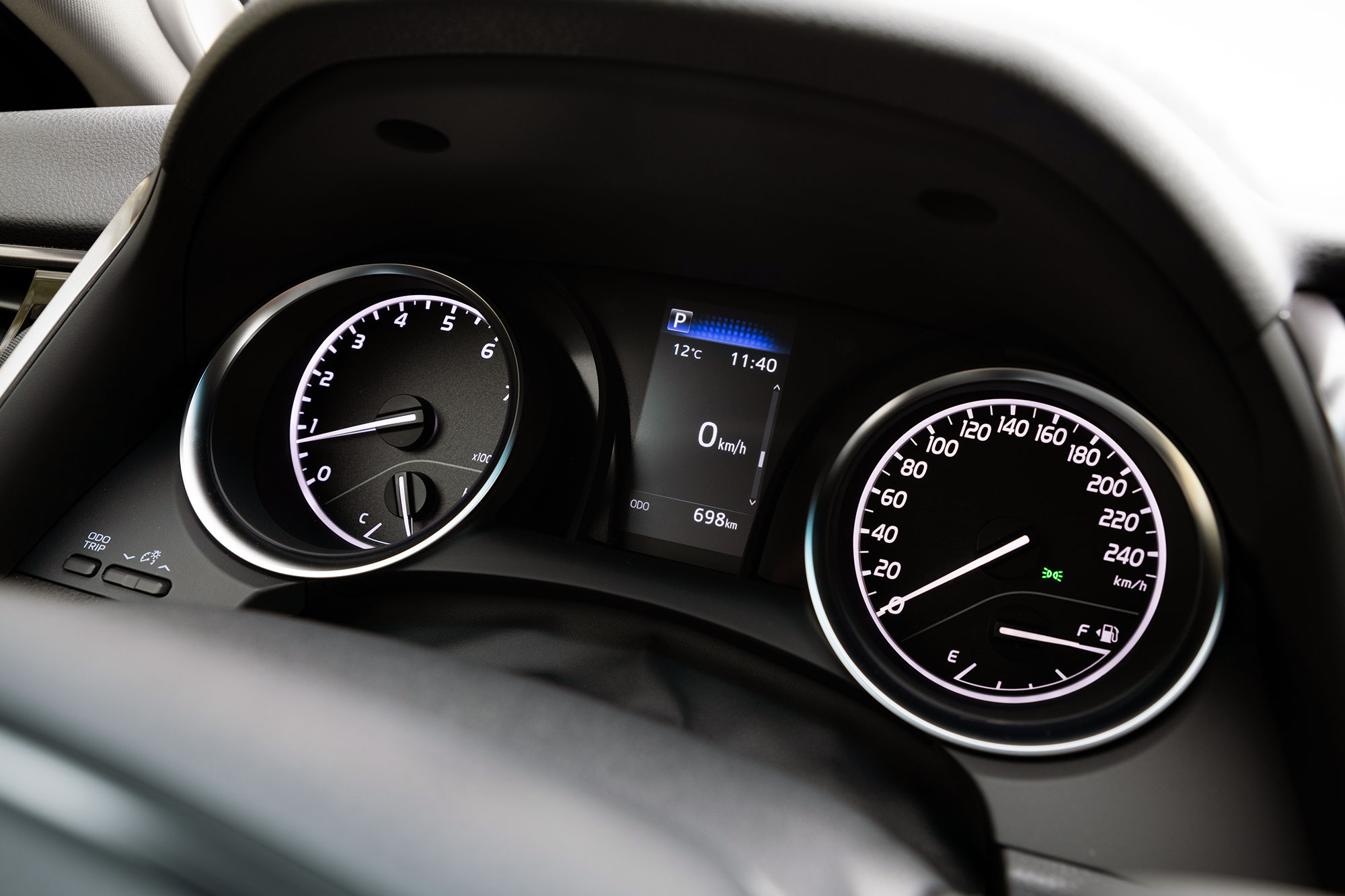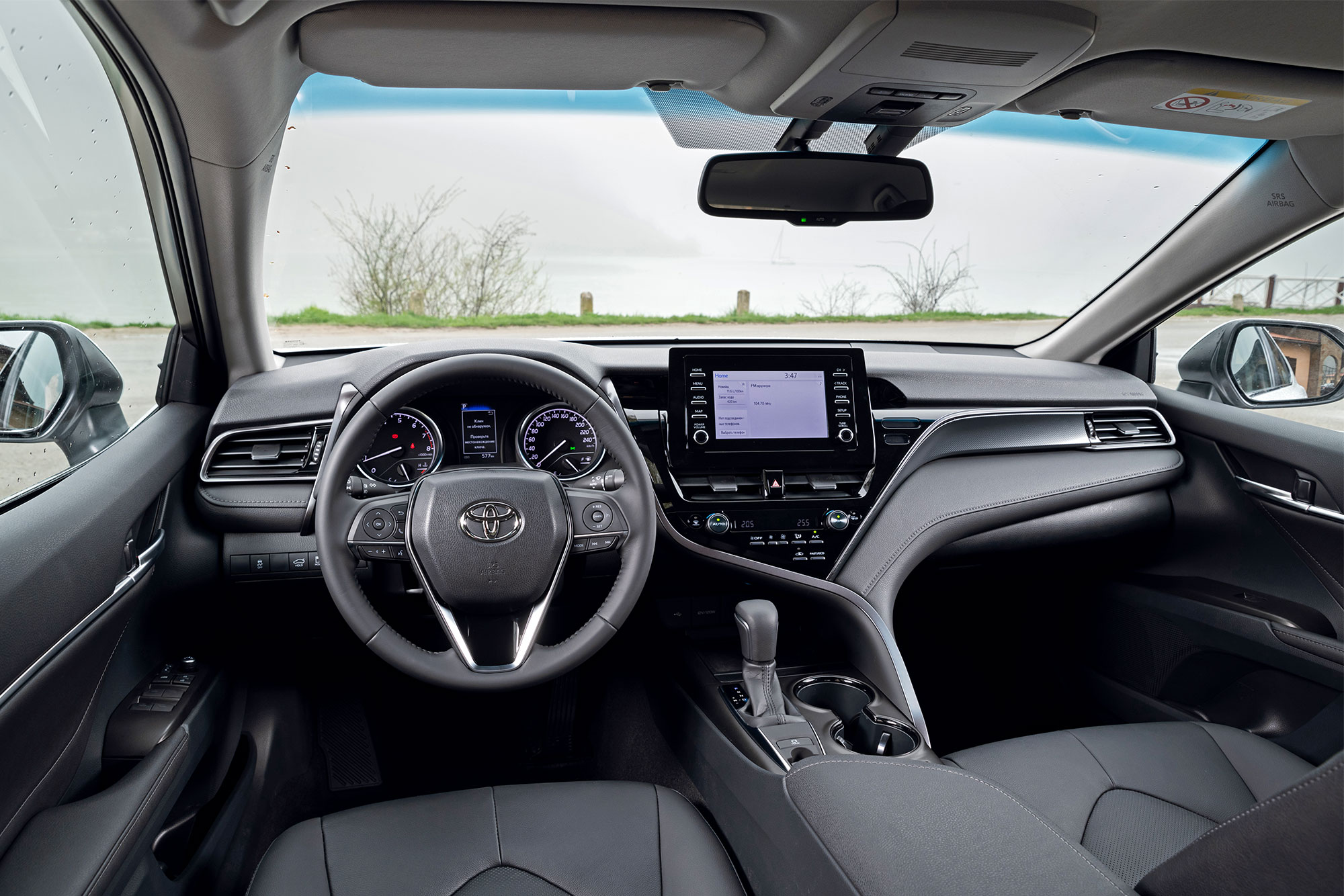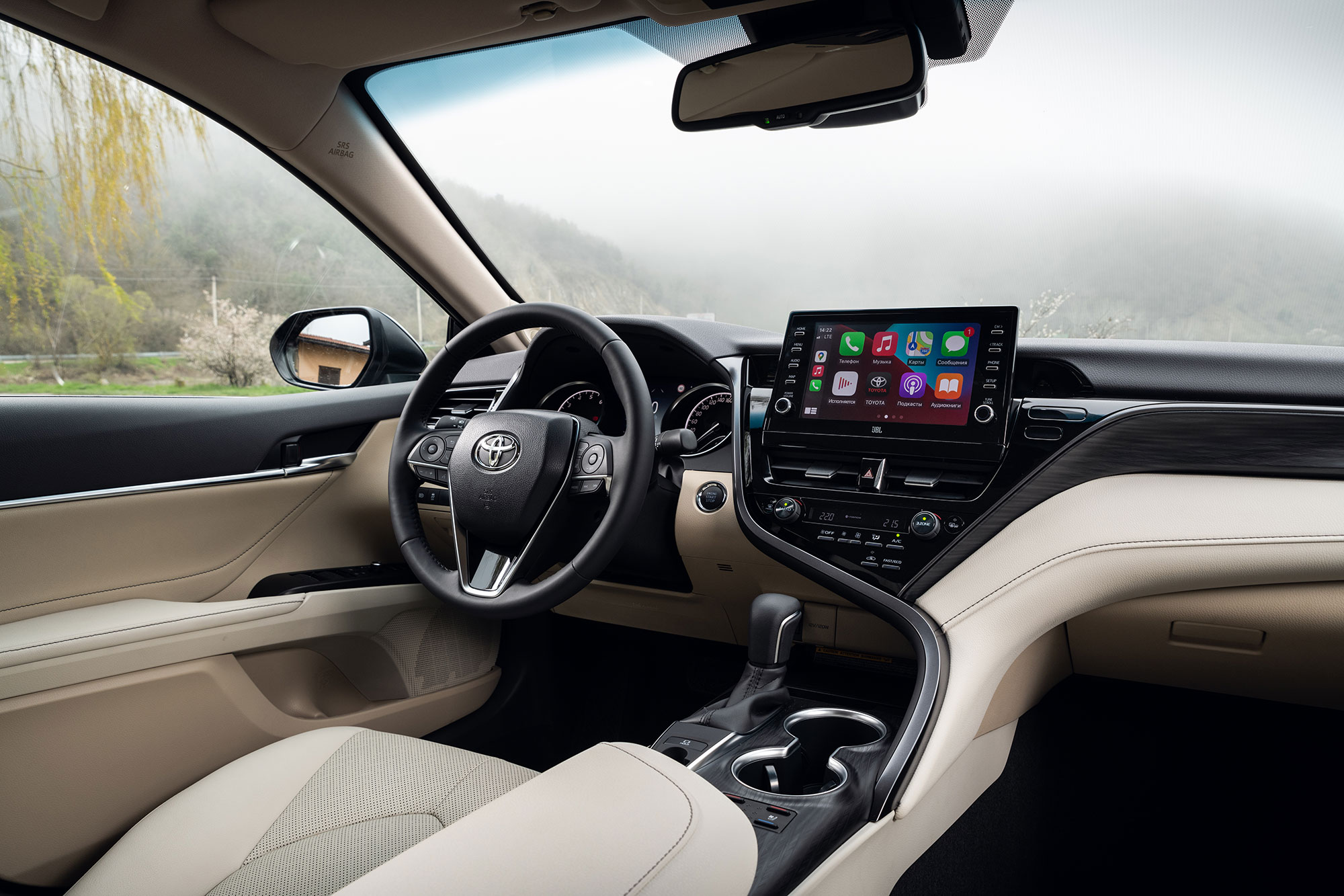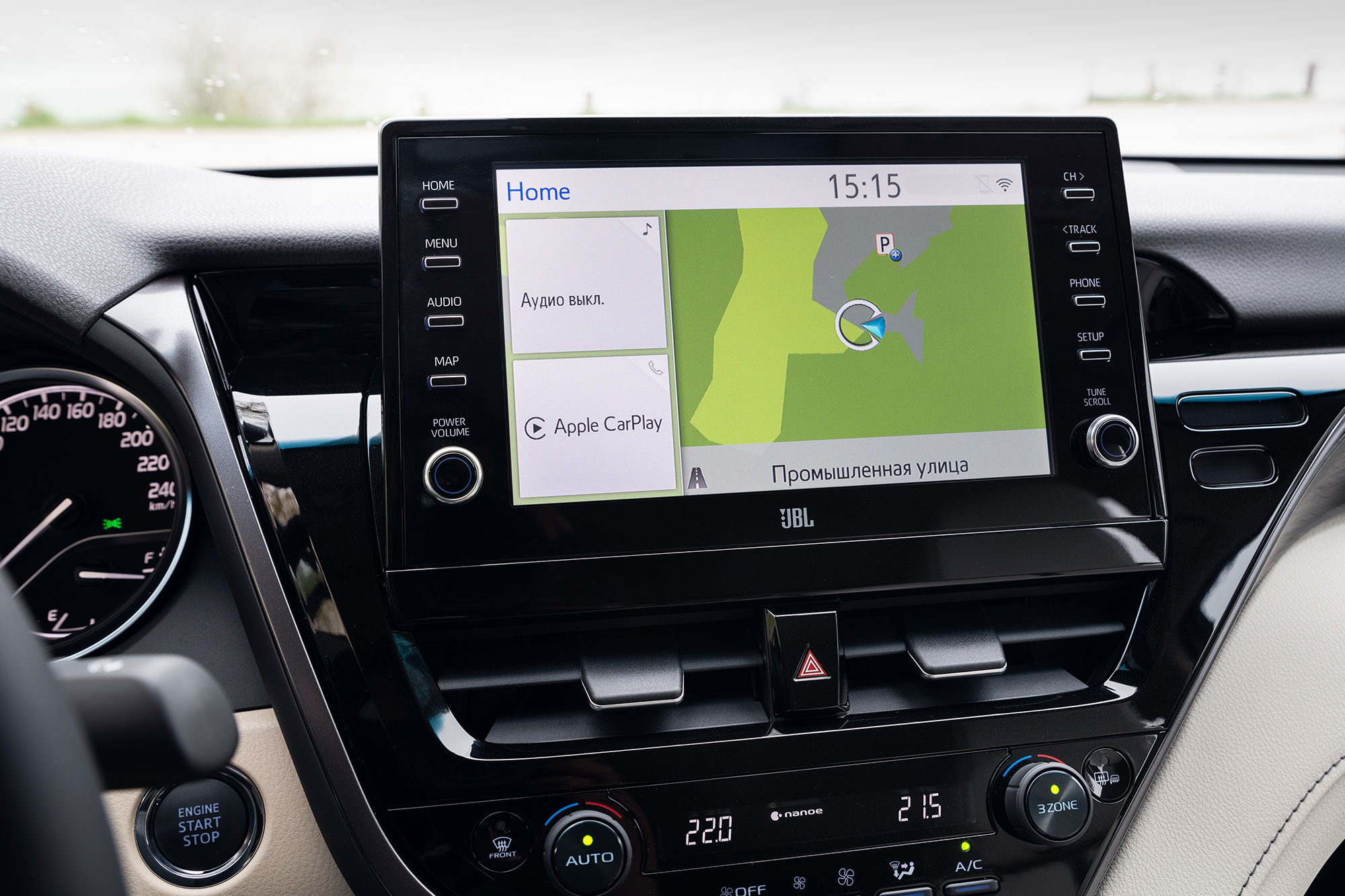 Радуют настоящие кнопки по бокам экрана, скорость отклика и поддержка протоколов Apple CarPlay/Android Auto. Графика штатных карт удручает, но Toyota надеется на подмогу ещё находящихся в разработке сервисов Яндекса. В остальном — перед нами досконально изученный просторный салон Camry с удобными креслами и хорошей обзорностью. По-прежнему оставляют желать лучшего графика на экране трипкомпьютера, расположение клавиш вокруг водителя и тактильные ощущения от взаимодействия с ними.